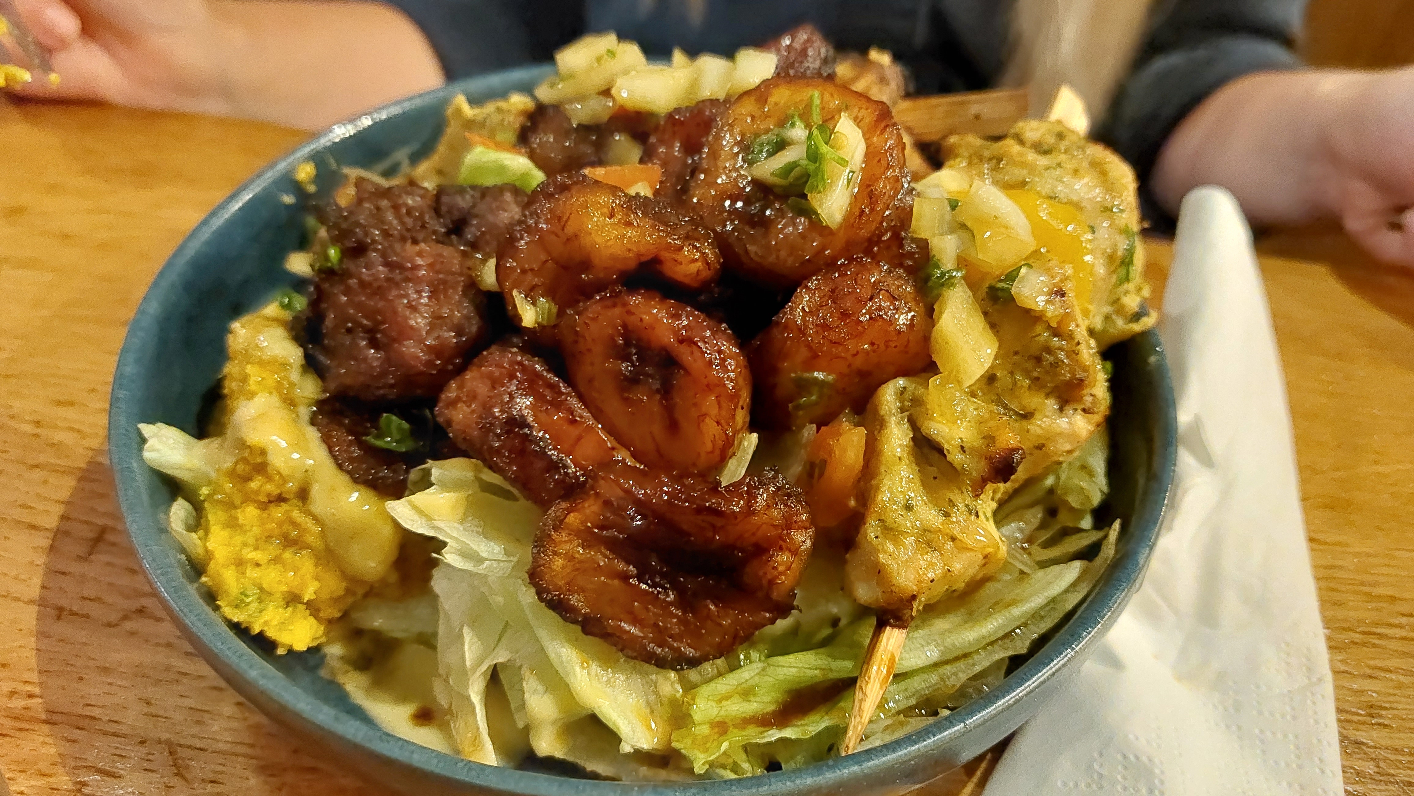 Délicieux plats dans un joli cadre ! Les salades sont rafraîchissantes et agréables en cette période de chaleur, tout en étant généreuses. Nous avons pris un Sweet Bouaké et un Durban Vegan Bowl , avec en plus une assiette d'alloco mais les salades étaient largement suffisantes. Hâte de revenir quand il fera plus frais pour les autres spécialités de la maison !