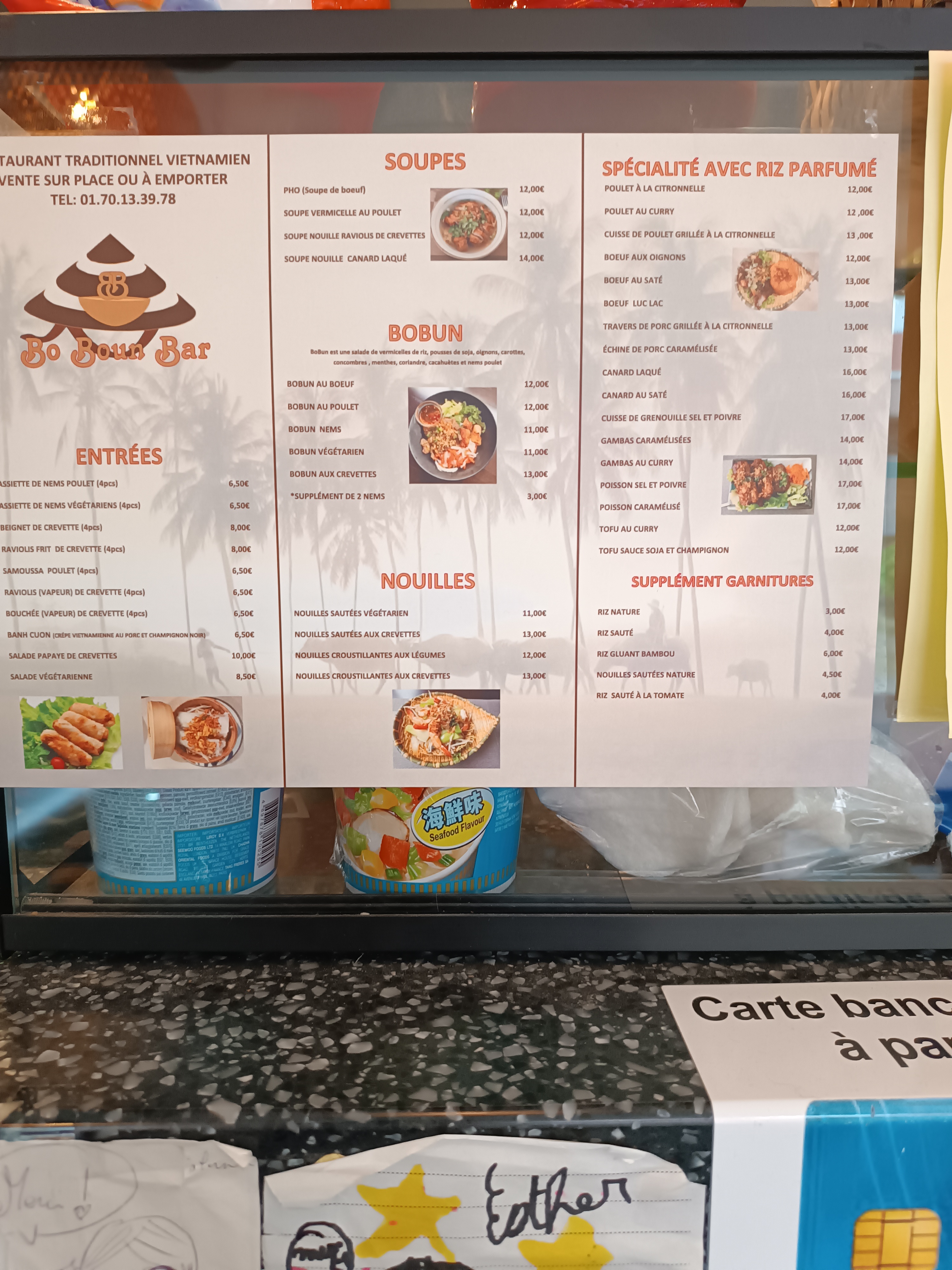 Bonjour Nous avons commandé 1 bobun et des pâtes croquantes aux crevettes = 24 € La nourriture est satisfaisante mais sans plus ! Le prix je Vous laisse juger . Dommage pas de menu du midi ….