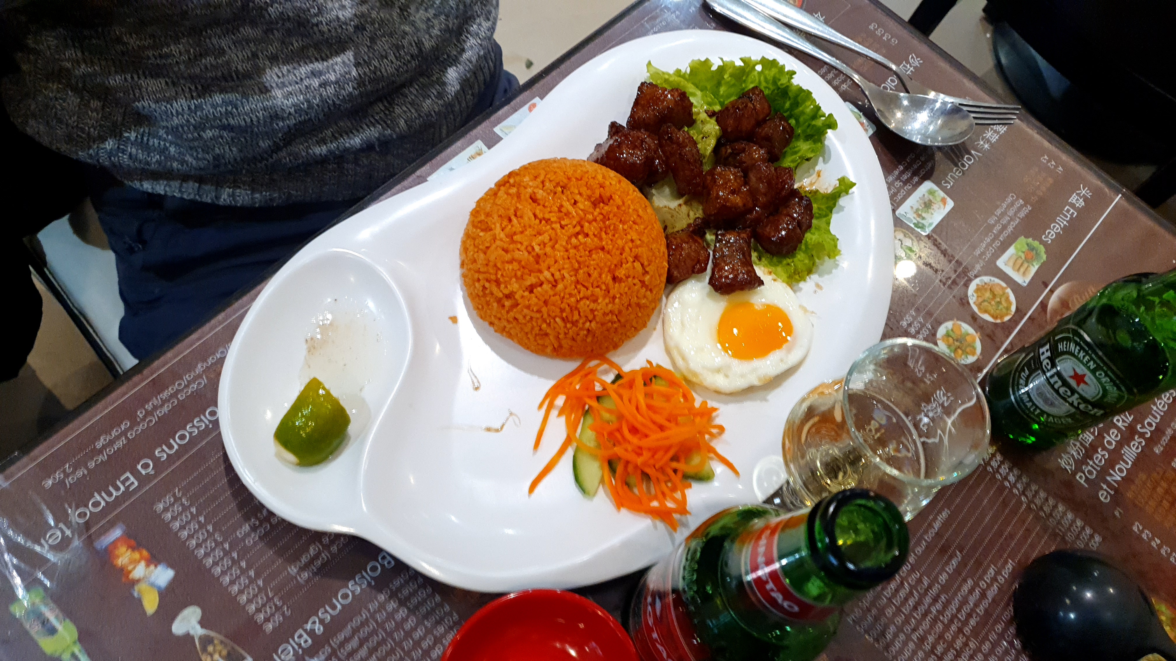 On a pris 2 bœuf loc lac et 2 boissons aux 3 couleurs. Bœuf très bon, bien assaisonné, le riz est très sec et pas beaucoup de goût. La boisson aux 3 couleurs très bien, avec du lait de coco pas trop sucré