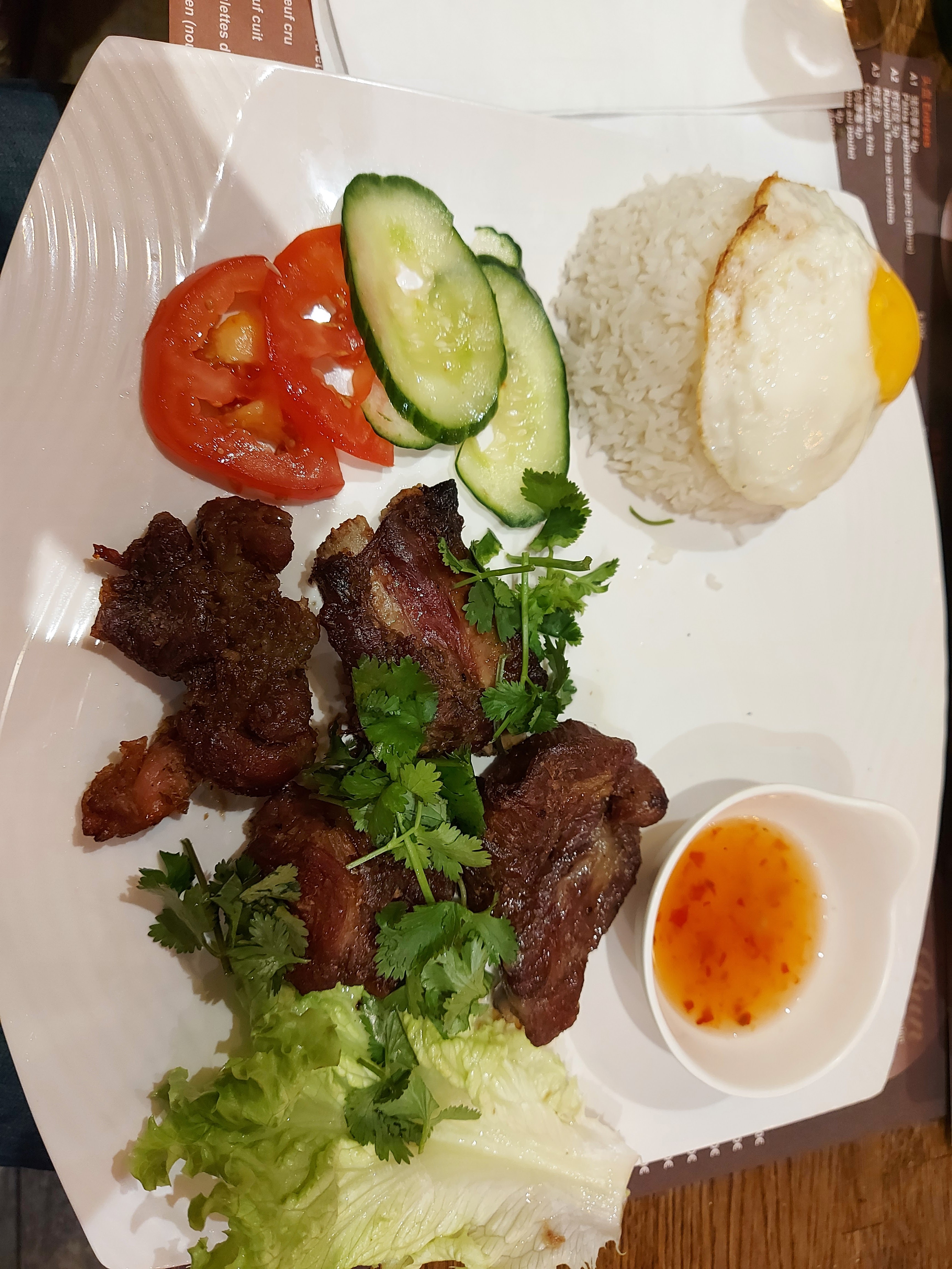 Pour ma première visite, j'ai essayé le riz au bœuf loc lac , j'adore ce plat mais j'ai du mal à en trouver de bons, celui-ci était très bien (viande, riz) , je reviendrai y tester d'autres plats.