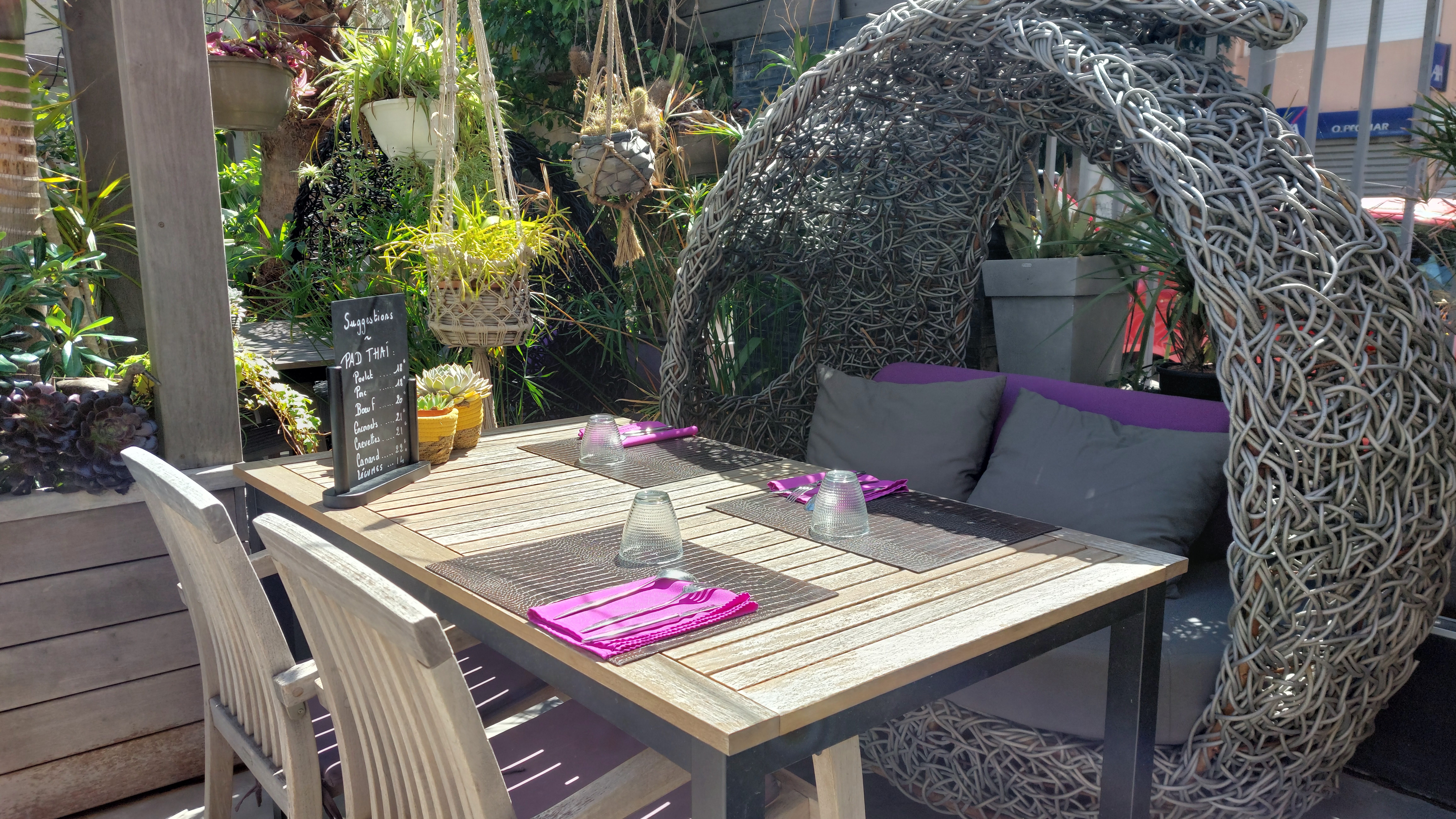 Magnifique terrasse qui vous transporte en Thaïlande dès passé le seuil. La cuisine y est pleine de saveur et de parfum de Thaïlande. Un vrai délice . De plus le service y est fort sympathique.
