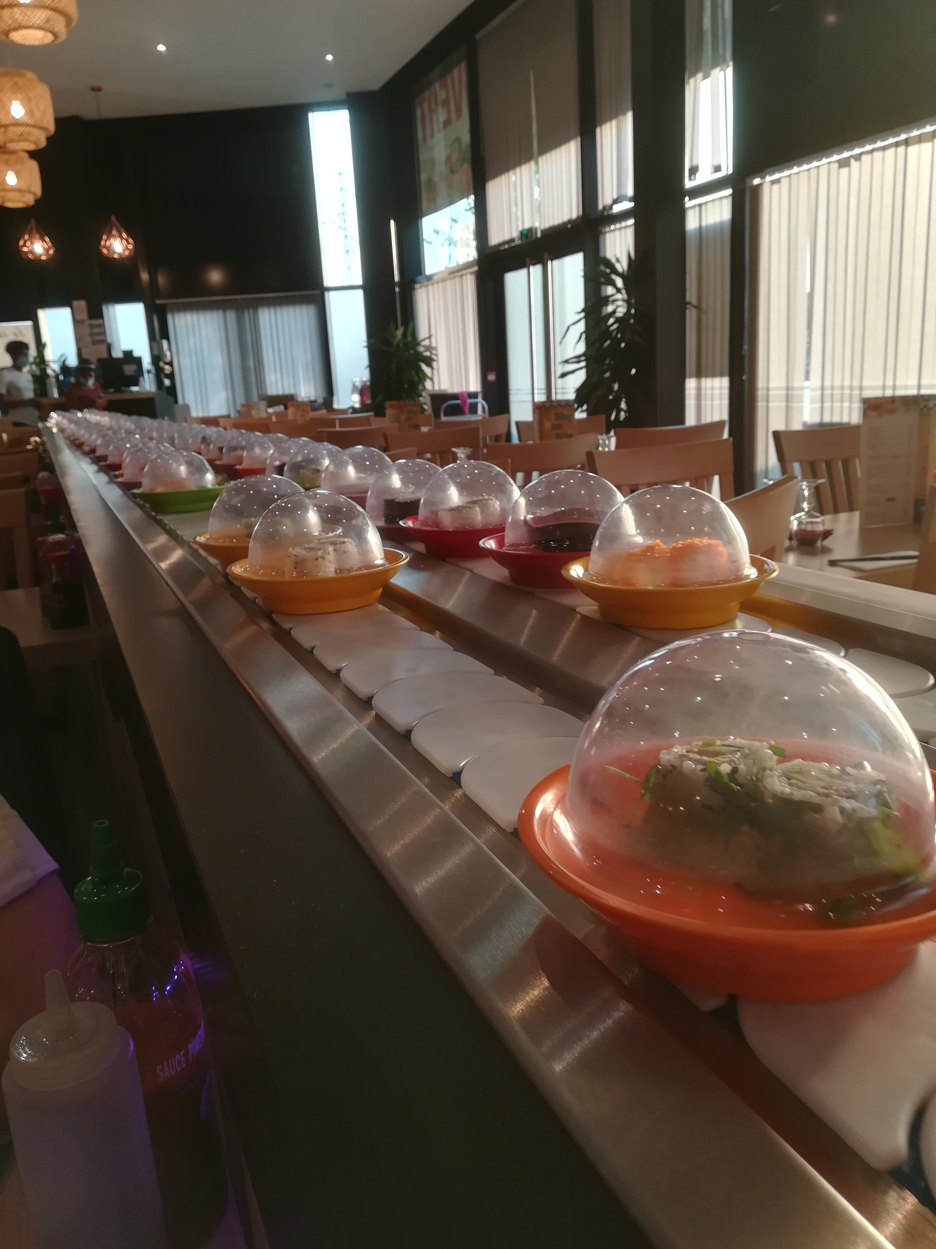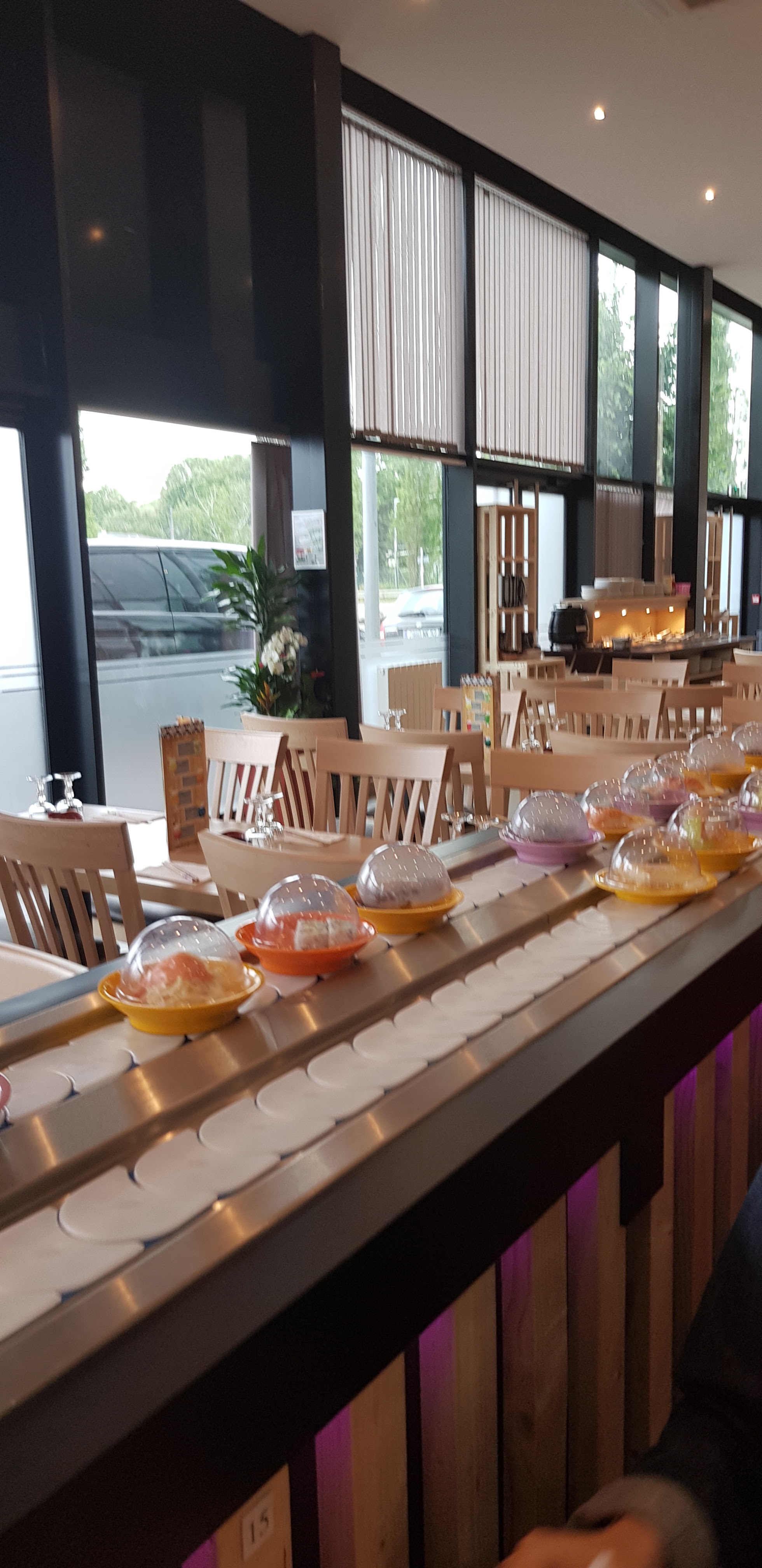 Le concept est intéressant avec le tapis roulant qui jouxte les tables et où sont disposés les sushis, sashimis, brochettes et desserts, dans de petits plats couverts par un couvercle façon bulle. Facile à intercepter ce que vous désirez manger, sans oublier le buffet pour les plats chauds et condiments au fond de la salle ! Le personnel est très gentil et souriant, la salle est agréable et il y a suffisamment de place pour circuler sans se bousculer ! Les produits sont frais (sauf peut être certains desserts) et préparés le jour même 👍
