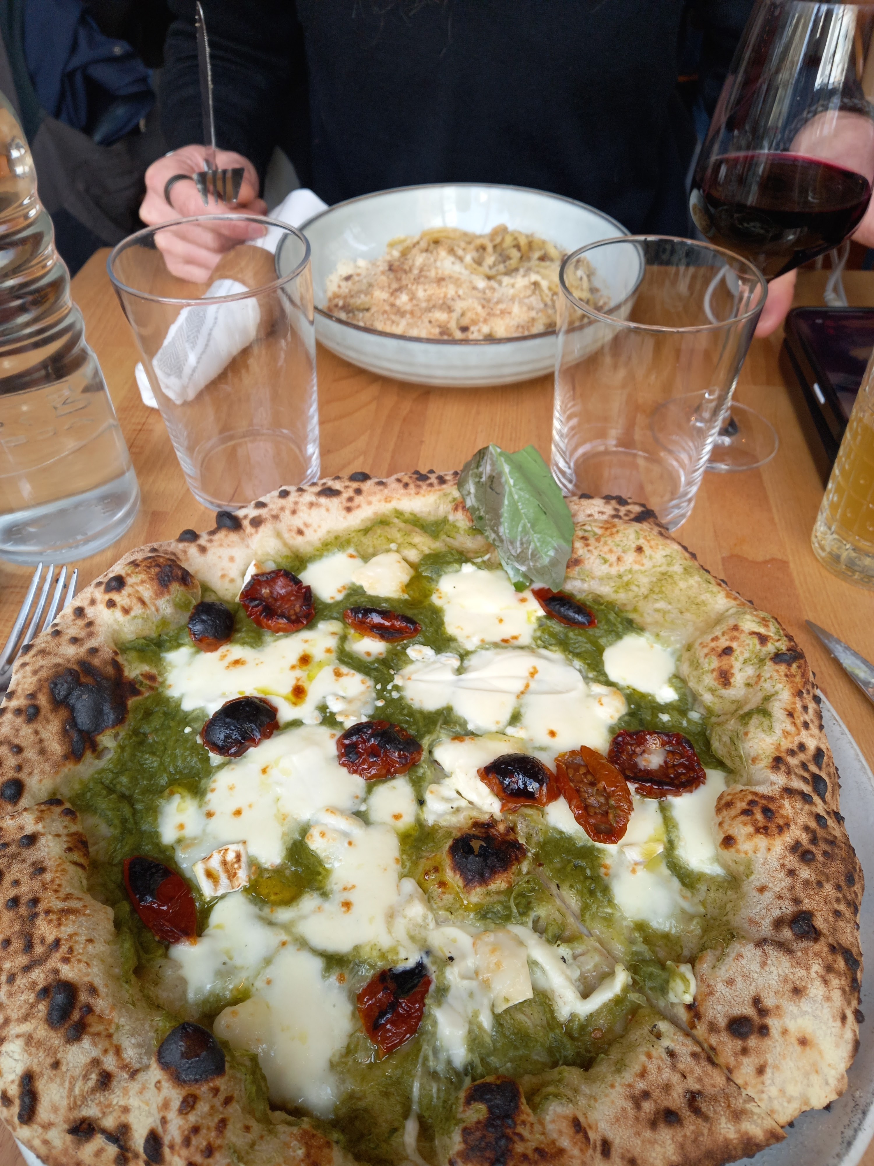 Diner avec un groupe de 8 hyper bruyant dans le petit coin à droite.. dommage, on s'entendait pas parler à 2. Provola in carozza intéressant même si panure un peu trop épaisse à mon goût. Il nous restait de l'appétit pour la pasta. Je l'aurais appréciée bcp plus chaude mais les saveurs du Claudio's pesto étaient très originales. Je reviendrai gouter les pizze !