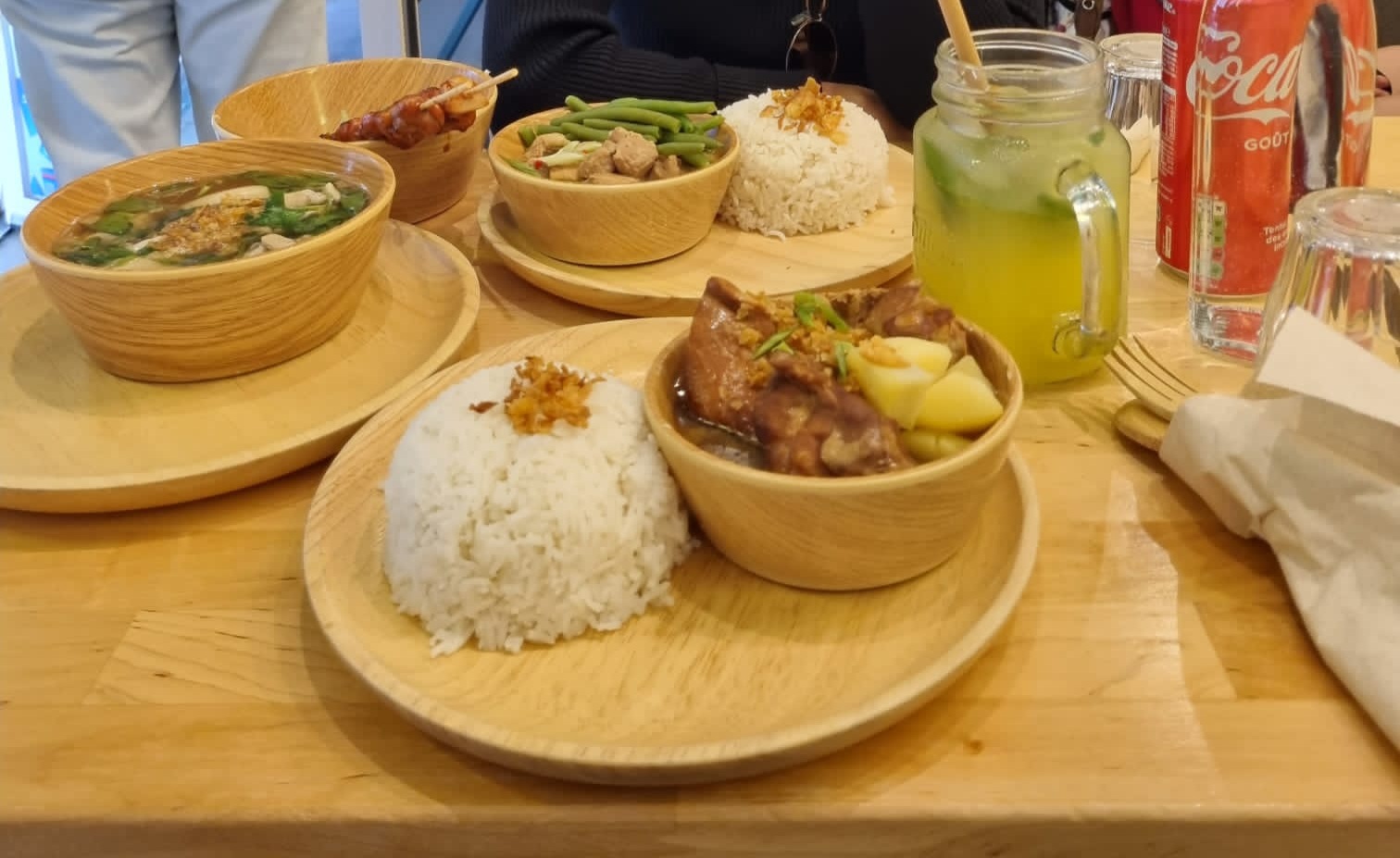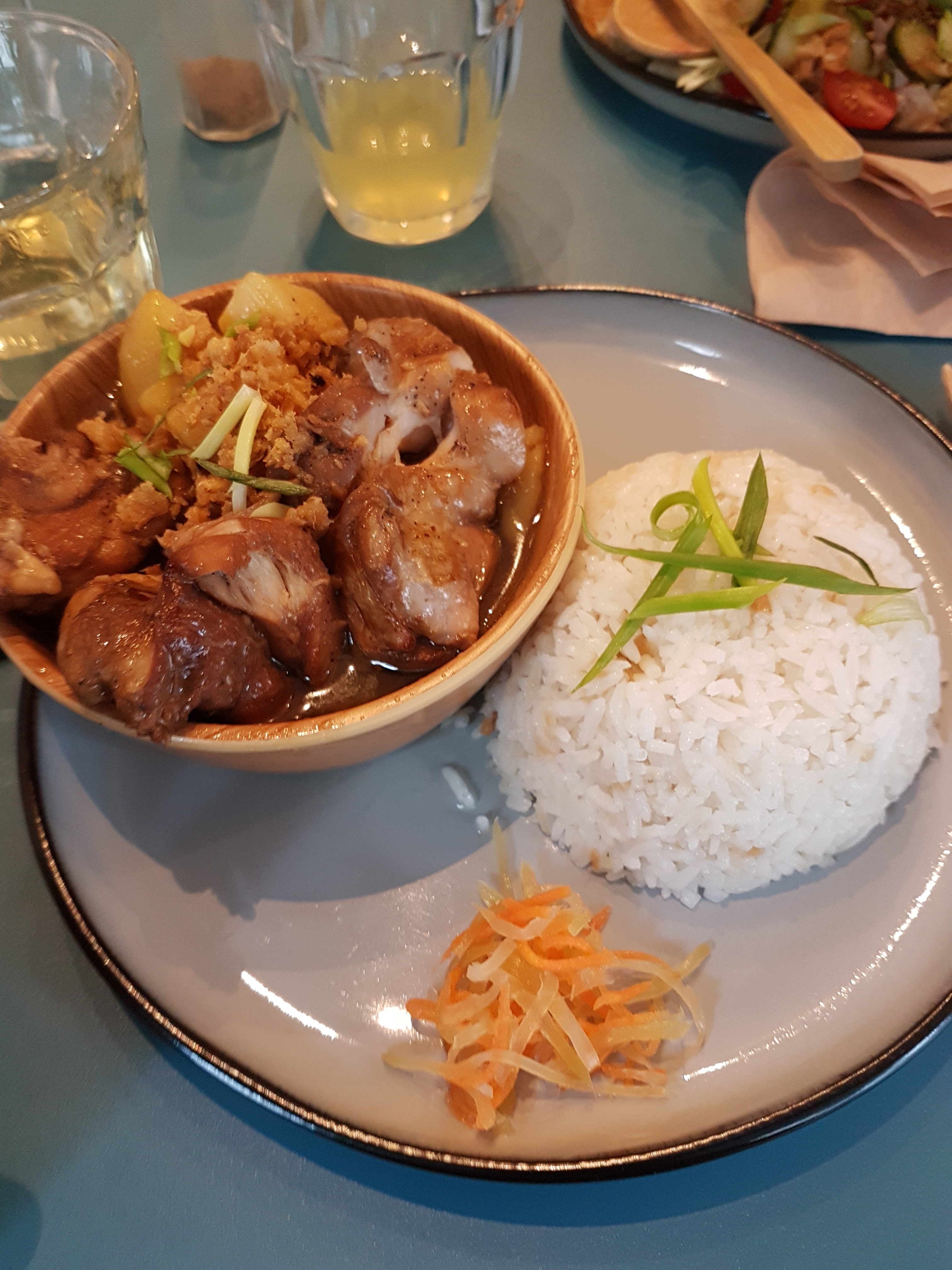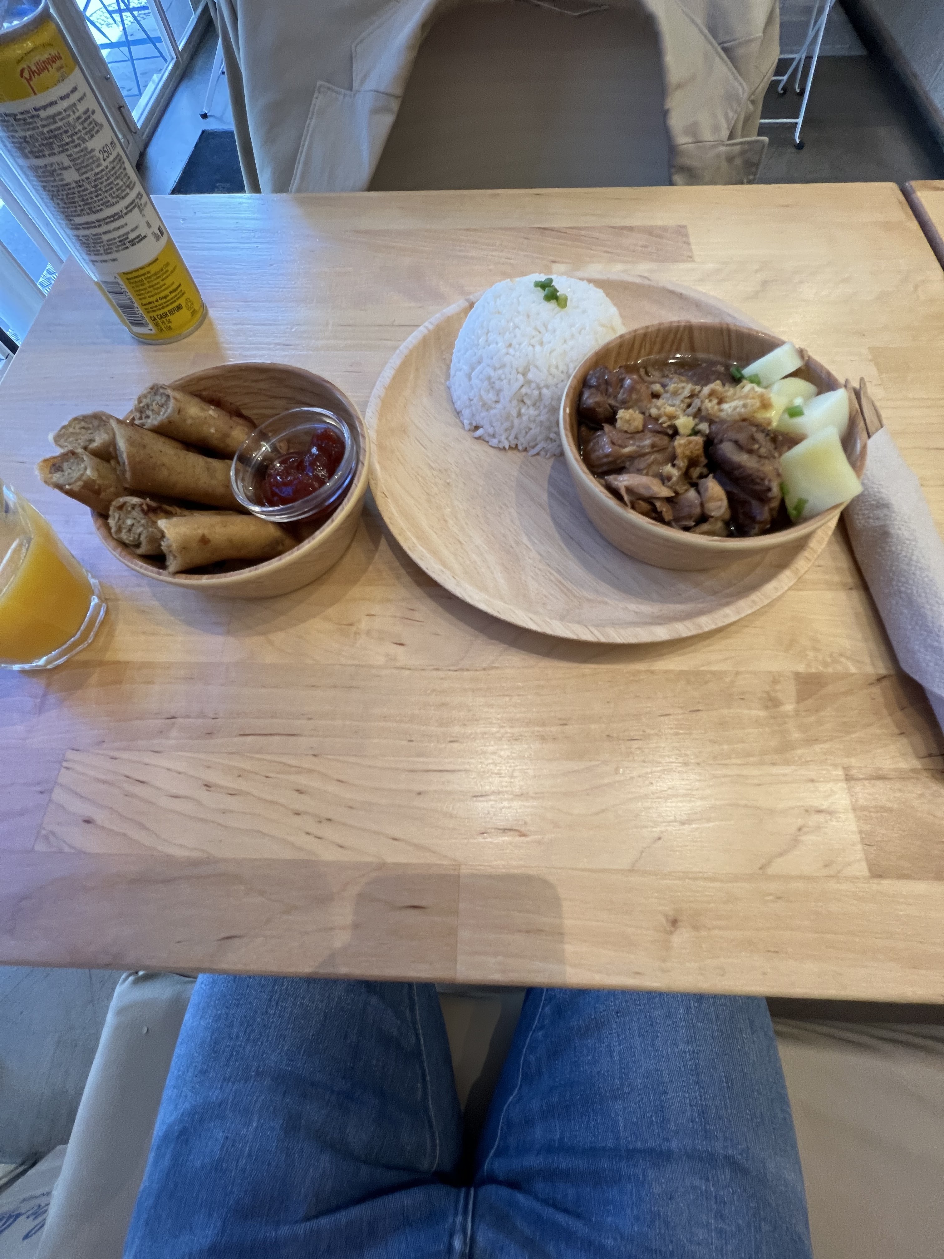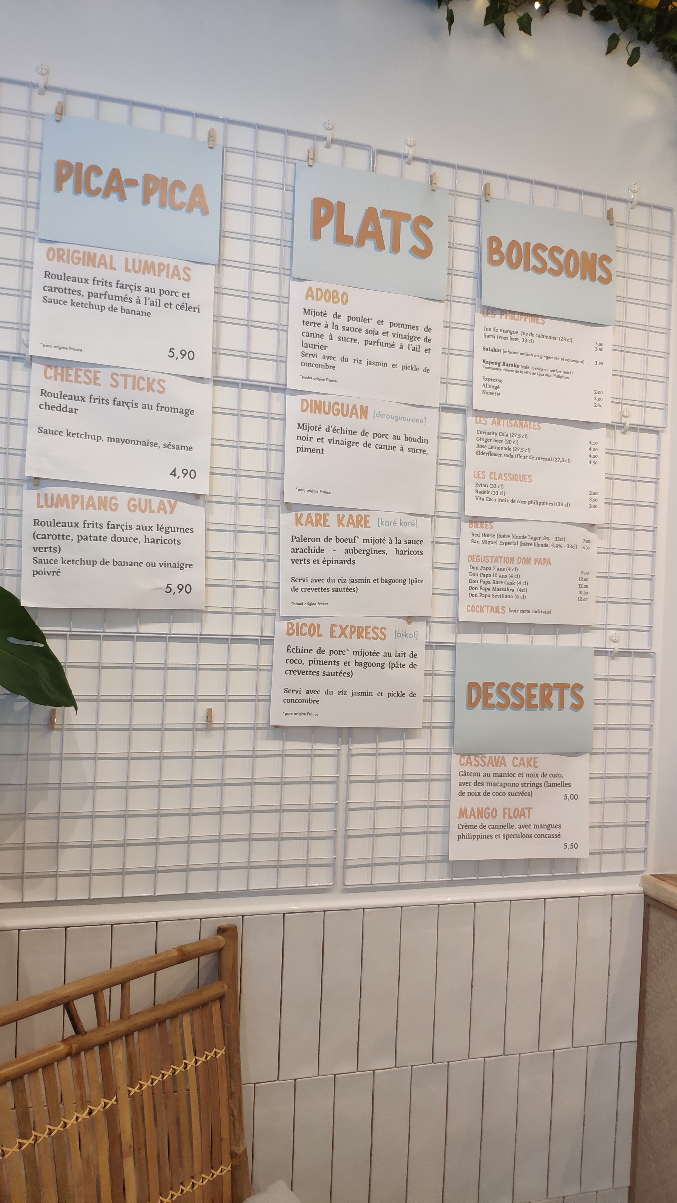 Super. Il faut y aller. L’adobo est vraiment à couper le souffle. Du poulet qui s’effiloche comme du porc confit. Une sauce adobo délicieuse qui évite le trop salé ou vinaigré, elle est parfaitement équilibrée. Le plat de porc/cacahuètes/coco également très bon. Boisson maison avec agrume du pays intéressant. Cheesy sticks cheddar un peu hors sujet mais OK. Dessert pate de riz/caramel très sucrée mais OK. Mais tout simplement pour les plats, et surtout l’adobo, à 13 euros 50 en formule midi, ça en vaut indéniablement le coup.