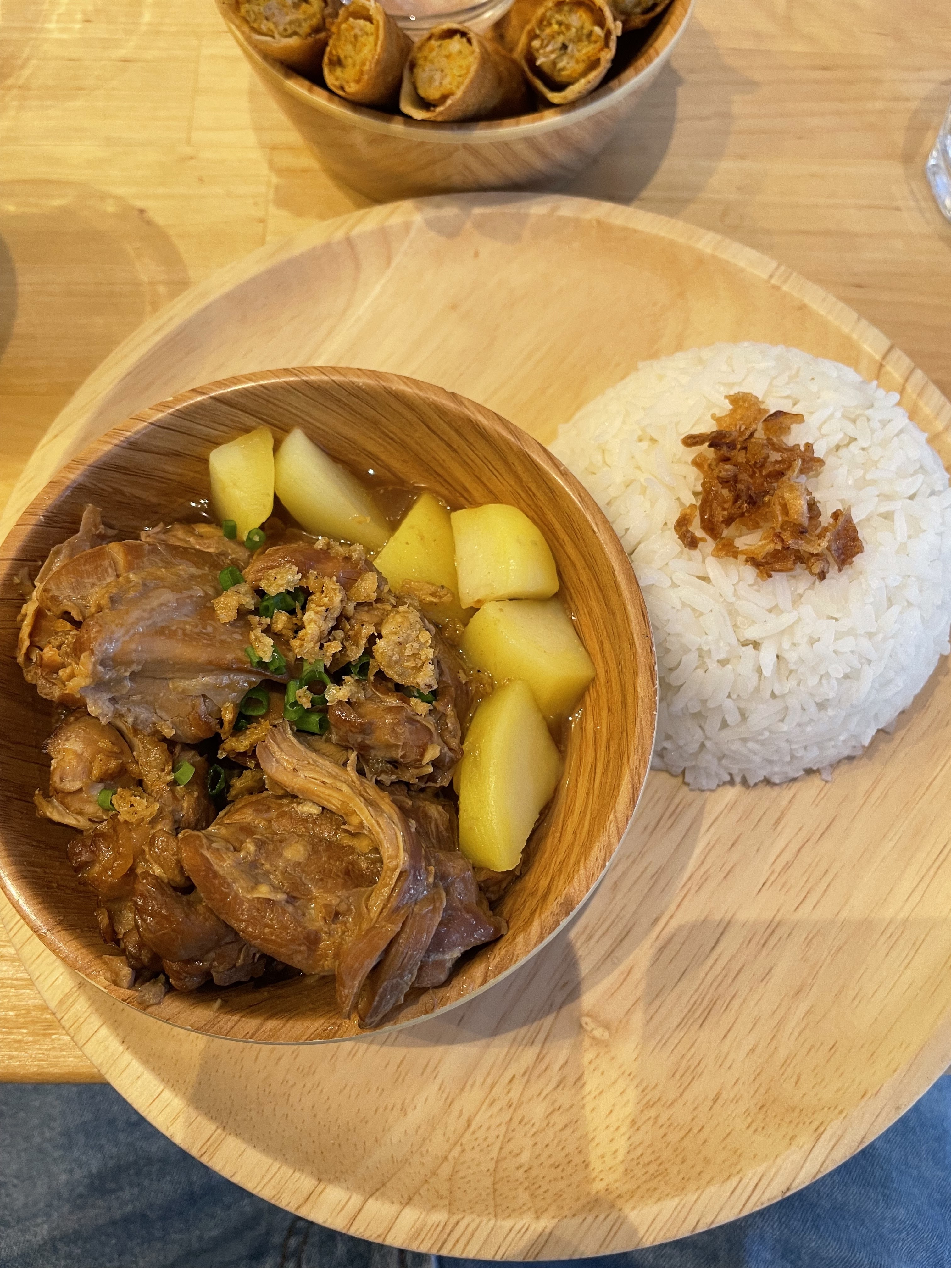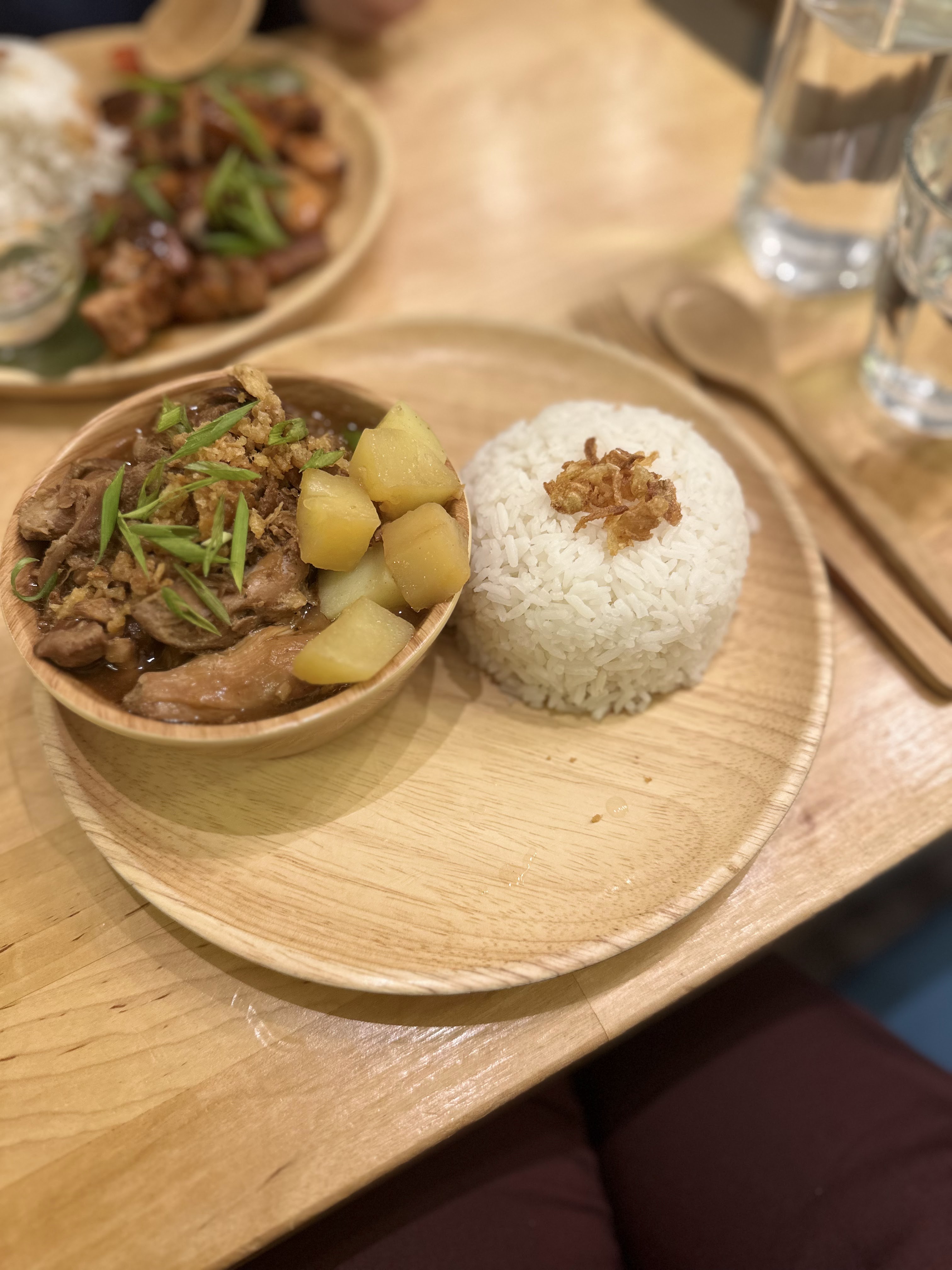 ❝ Cuisses de poulet braisé adobo et ragoût kare kare servis dans une brasserie philippine élégante et tendance avec terrasse côté rue. ❞