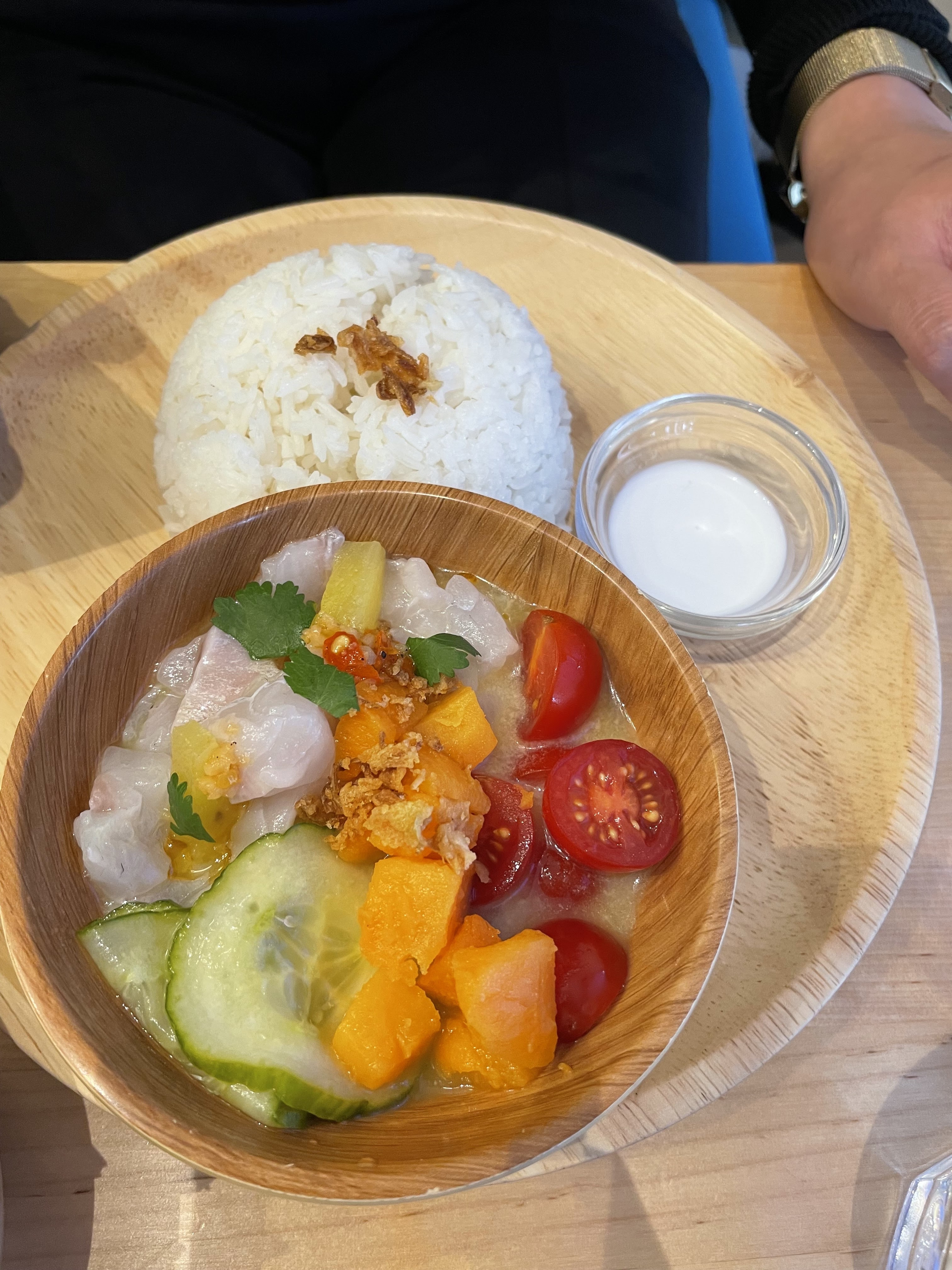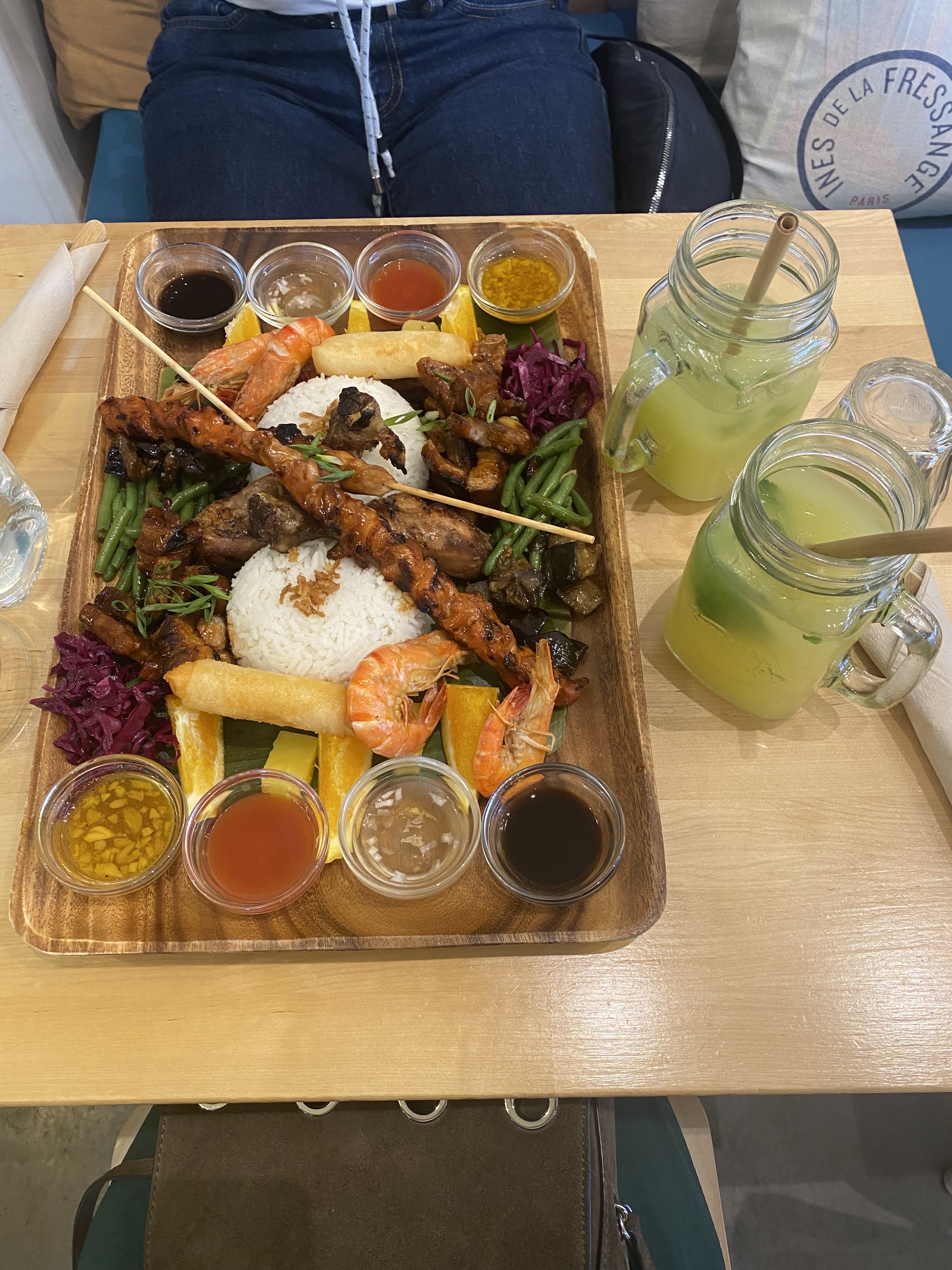 Je ai pris le sorte de ceviche philippin et j’avoue que j’ai été déçue. C’est assez acide (et vinaigré ?) et ça ne laisse pas de goût en bouche. Je pensais que la daurade aurait mijoté dans le lait de coco mais non. Après peut-être que je n’ai pas pris le bon plat ? Le riz est très bon en tout cas. Il faut savoir que les grillages ne sont dispo que le soir. Sinon à dire pour le service et le lieu, ça allait.