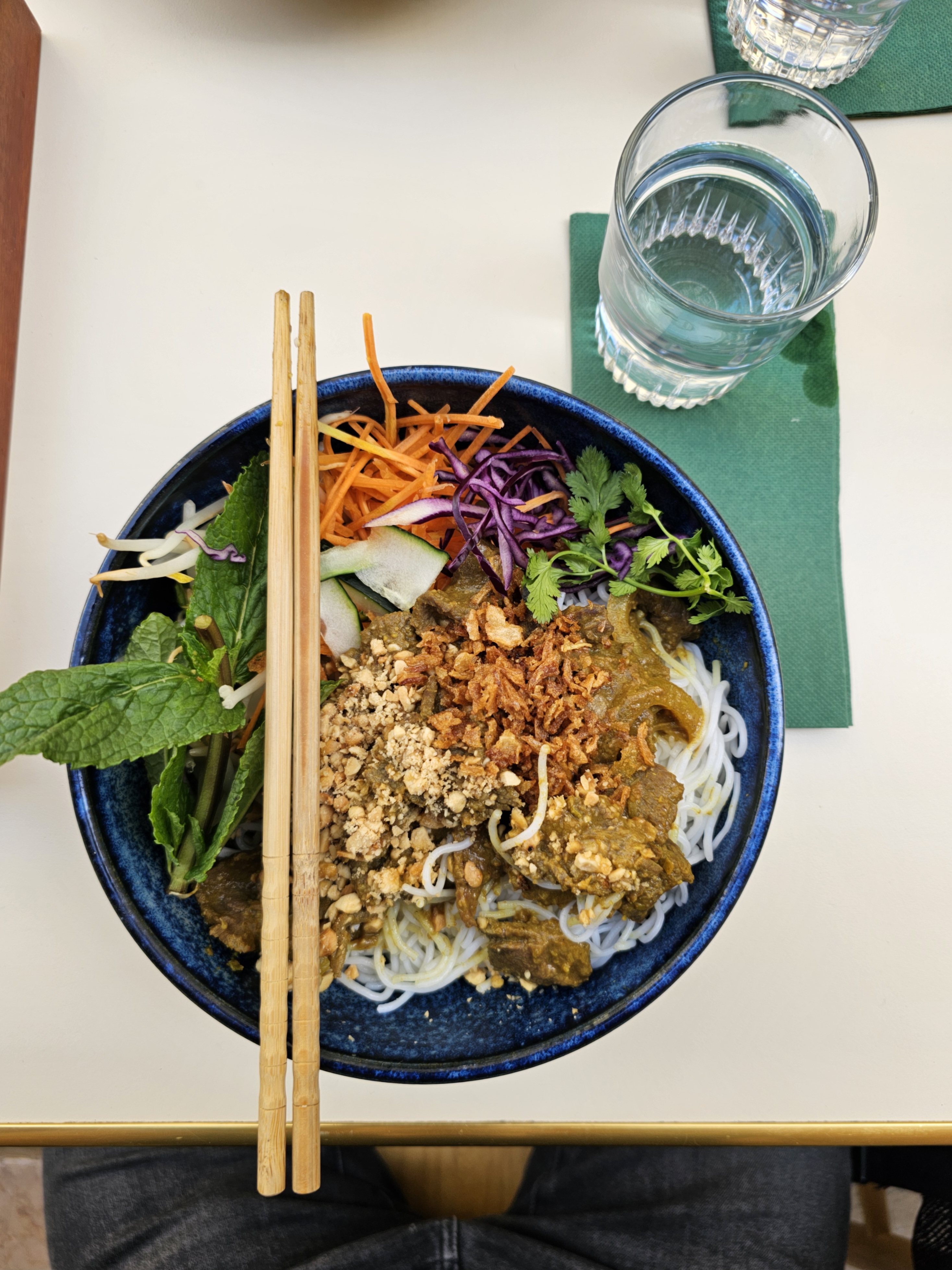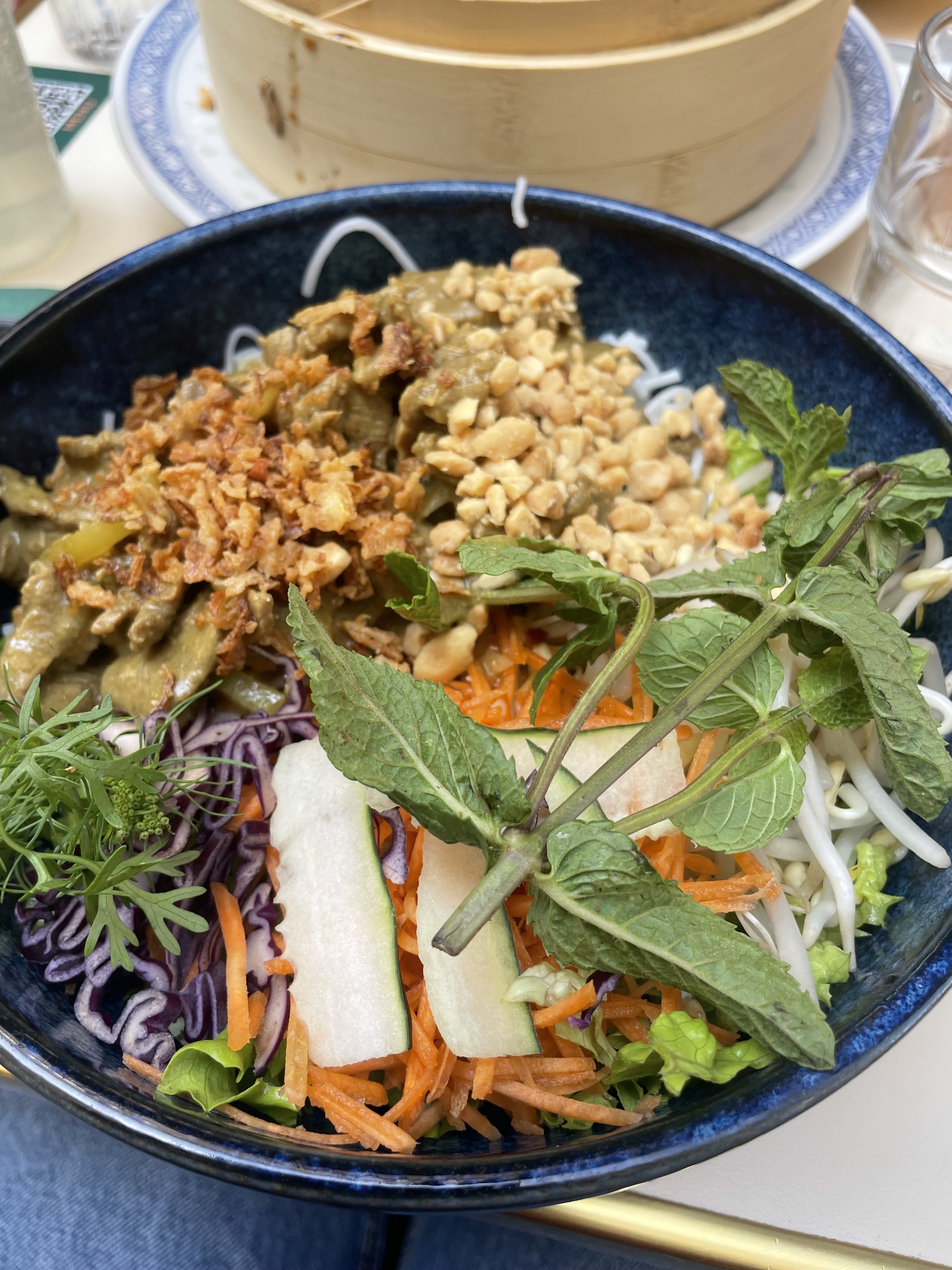 un bon grand bol rempli de pousses, diverses crudités, du bœuf sauce curry et quelques herbes comme la menthe et la coriandre. bon et bon, peut-être pas trop savoureux mais toujours savoureux et satisfaisant. quatorze euros.