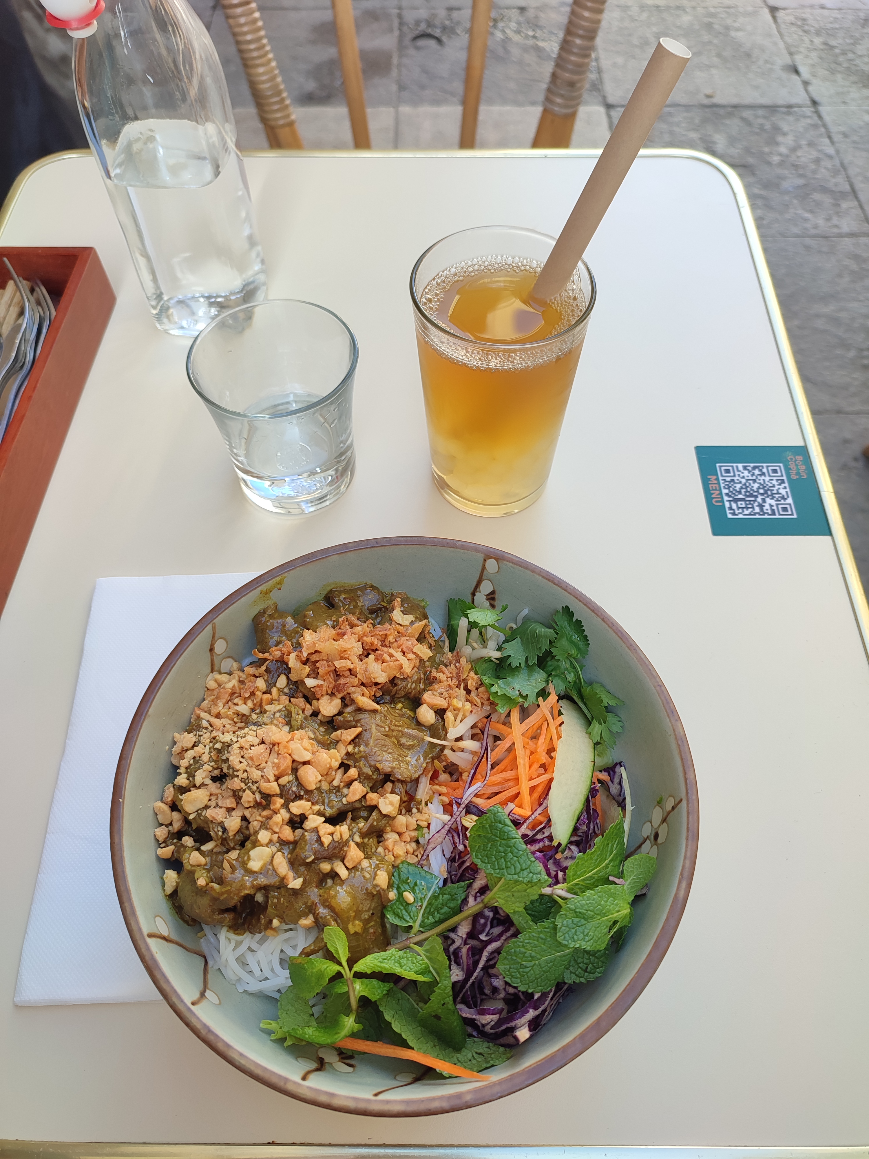 J'ai adoré ce petit endroit. J'avais des vermicelles végétariennes. J'ai mangé ce plat VN partout dans le monde et BoBun Caphe a fait le meilleur Bun que j'ai jamais mangé ! Y compris en VN ! Le propriétaire nous a donné de bons conseils sur les endroits à essayer pour dîner en Provence. Nous avons également eu une bonne conversation avec son père. J'ai adoré l'ambiance extérieure de ce café. Si vous êtes n'importe où en Provence ou à Nîmes, essayez-les !