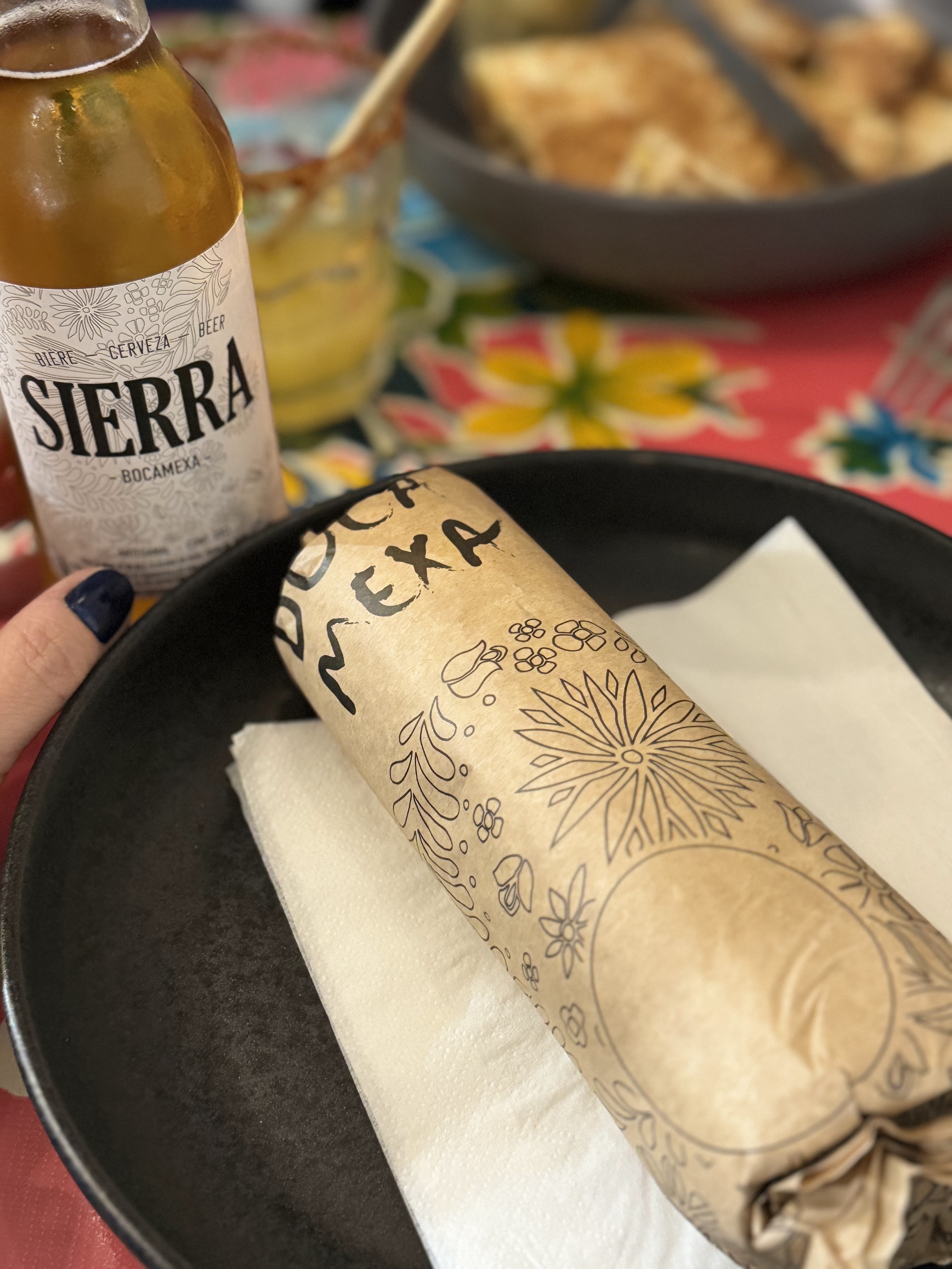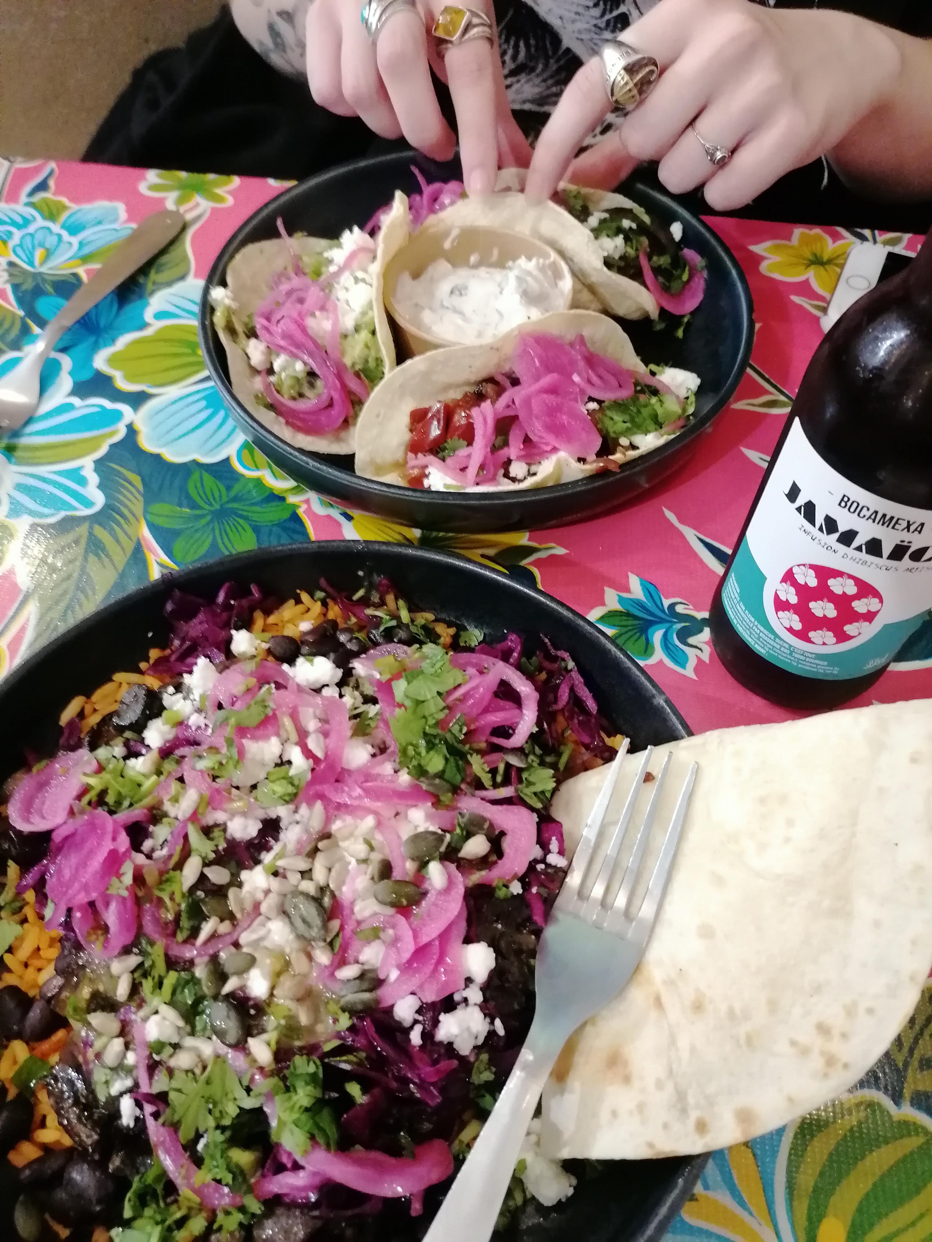 A force de passer devant j'ai eu envie de tester Bocamexa. Un peu de queue ce soir là, comme d'habitude j'imagine, mais le staff est hyper réactif et ça va très vite. Par contre c'était un peu compliqué de comprendre où commander (devant les cuisines) et où payer (à l'accueil), ça serait chouette à l'avenir de mieux l'indiquer pour arranger tout le monde. Beaucoup de choix en terme de tacos / quesadillas et je sais plus trop quoi, pour tout les goûts, sachant que tu peux facilement pimper ton plat. J'ai donc pris un burrito vegan énooorme et rempli de bonnes choses (comme des haricots rouge !), une bière mexicanos et des tacos au cheddar (on change pas les vieilles habitudes). Bref c'était bon, très copieux - et vraiment bon -, mais pas très photogénique malheureusement. Mon mec a également validé, donc à refaire !