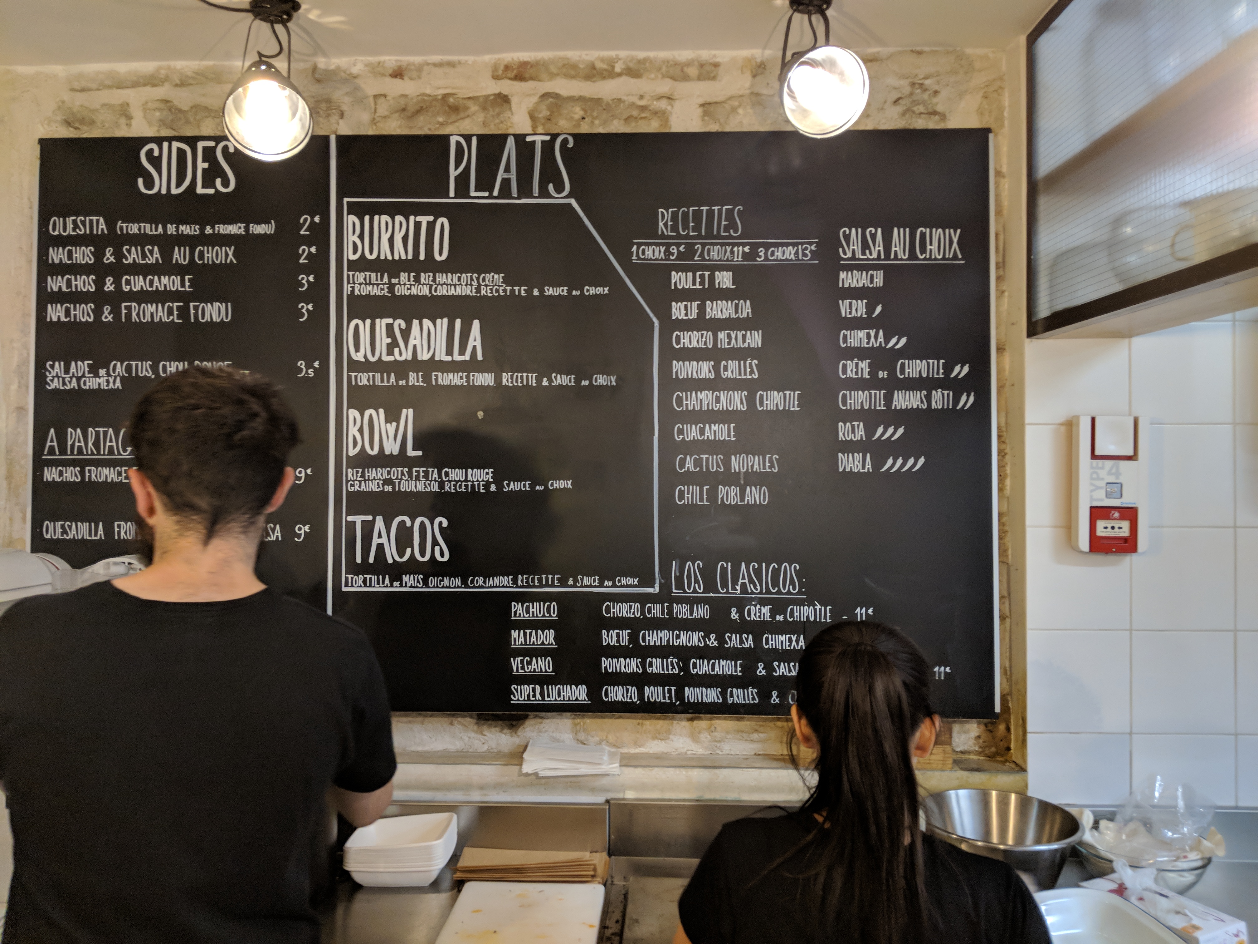 Aux choix burritos, tacos et quesadillas ! Produits frais préparés sur place, bonne qualité des produits. Rapide. 2-3 crafts beers. Sur la table juste de l'huile d'olive piquante mais c'eut été cool d'avoir à dispo un genre de salsa habanero à dispo !