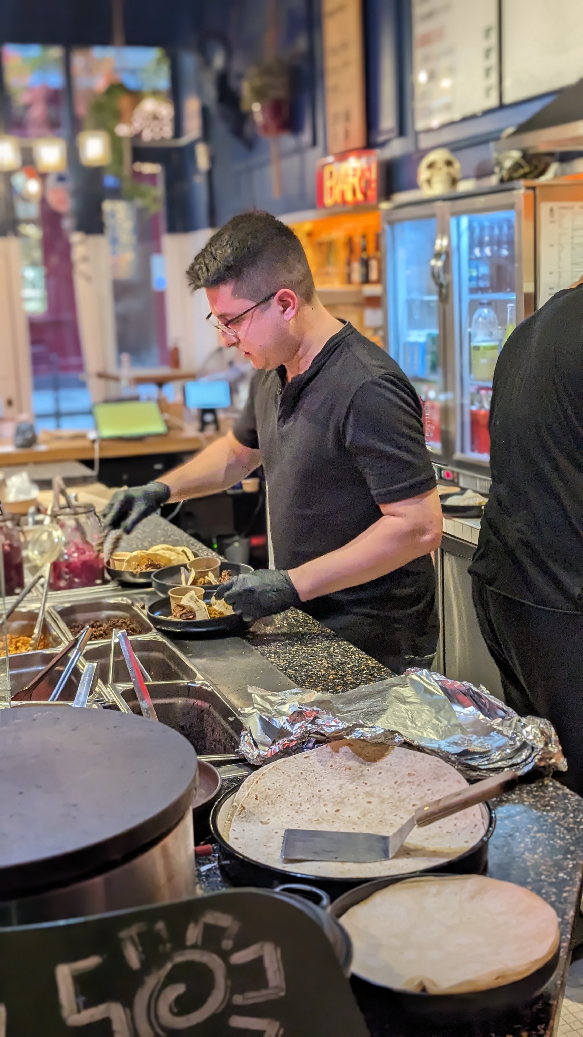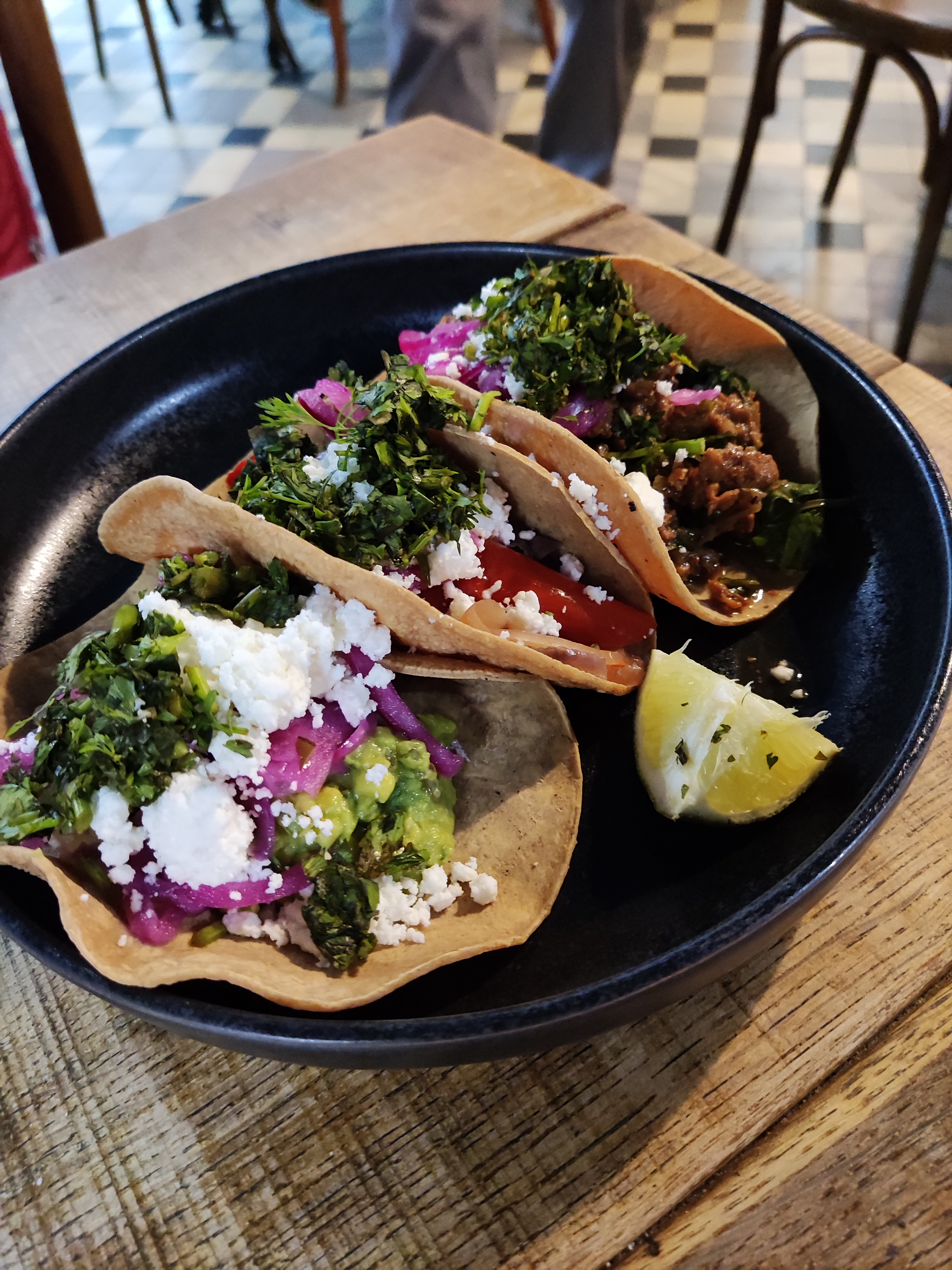 Une seule ligne : évitez cet endroit « mexicain » sans inspiration et mal géré pour l'une des meilleures options à proximité. Dîné vers 21h00. Il n'y avait aucune indication claire de l'endroit où commander et personne pour nous le dire. Ils étaient à court de tout même s'il leur restait quelques heures de service, notamment de la coriandre, du poulet et des margaritas. Les tacos sont accompagnés d'une salsa pour les trois ; vous n'avez pas de chance si vous cherchez une salsa différente pour différentes garnitures comme au Mexique. Les prix étaient corrects pour Paris. (Pas les prix au Mexique, mais je comprends.) Toutes les garnitures : Barbacoa, « Chorizo » qui était juste du porc haché avec des épices et non du vrai chorizo, et des champignons – ils avaient tous le même goût. Les portions étaient correctes. La musique était bonne. Le personnel trilingue était un plus ! Edité pour ajouter : Ils nous ont expulsés ! Nous avions fini de manger et de finir nos boissons lorsque nous avons été informés de leur fermeture (à 22h00, une heure plus tôt que prévu). Personne ne nous l’a dit auparavant. Nous aurions choisi un autre restaurant. Nous avons dû boire nos boissons et partir. Folie.