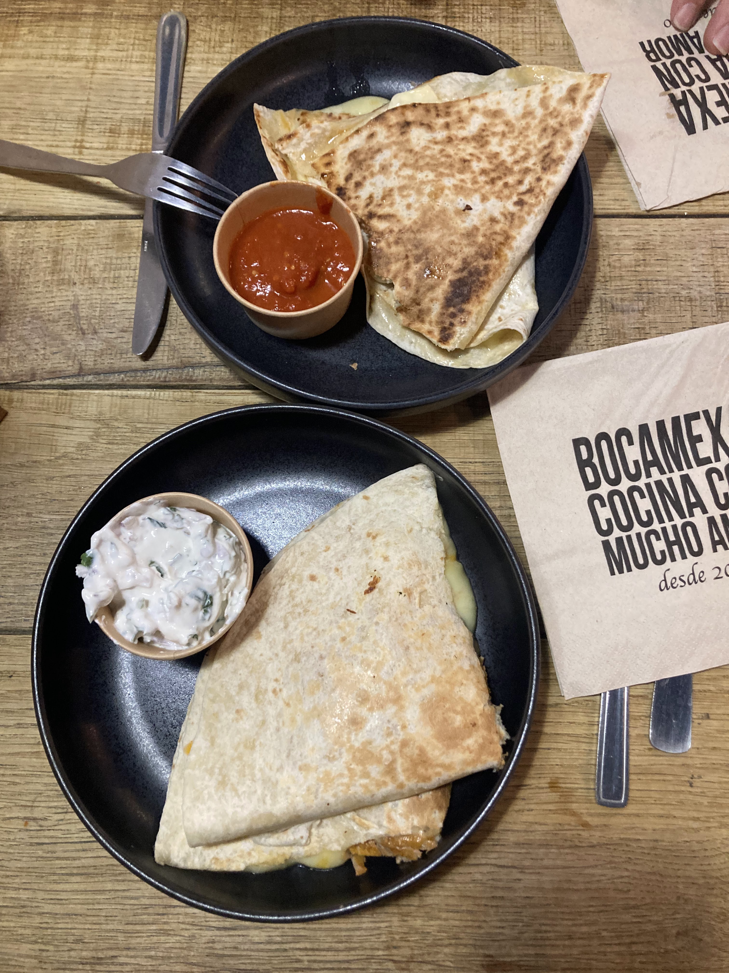 On a pris les quesadillas : on choisit la sauce associée et la garniture (viandes et autres). Vous êtes repus rapidement : vous ne ressortez pas avec l’estomac vide. L’endroit est chaleureux même si un peu petit. Le personnel est accueillant. Je recommande : c’est une bonne façon de tester la nourriture mexicaine !