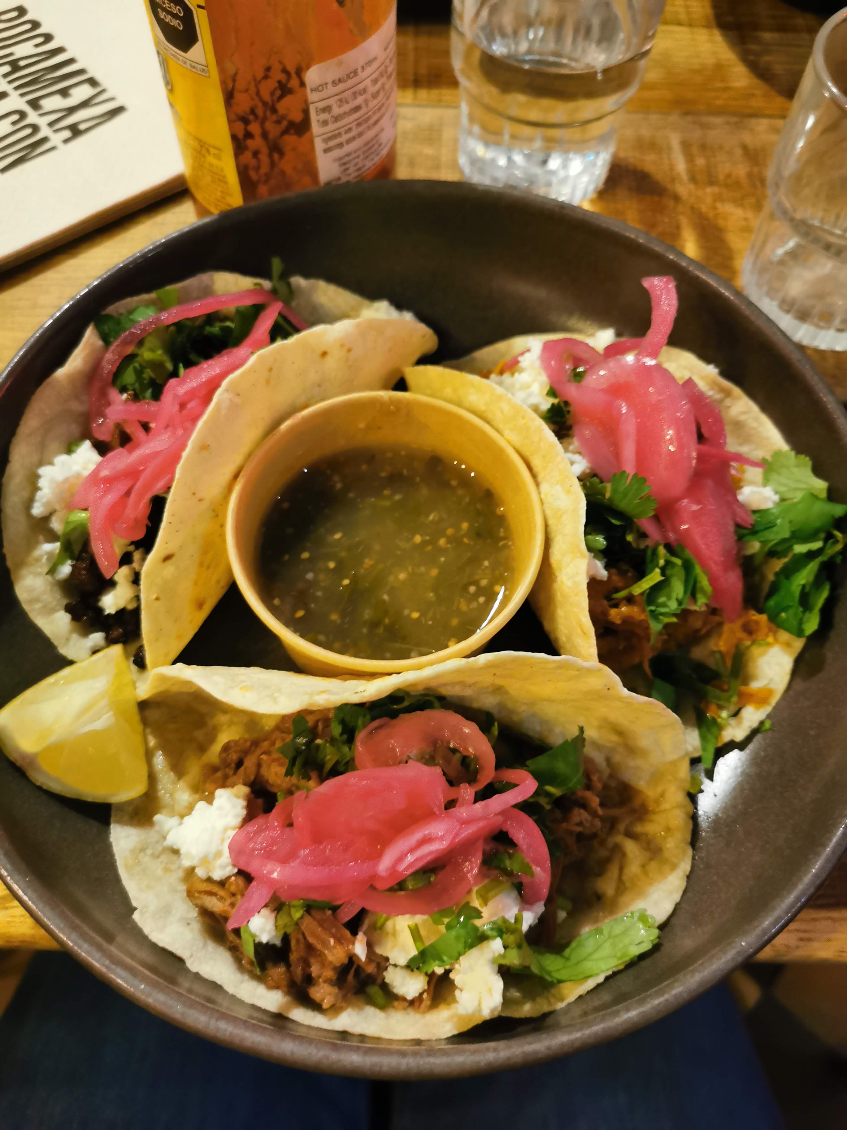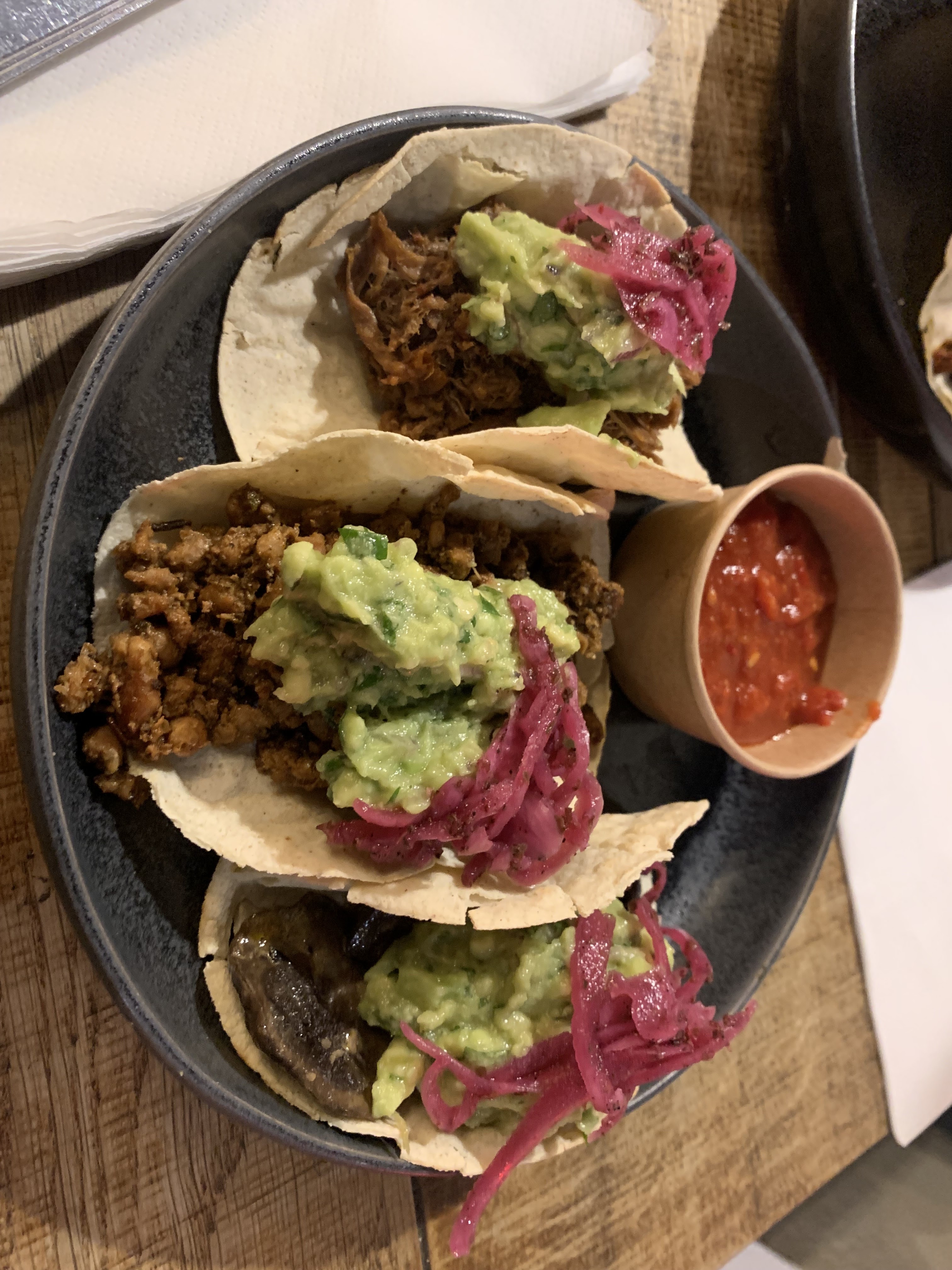 Beaux tacos, ils vous donnent le choix entre 3 pour que vous puissiez les mélanger et les assortir. Le guac est le meilleur que j’ai eu !