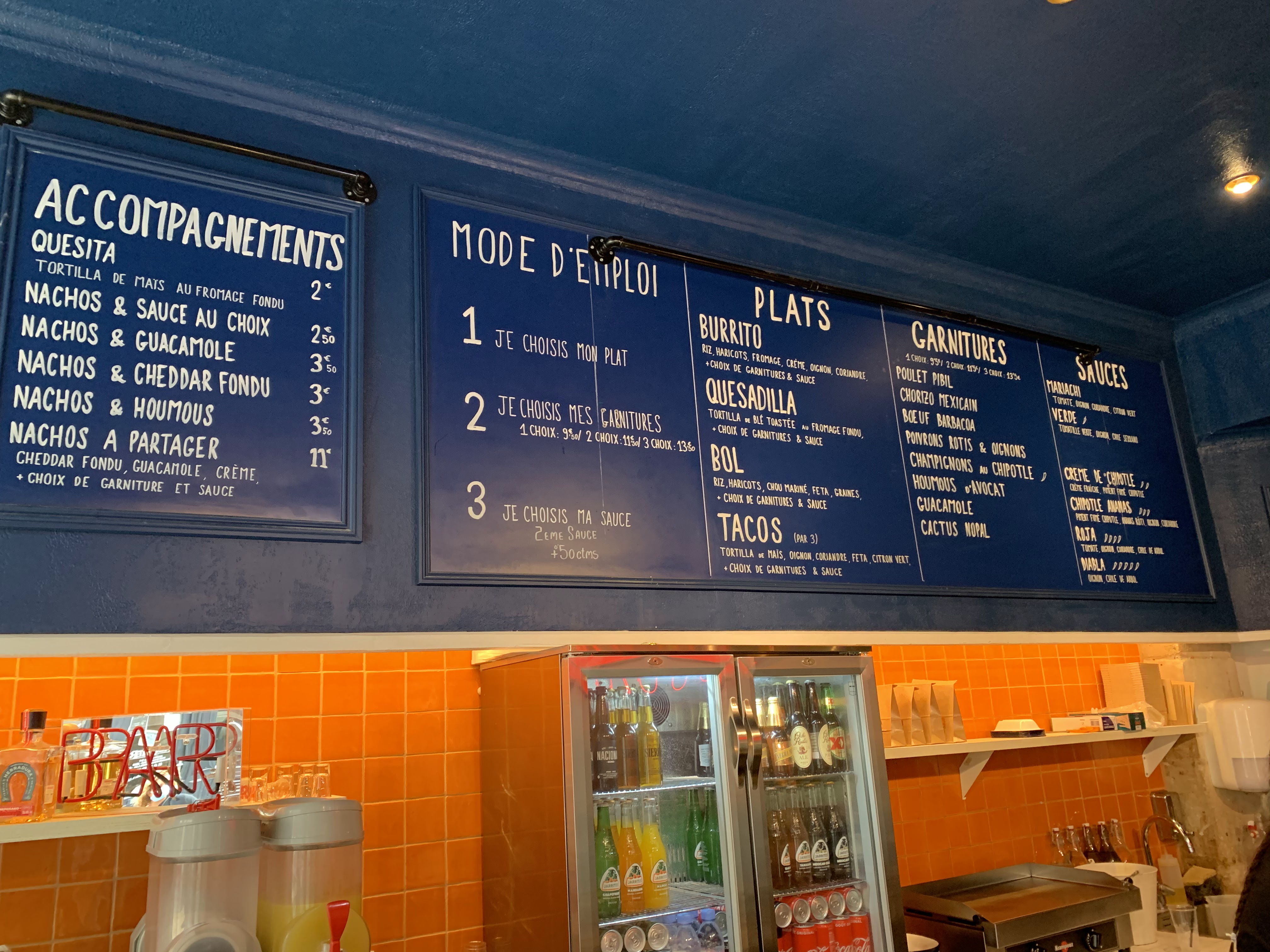 Accueil: Sans plus. Lorsque j’ai demandé plus de précisions à la jeune femme qui préparait les burritos/quesadilla, j’ai très vite perçu la nonchalance de la personne. Clairement elle n’avait aucune envie d’être là. Il me semble ne pas être le premier à faire ce commentaire lorsque je lis les précédents avis. Nourriture: Le burrito était qualitatif et j’étais rassasié! Top! La quesadilla était bourrative avec énormément de fromage… 11.90€ pour celle ci. Prix beaucoup trop excessif pour la qualité offerte. Bonne continuation!