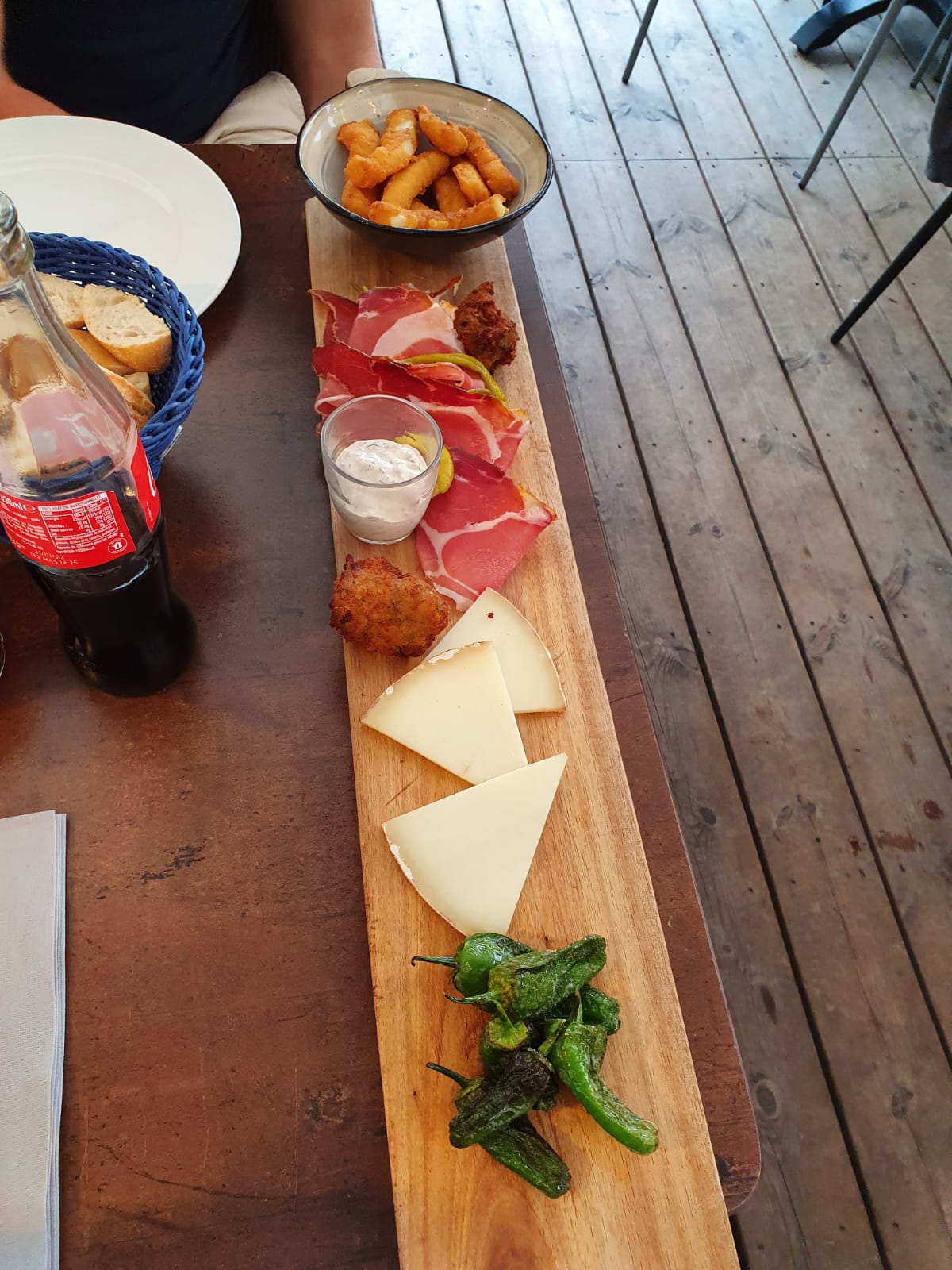 Serveuse pas sympathique- sangria blanche (en fait orange/rose) faite avec des jus de fruits- chipirons pas assez grillés- burger servi sans la sauce au bleu- frites molles. Très déçus