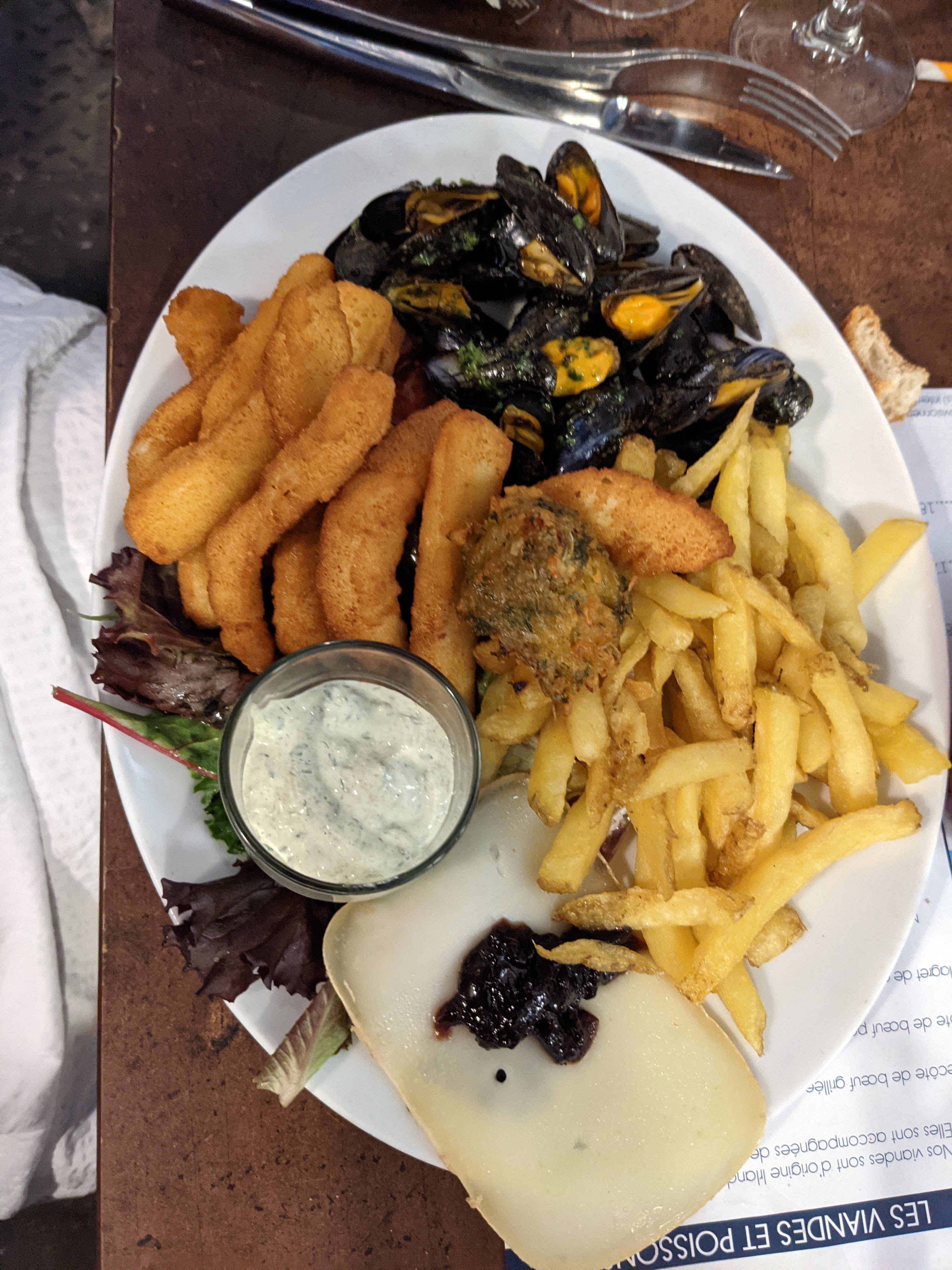 personnel sympa mais pour le prix qu on a payé pour une salade de la mer 3 gambas avec 2 feuilles de salade et 1 tomate cerise c est limite !! frites dans l assiette de monsieur toutes noires à se demander si l huile de la friteuse avait été changé