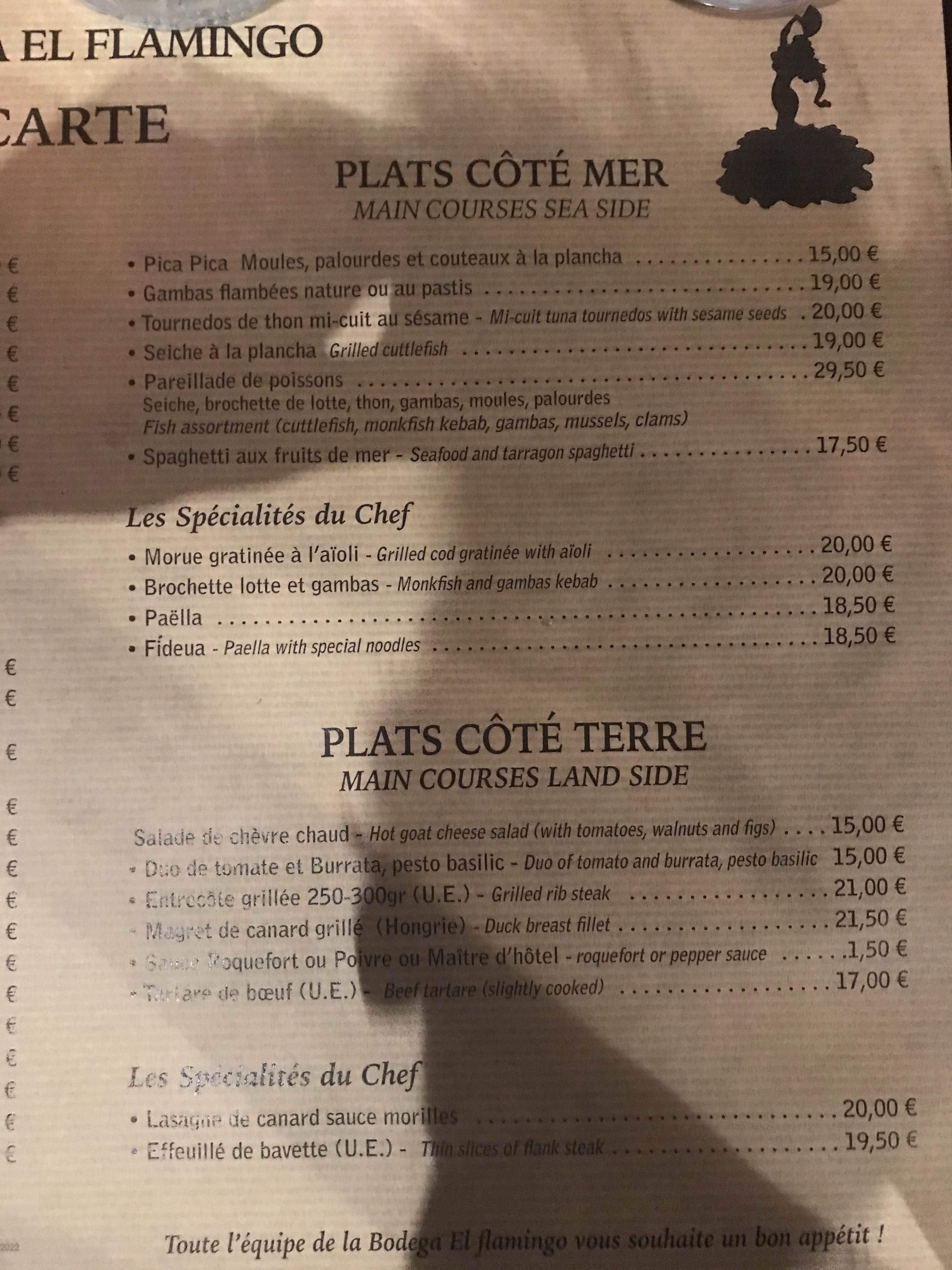 Une carte avec beaucoup de choix. Les plats quant à eux étaient très bons, des tapas jusqu’au desserts ! Nous avons pris 2 assiettes de spaghettis aux fruits de mer, elles étaient copieuses et goûteuses ! Quant au cadre du restaurant, il est typique espagnol et verdoyant ce qui nous plonge dans une ambiance chaleureuse. Le service était très bien, on nous a même offert un rhum arrangé au bar au moment de l’addition ! Nous recommandons ce restaurant.