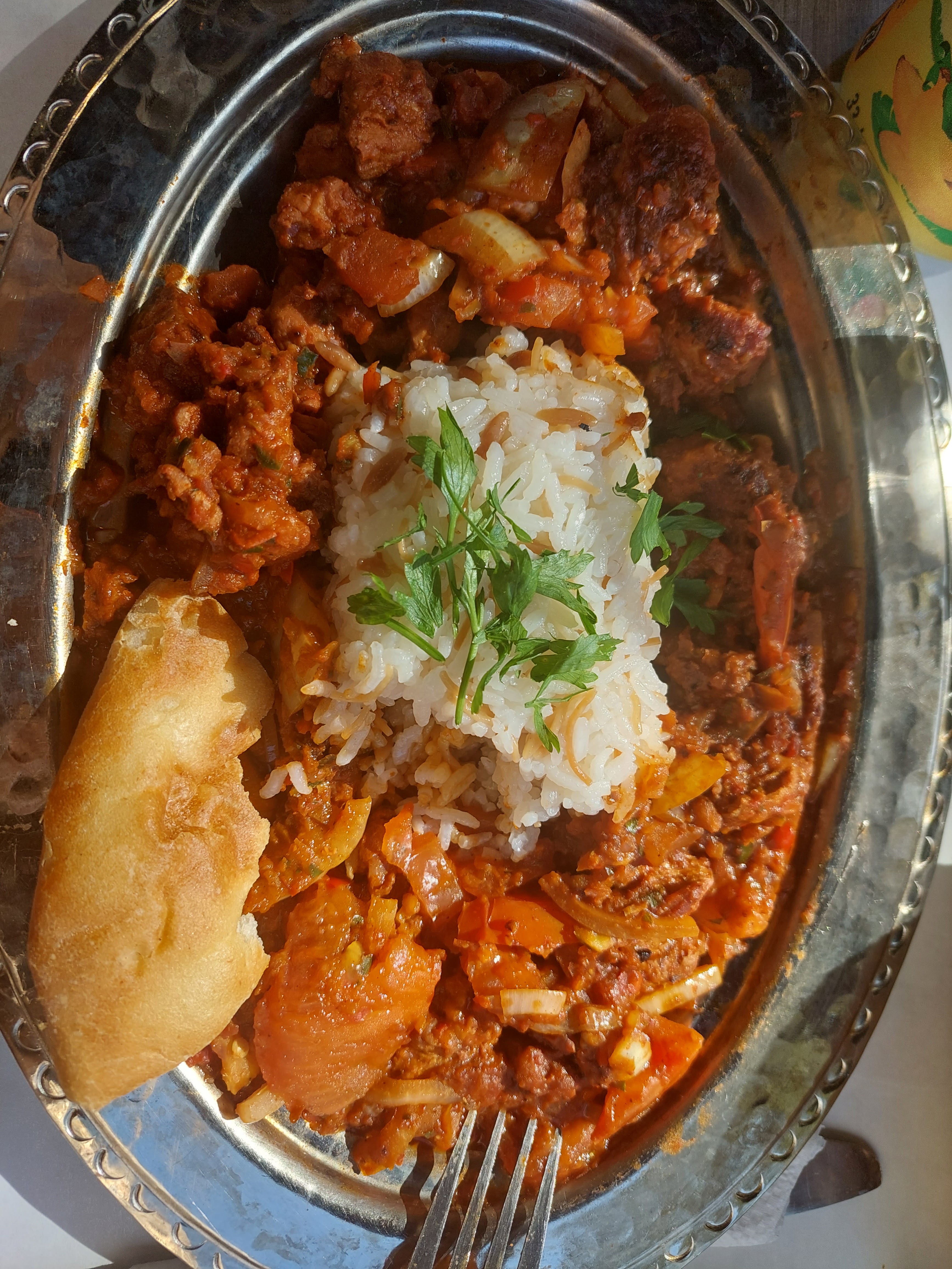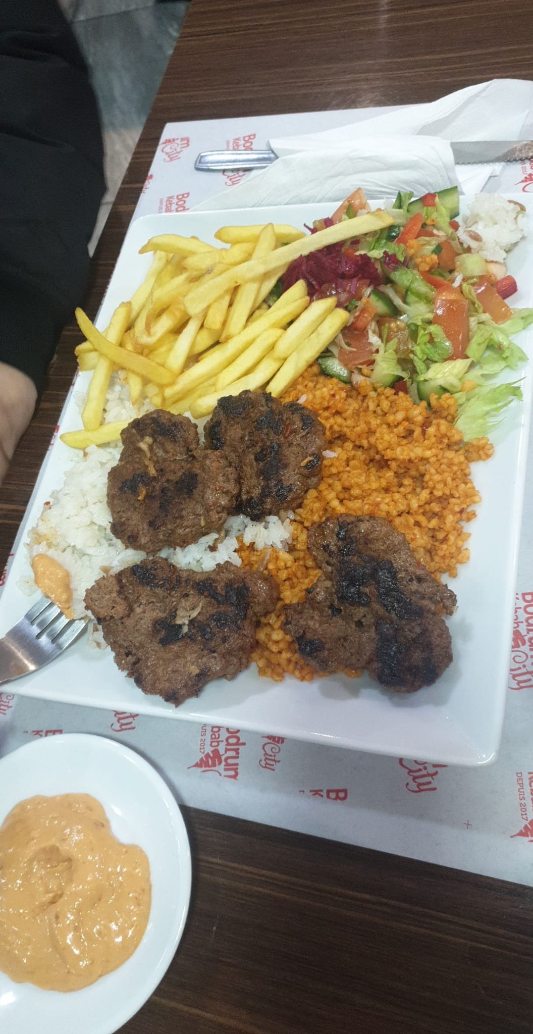 J'ai eu l'assiette mixte, Assiette mixtre, un mélange de quatre viandes différentes (Köfte et du bœuf et du poulet), des frites, de la salade et du riz. La viande était un peu sèche et je l'aurais préféré avec plus d'épices et une sorte de sauce / trempette, - le service était rapide, j'ai eu ma nourriture quelques minutes après la commande. Certains membres du personnel étaient très sympathiques et serviables, mais le gars qui prenait ma commande était plus intéressé par autre chose que par ma commande.