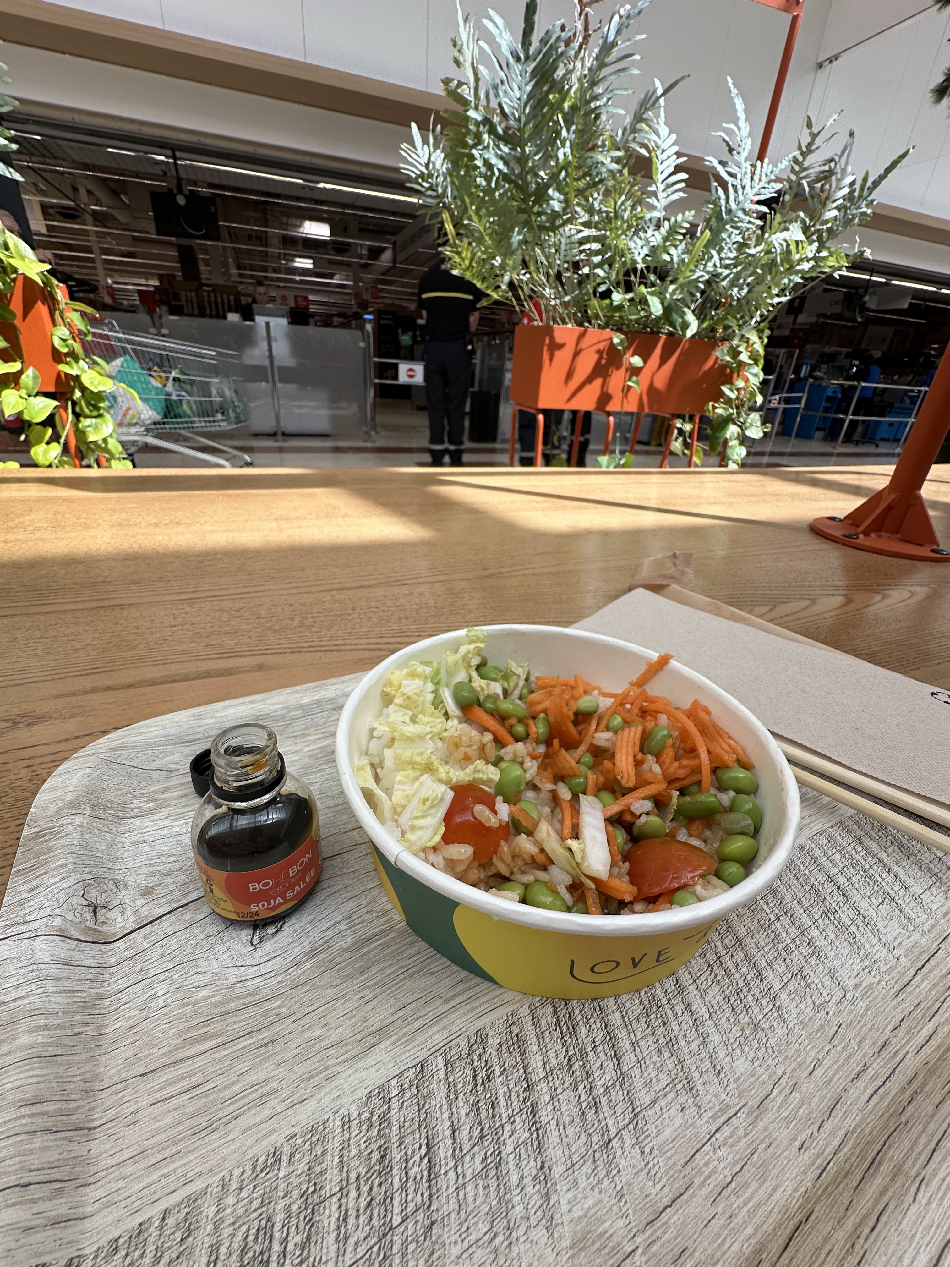 J'ai pris la dernière fois très bon et personnel très agréable. J'ai cependant été très surprise le lendemain qd je suis passée devant le stand à 9h30 et tous les bowls étaient remplis de riz et de quinoa mais ouverts et à l'air libre sur le plan de travail?????