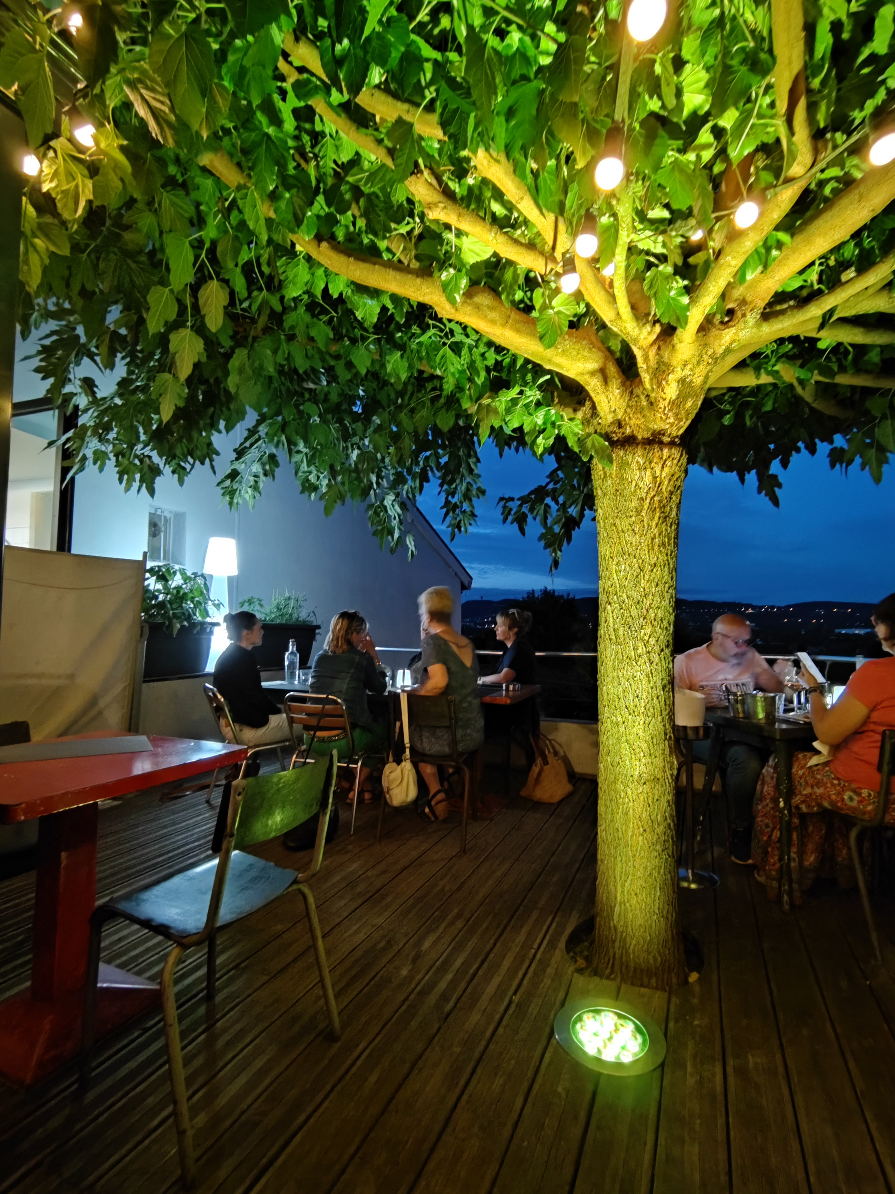 Une terrasse inaccessible depuis l'intérieur car une table client dans la véranda a l'emplacement du passage dommage car elle bien exposé avec belle vue sur la colline. Bon plats mais assez chere a mon goût. On ne s'entendaient pas a cause de la proximités des table et le cloisonnement a se croire dans une garre aussi si la terrasse était ouvert on aurait gagné en confort . Personnels agréable. Les wc sont difficilement accessible en plein escalier à mi etage comment ferait une personne à mobilité c'est carrément dangereux . A améliorer ces point car un super potentiel. Sinon j'ai mangé un gigot d'agneau plus gros et moins cher mais à rien à enlever à la qualité à ce niveau.