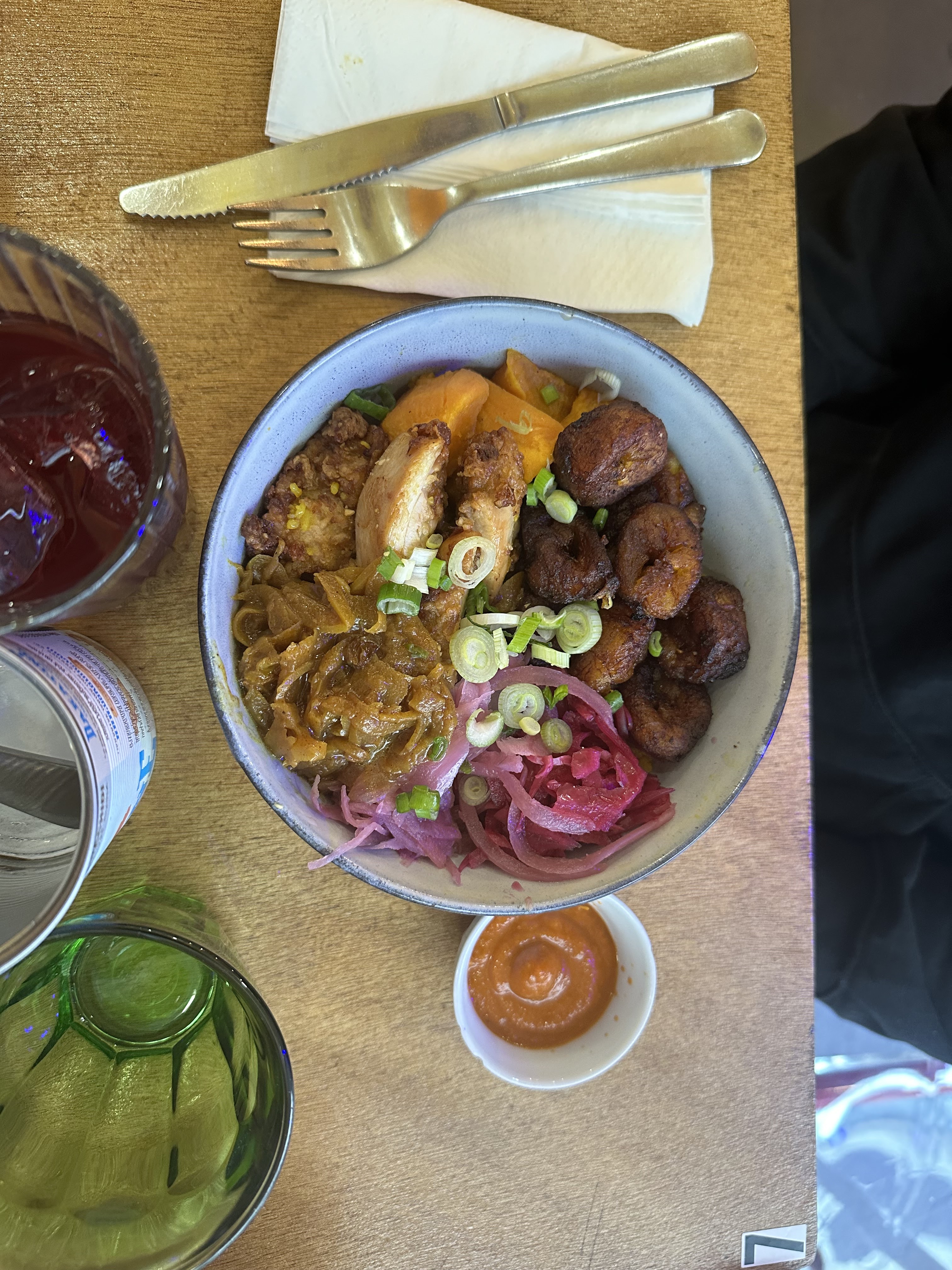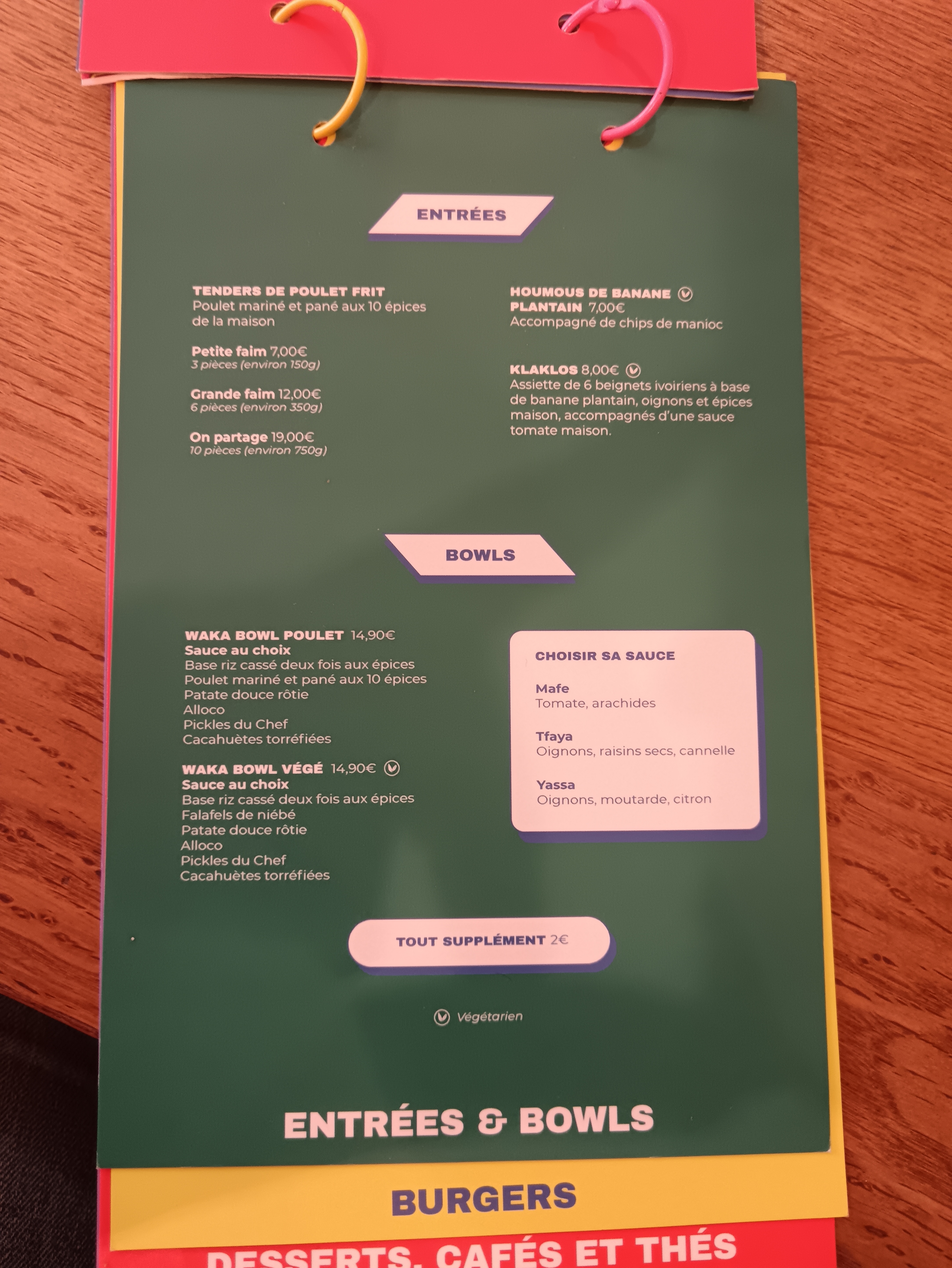 Il y’a quelques semaines, je me suis abonnée à leur page TikTok alors qu’ils n’étaient pas encore ouverts. Dès le premier visionnage de leur vidéo qui montrait leur projet, j’ai eu envie de tester. J’ai proposé à une amie de m’accompagner et elle était très enthousiaste, après avoir vu leur pub sur Instagram. Nous prenons rendez-vous le samedi 1er avril et dès notre arrivée, nous sommes émerveillées par la déco qui donne le ton. Rien de foufou, tout en simplicité, mais très joli 🥰. Nous sommes accueillies très chaleureusement par les hôtes et la serveuse très souriante et chaleureuse. Vient le moment où l’on doit commander. Il y a pas mal de choix sur la carte mais je savais déjà en arrivant que je prendrai le waka bowl dont j’avais vu la pub la veille (c’est ce qui m’a définitivement décidé à venir 😂). Mon amie, végétarienne, a pris un hamburger dont j’ai oublié le nom, désolée. J’ai pris des klaklos en entrée et en dessert, des beignets (après beaucoup d’hésitation car je ne savais pas si j’aurais assez de place). Mon amie a pris un boule de glace frite. Le bowl était bien rempli et les ingrédients repartis de manière équitables. Le hamburger et les frites de patate douce étaient goûteux aussi 😌 Pour conclure, nous n’avons pas du tout été déçues et prévoyons de revenir pour tester d’autres plats. Je prendrai cette fois-ci un burger et mon amie un bowl végétarien, entre autre. Bien sûr, on testera aussi le houmous de plantain et d’autres choses. Tout donne envie !