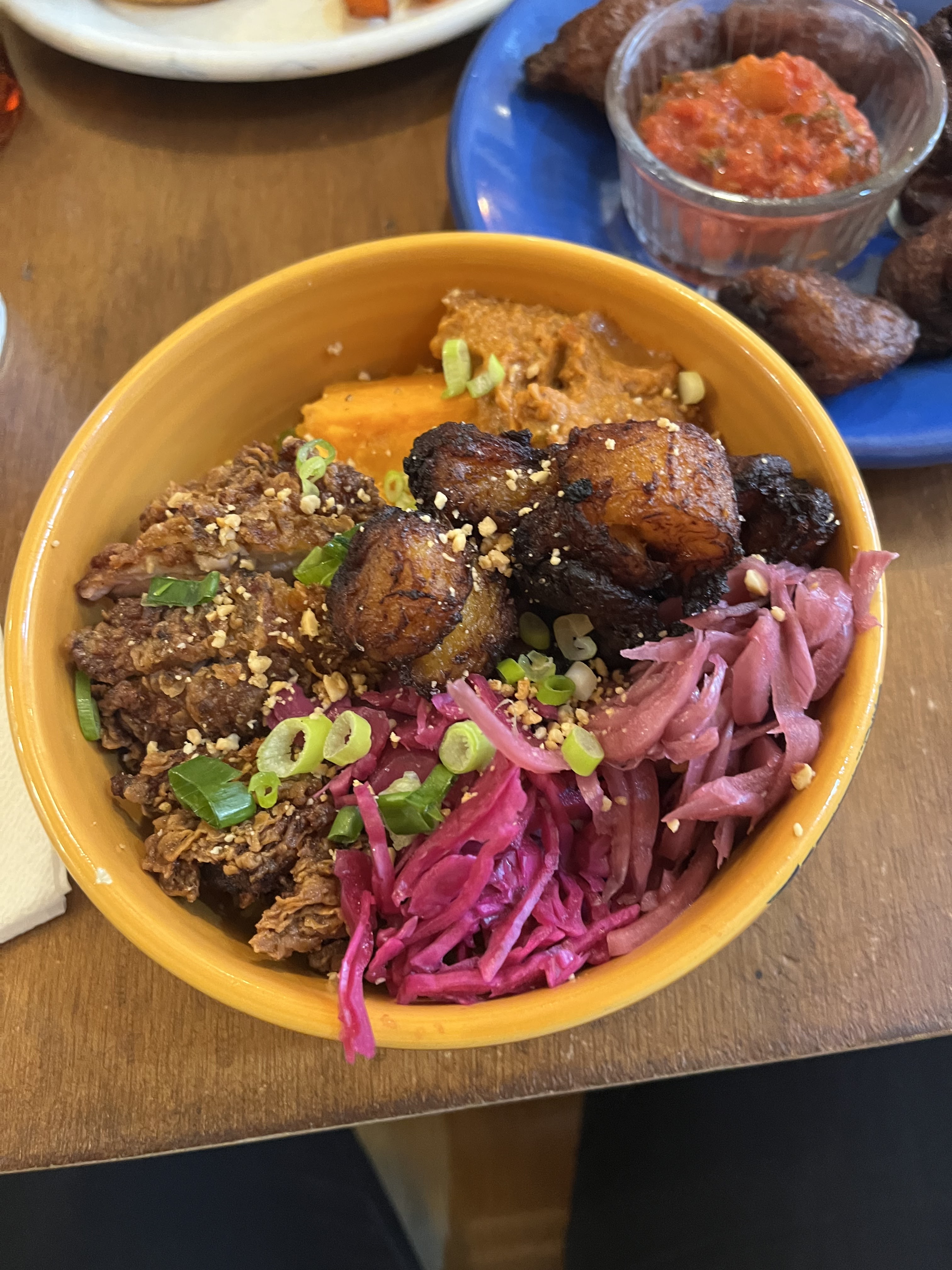 Bel endroit, le restaurant est agréable. Les aliments sont de qualité et goûteux, les repas étaient chaud et travaillés. Les assiettes nous ont été servis avec un bon timing. La nourriture afro, revisité, que demander de plus ?