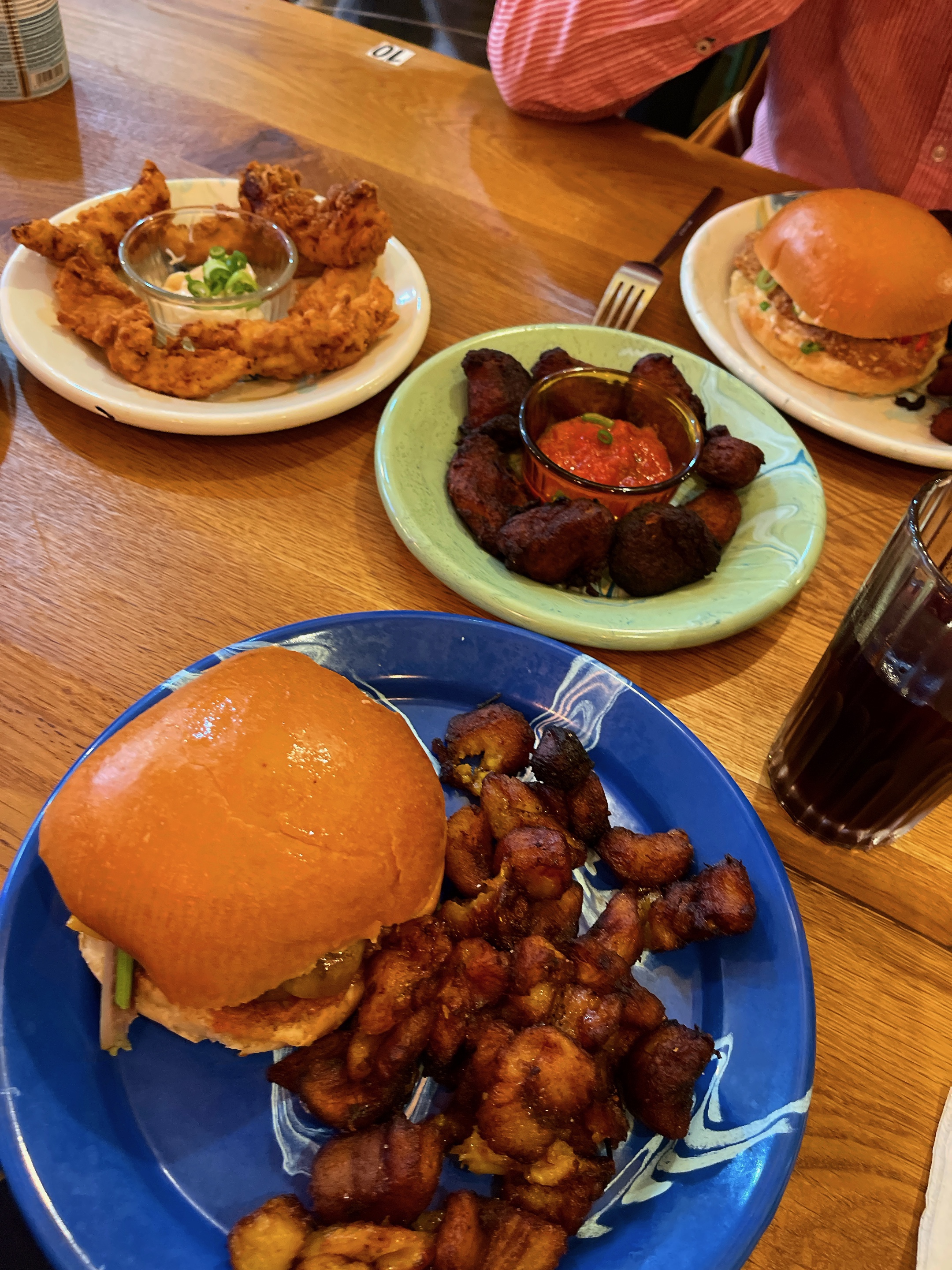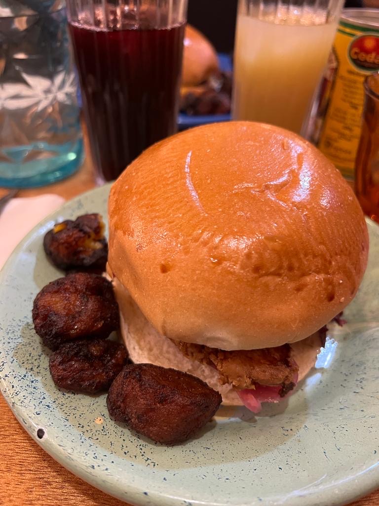 Super adresse !! L'endroit est chaleureux avec ses belles peintures murales. Personnel très agréable et on a TRES BIEN MANGÉ ! Poulet frit en entrée délicieux. Petite réserve sur le pain sans gluten (sur demande) dont le goût prend un peu le dessus sur la garniture. Bananes plantain : un régal !