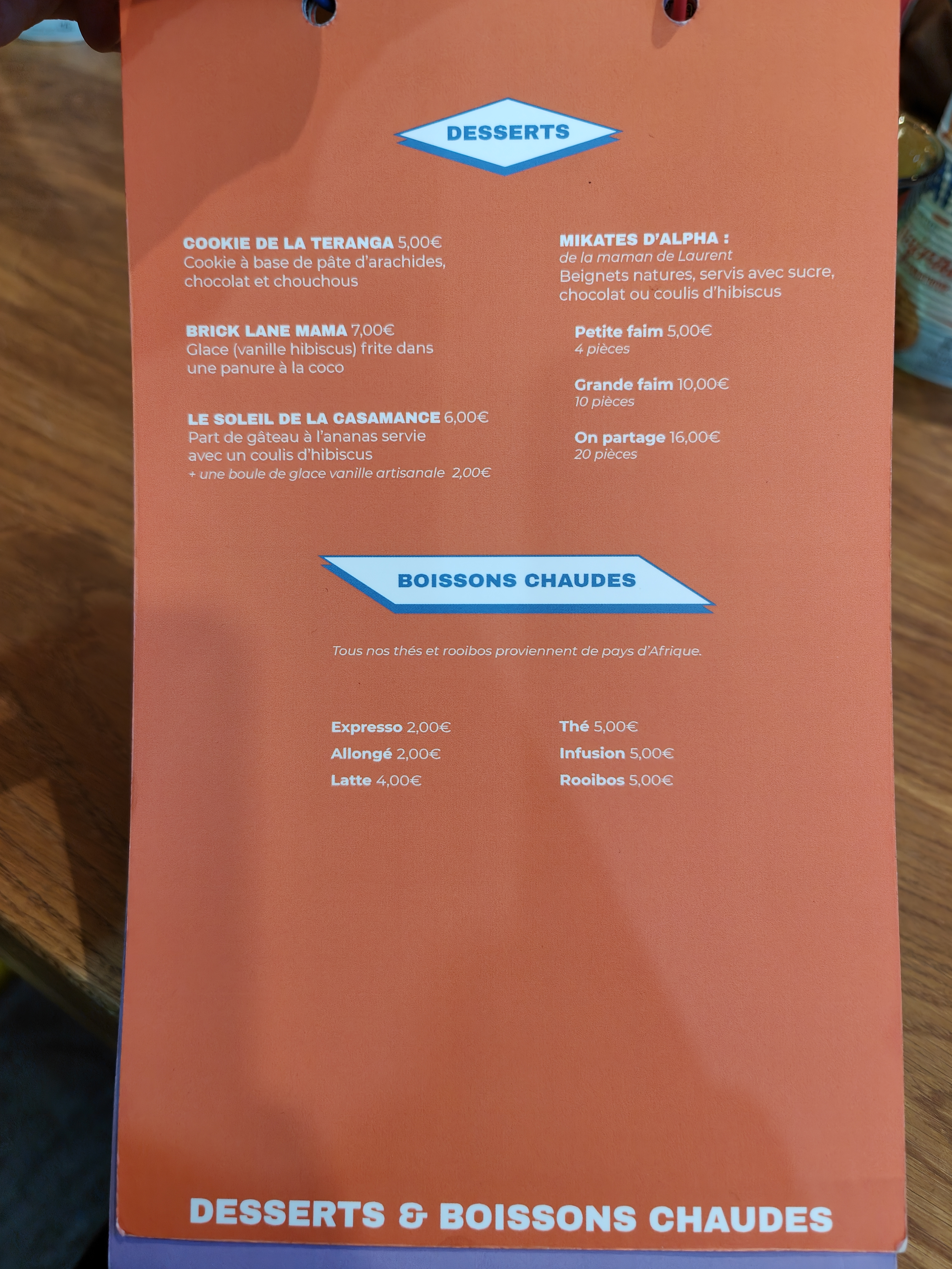 Tombée par hasard sur ce restaurant, j’ai tout de suite été attirée par les couleurs vives de l’entrée et de la déco qu’on peut apercevoir depuis l’extérieur puis j’ai été séduite par le concept. Les portions sont vraiment généreuses (donc ayez le ventre vide ^^), les plats savoureux (j’ai adoré leur boisson à l’hibiscus a.k.a bissap), on voyage du début à la fin et le service est impeccable avec un personnel sympathique et à l’écoute.