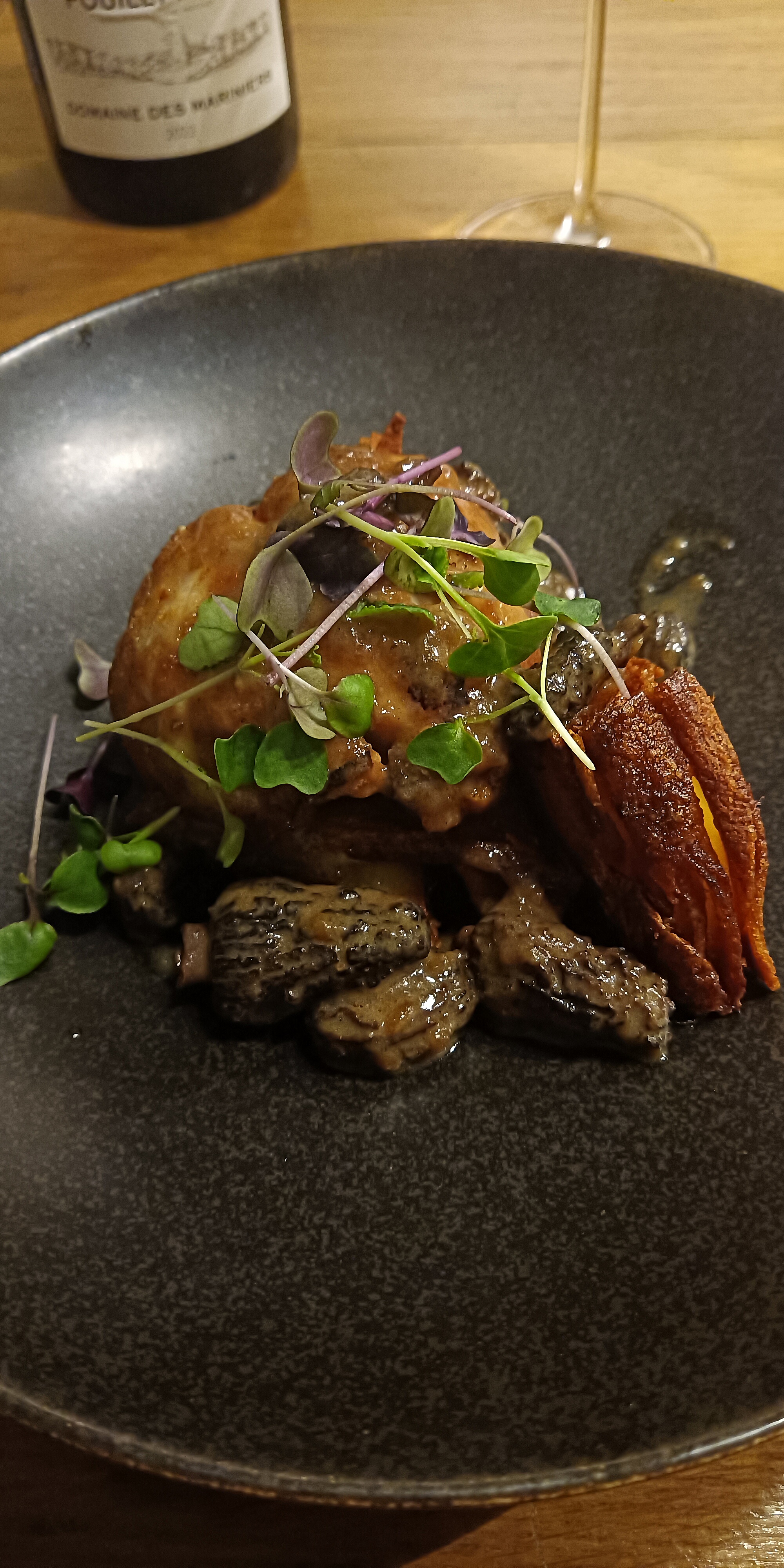 Une superbe soiree Un superbe diner ( un oeuf parfait delicieux et fin, quasi de veau merveilleusement cuit accompagné d’une puree d’aubergines, un agreable dessert au chocolat ) Tout cela accompagné d’un mercurey grand cru 2015 exceptionnel Une veritable pepite A essayer absolument