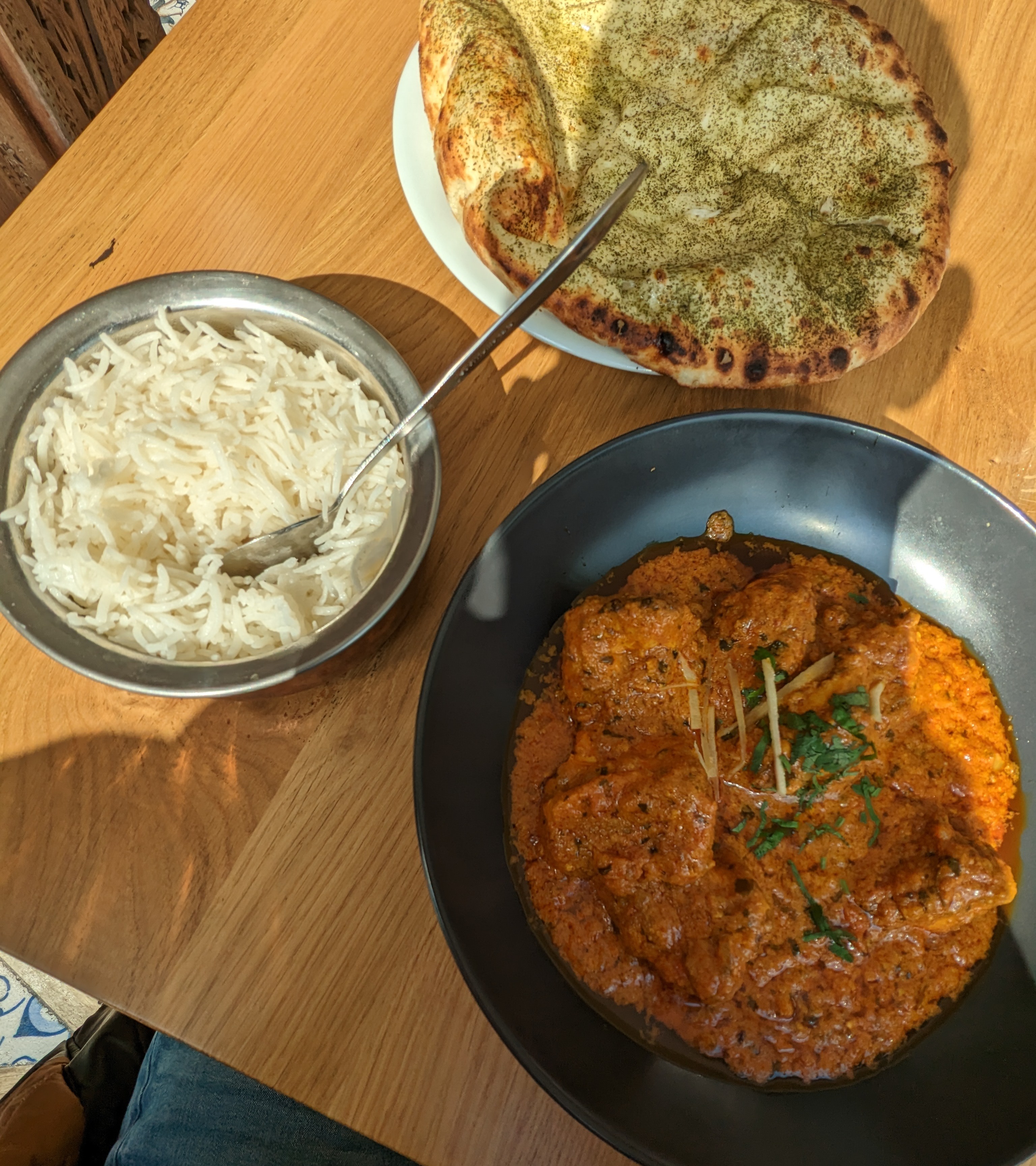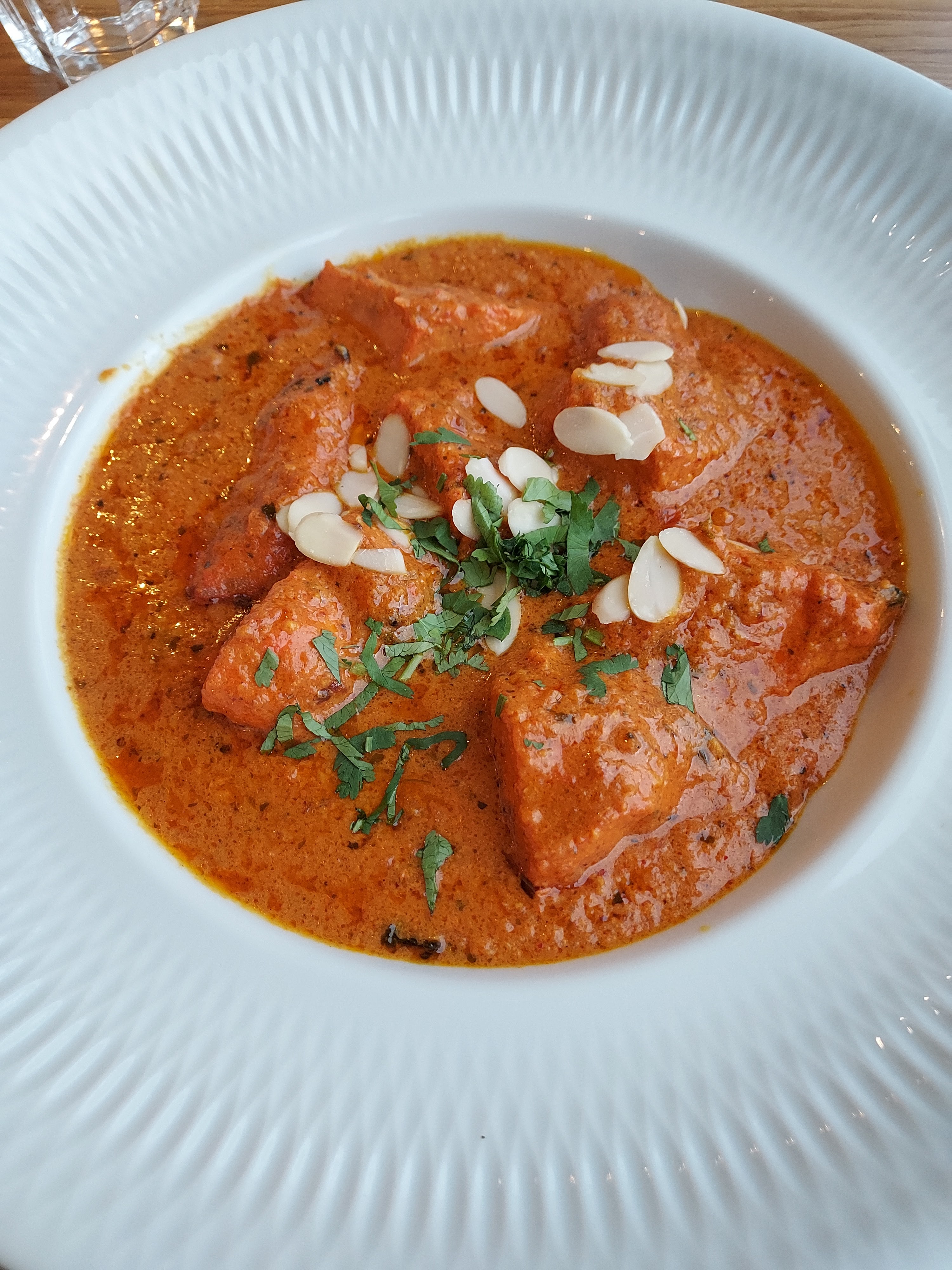 Les plats étaient excellents et très copieux ! Le butter chicken très bon, bcp de viande ! Le riz safran parfumé comme il faut et le naan ail-fromage rempli comme jamais de fromage, je n'avais jamais vu un naan aussi généreux. On a tous lutté pour finir nos plats, mais on a partagé un gulab jamun excellent en dessert. J'enlève une étoile pour l'attente longue des plats (presque 1h) et le bruit (bcp de salariés).