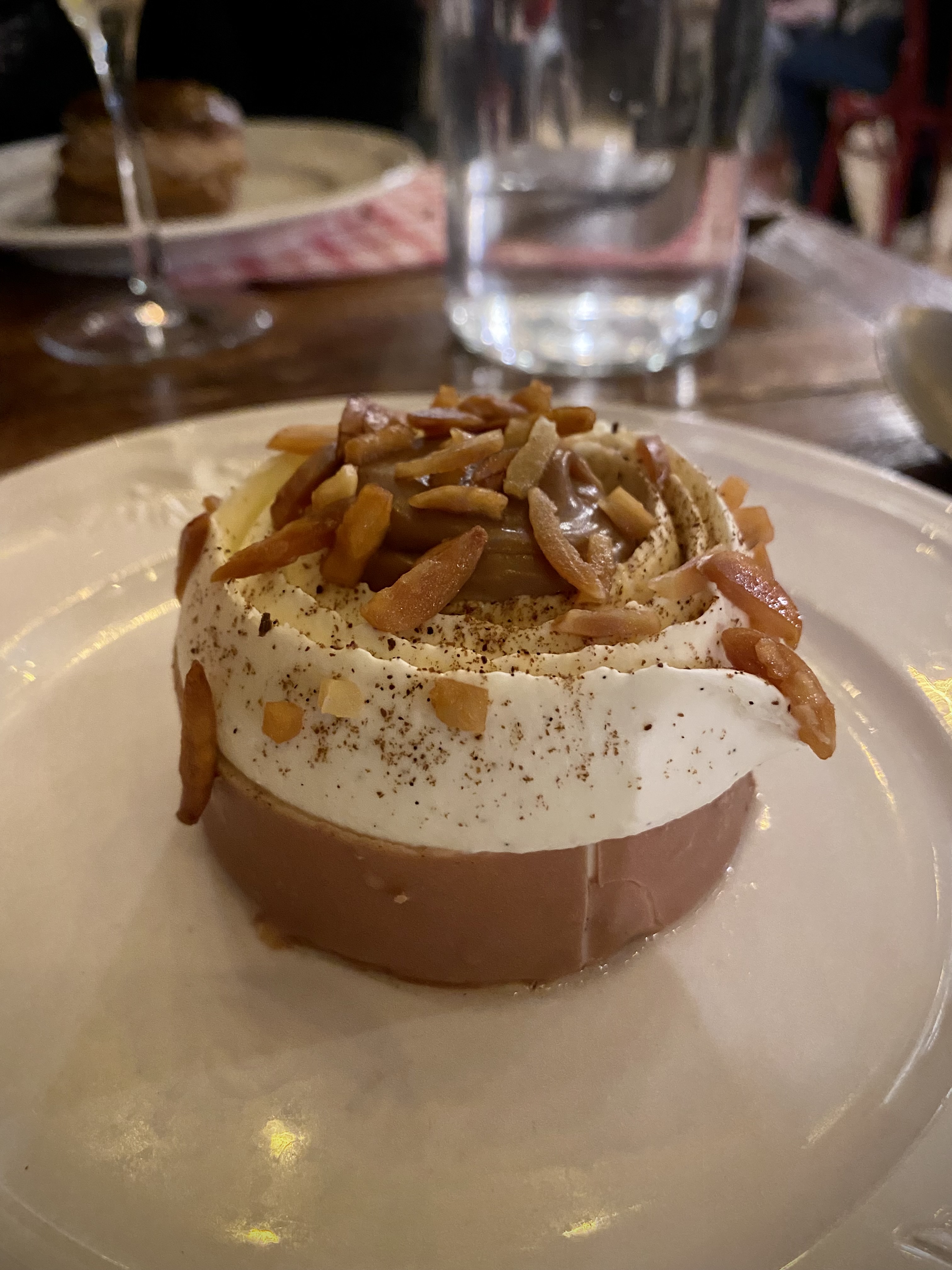 Endroit décevant. L’ambiance est sympathique et les serveurs tout à fait aimables, mais les plats sont relativement chers et dans des quantités très réduites (2 côtelettes de porc de petite taille à 20e pour la pièce de viande). Je pense retrouver un format « bouillon Chartier » mais finalement nous en avons eu pour cher et heureusement que le pain est bon sinon nous aurions dû aller dîner ailleurs ensuite. Point particulièrement négatif sur les desserts, très chers (12e) pour un entremet assez gras et surtout vendu comme un pain perdu (vu le libellé j’avais imaginé quelque chose de généreux, je vous laisse juger la photo). Le barman très gentil nous a offert un génépi quand nous lui avons fait par de notre déception. Allez y boire une bière et profiter de l’amabilité de l’accueil, mais je ne recommande pas d’y manger.