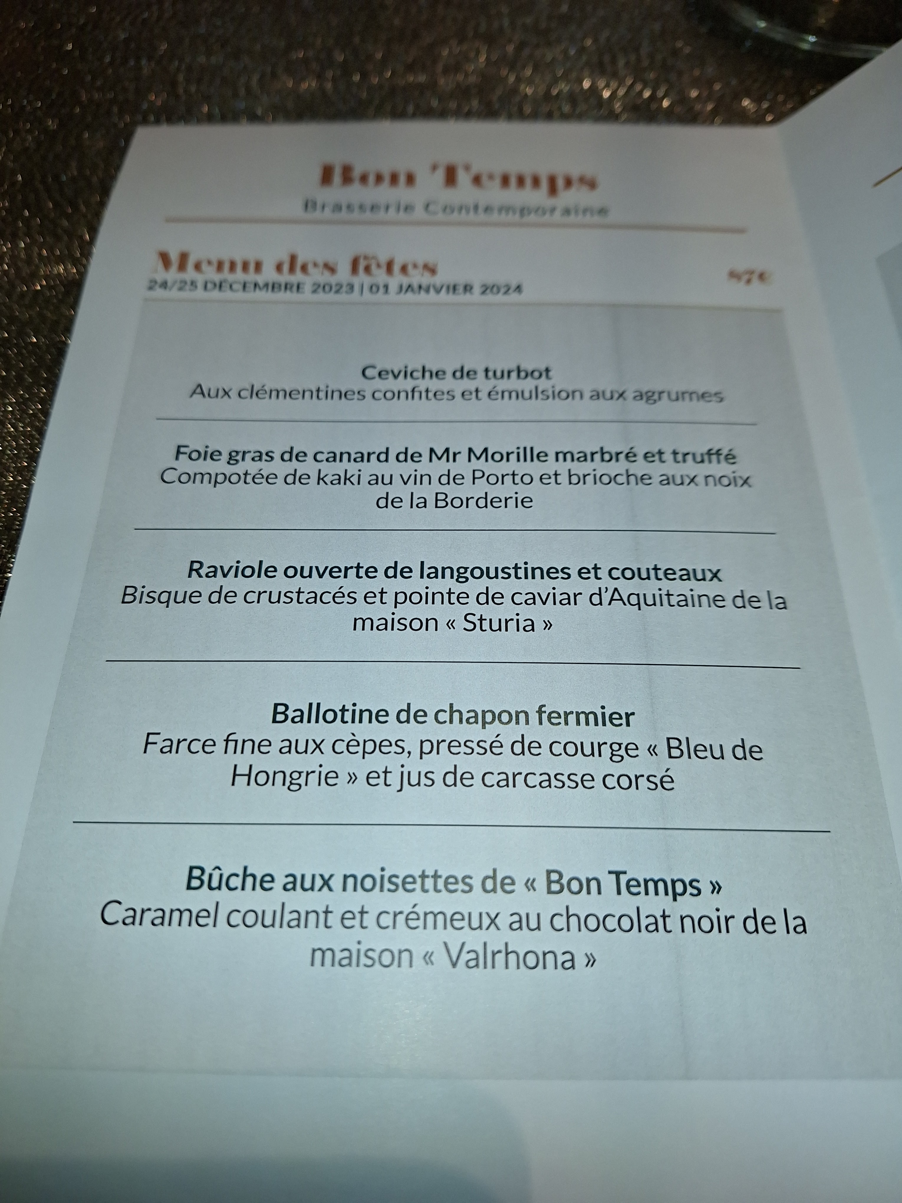 Un excellent moment passé au Bon Temps, j'y suis allée 2 fois. J'ai été très bien accueillie avec mon petit compagnon à 4 pattes par toute l'équipe, le service est agréable et attentionné. Les plats sont de grande qualité, raffinés et copieux, le cadre cosy et élégant. On peut voir la brigade préparer les plats car la cuisine est ouverte sur la salle. Chaque semaine, il y a un nouveau menu à 25€ (midi et soir) pour un plat + un dessert. Le rapport qualité-prix est imbattable. Mention spéciale pour le brownie et le mille-feuilles au café, vraiment délicieux. Je reviendrai vous voir avec plaisir lors de mon prochain séjour à La Rochelle