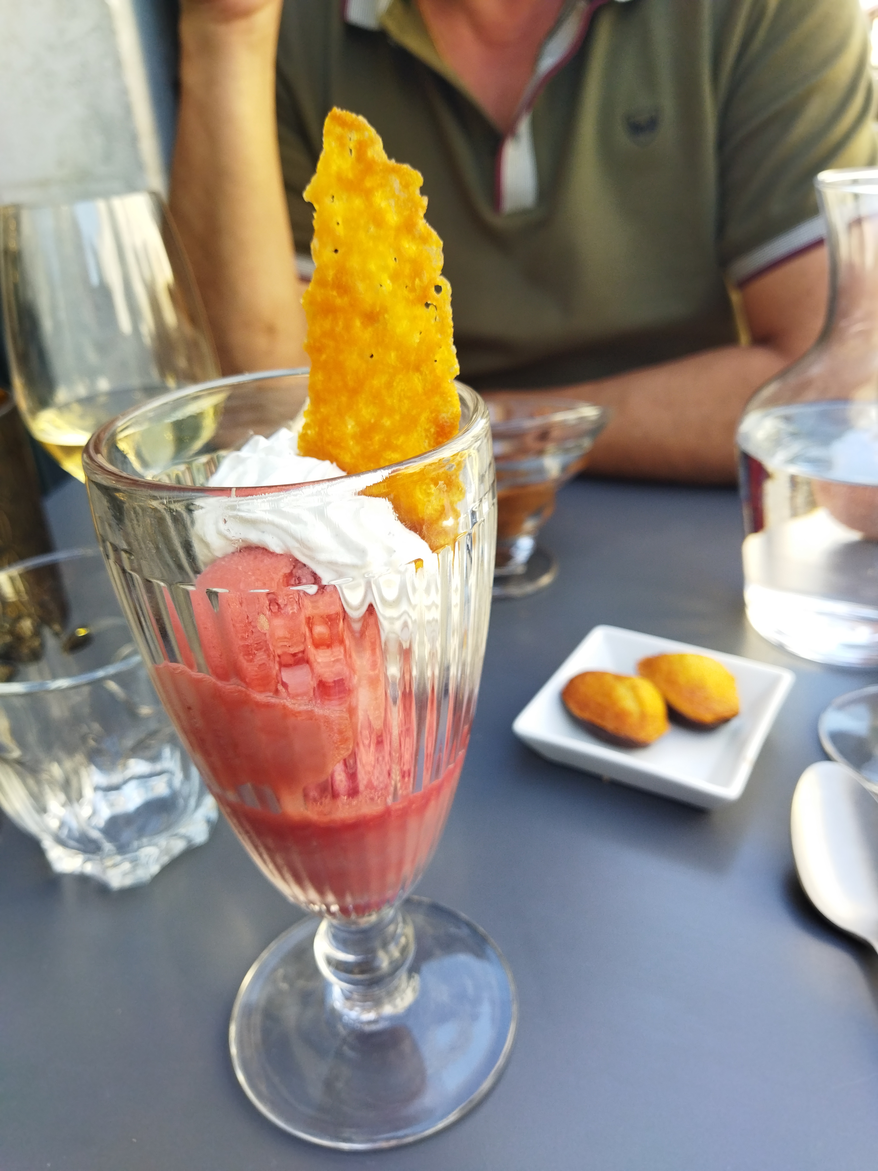 Très bon accueil, on se sent attendu avec une réservation (qui semble indispensable en haute saison). Service vraiment sympa, agréable et très efficace. Des petits plus (rillettes de poisson d’accueil, petites mignardises au dessert...), agrémentent un très bon repas avec une carte de type « brasserie ». L’Os à moelle est très bien accompagné de son carpaccio de betteraves assaisonnées (note : deux os sont un peu chiches en quantité, rapporté au prix à la carte). Le maigre et parfaitement cuisiné et la farce ricotta/estragon accompagne bien l’aubergine. L’abricot/glace lait d’amande fonctionne très bien ensemble - le gâteau pistache manque un peu de pistache en goût.