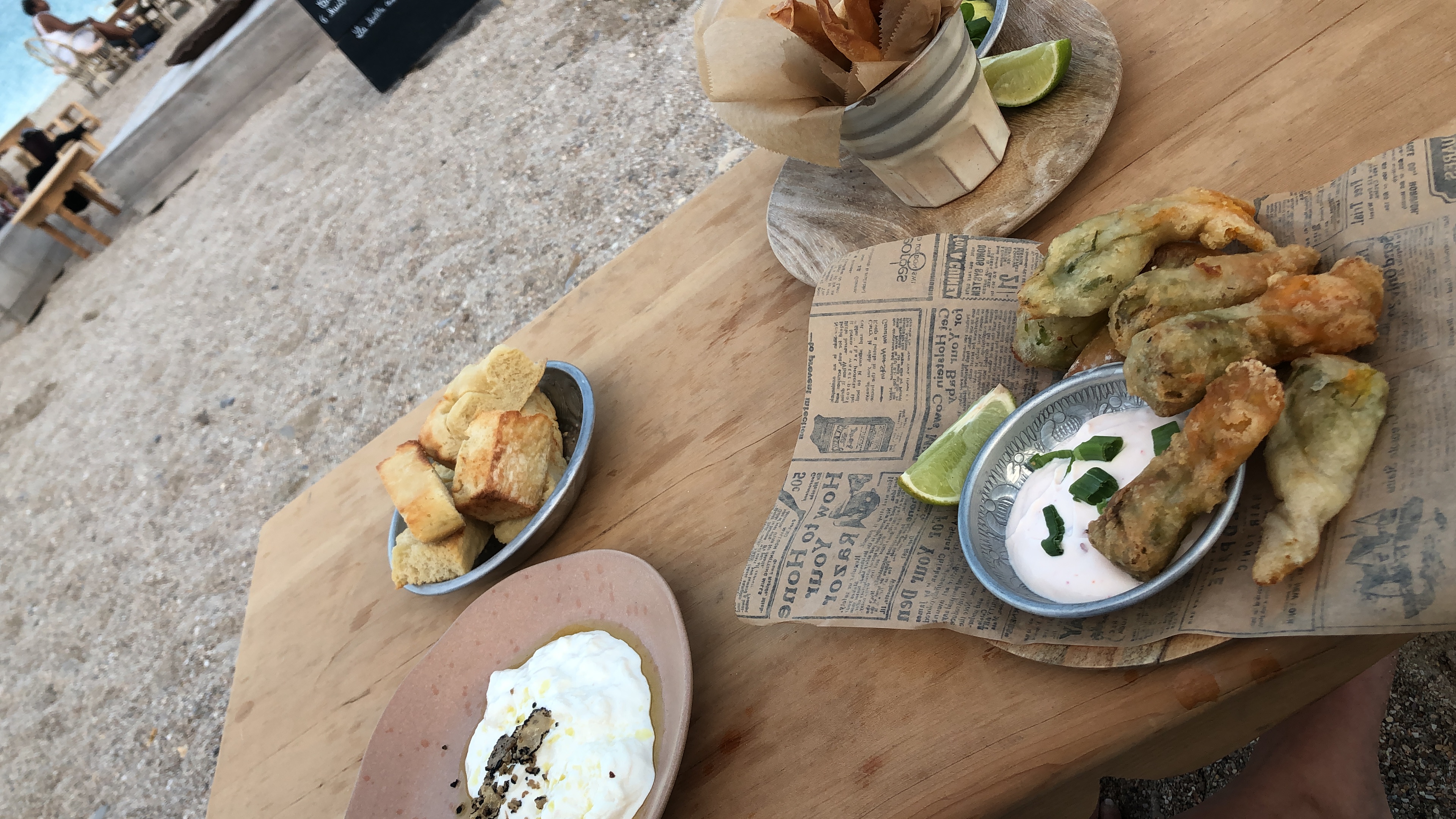 Prévoir de l’attente beaucoup d’attente pour la prise de commande et le service . Pas d’eau pas de serviette et une note plus que saee compte 22 e pour 7 ou 8 beignets de fleur de courgette froid et gisant dans de l’huile mal absorbé . Le verre de vin vous arrive déjà servit il était vraiment pas top ! Les deux étoiles sont pour la déco et le cadre