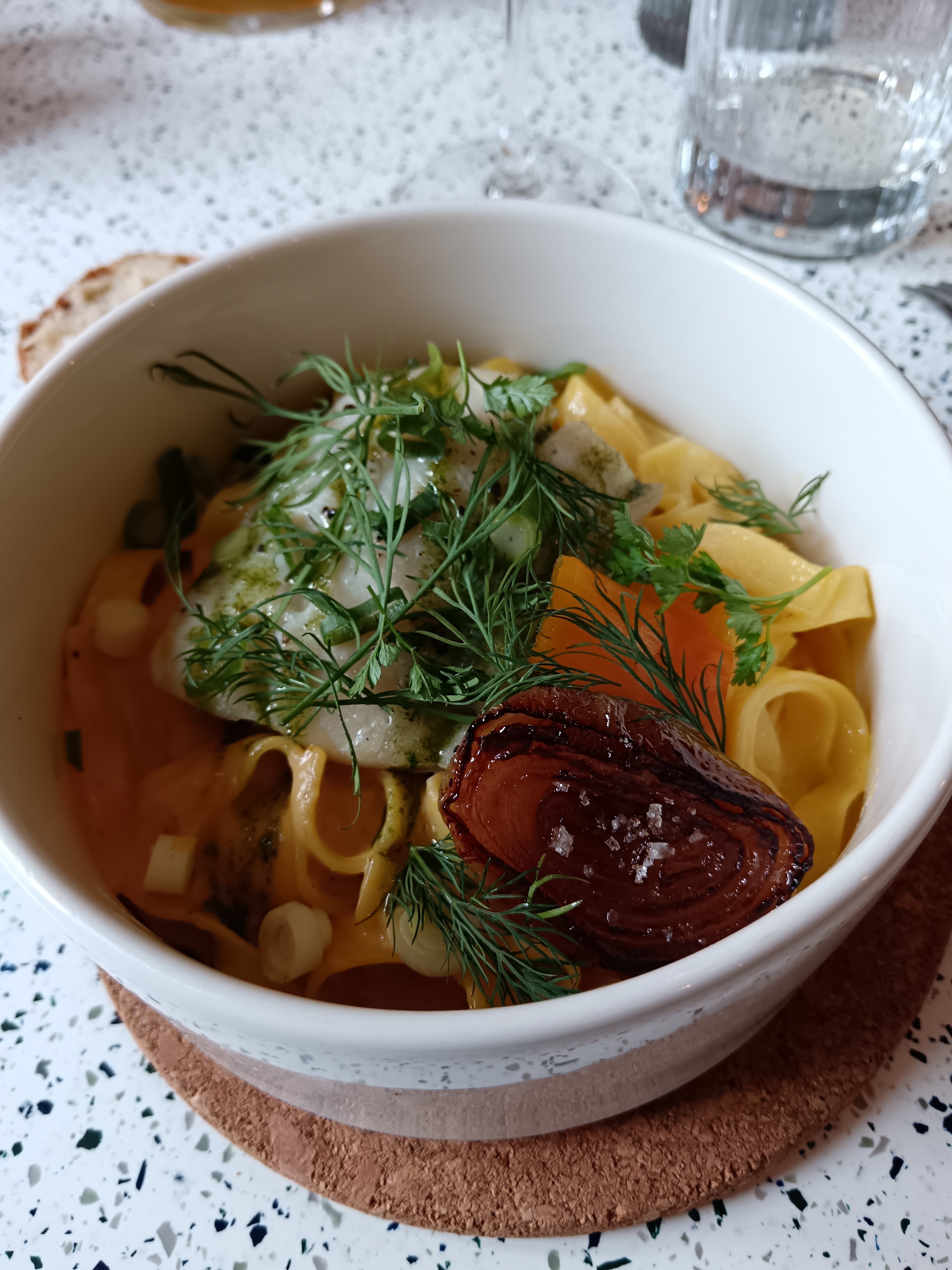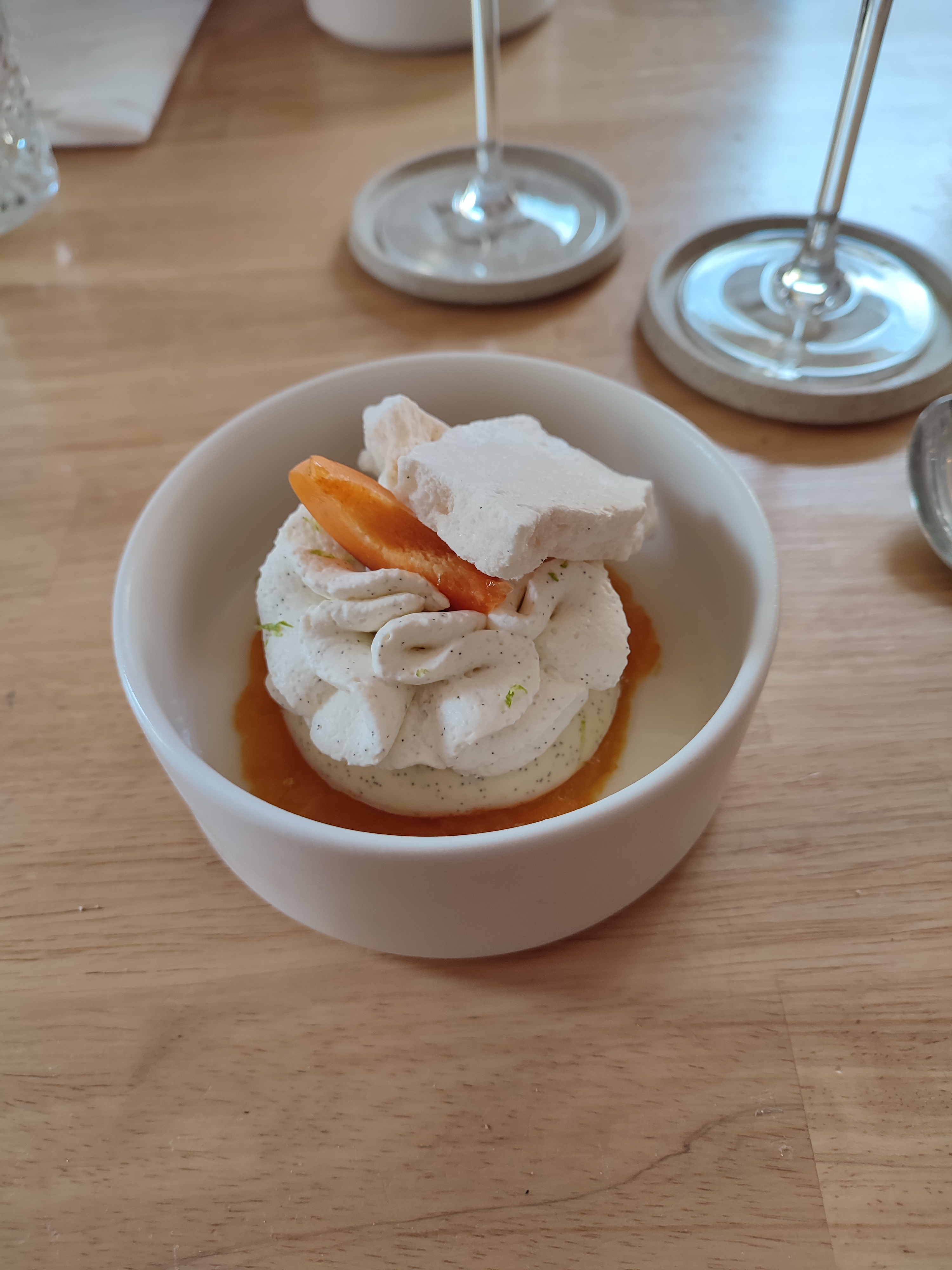 Très bon accueil. A l'étage la salle est très agréable avec une super déco. Côté cuisine... Tout d'abord le plaisir des yeux, dressage soigné, ensuite se sont les saveurs qui remplissent le palais. Tagliatelles de carottes, coriandre,houmous avec les graines de grenade qui explosent en bouche c'est juste divin. Je passe les Plats qui sont dans le même esprit,et pour finir la panacotta juste tremblante avec son coulis de mangue. Si vous passez a Bayeux, n'hésitez surtout pas. Félicitations au chef et au personnel de salle.