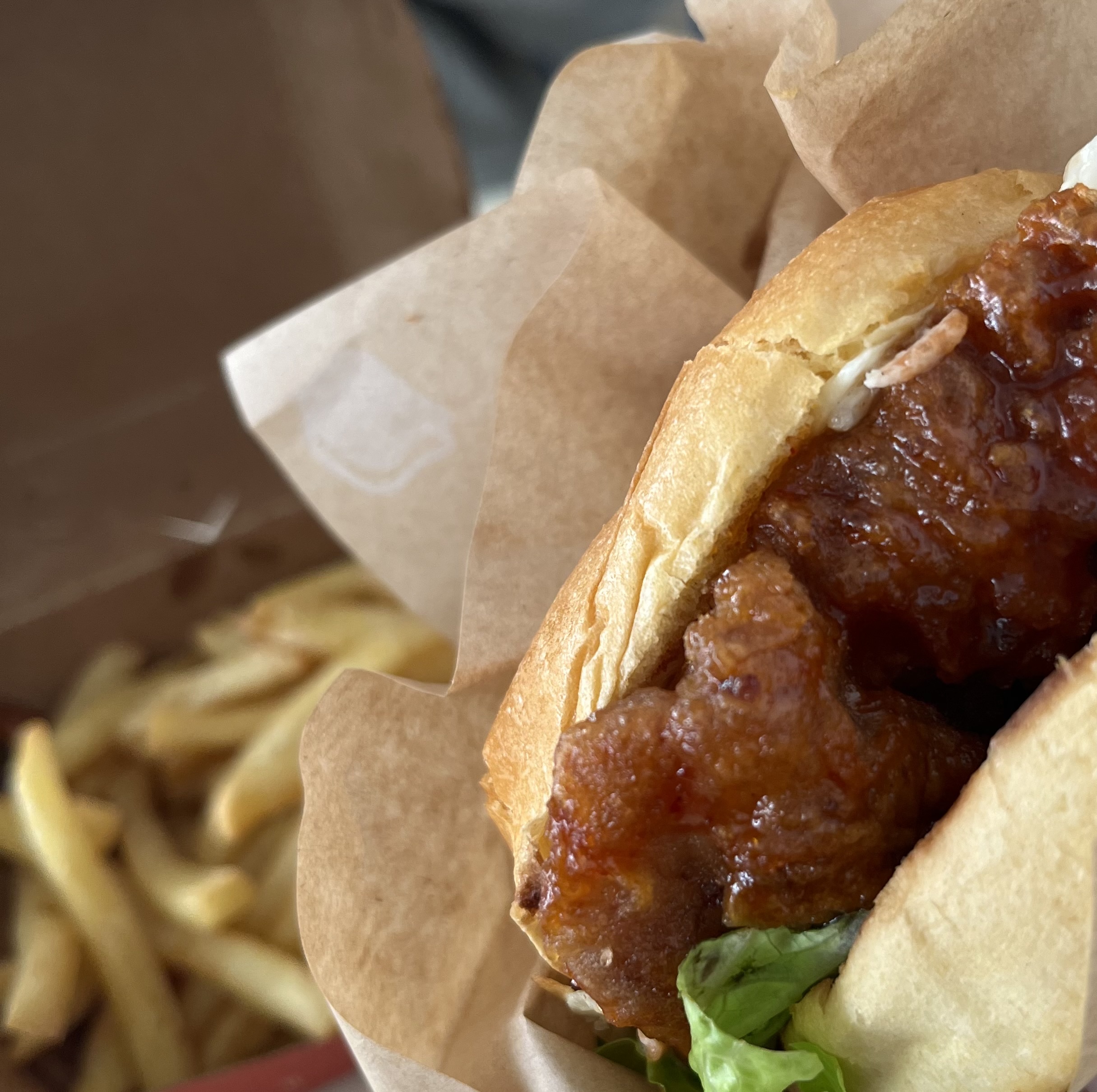 Meilleur fast food coréen de ma vie ! Je parle pour le burger poulet frit et les frites de patate douce : c'était un sans faute ! et la sauce épicée qui pique vraiment, ça fait plaisir