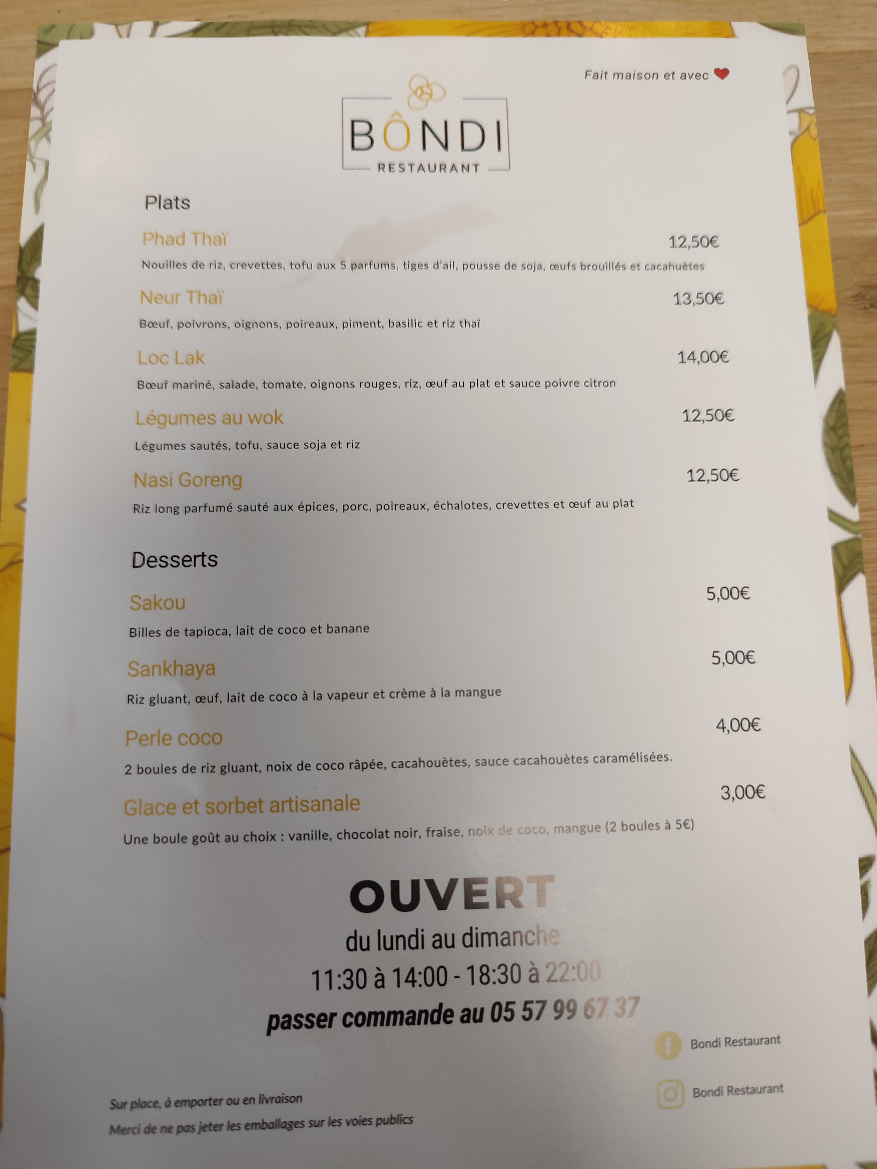 Je recommande +++ l'accueil est chaleureux, les plats sont délicieux et généreux notamment en viande, en sauces et en légumes ( y a pas que des nouilles et du riz). Venue avec une amie, nous avons choisi de nous installer sur la terrasse couverte, très agréable. Nous étions un peu juste en temps sur notre planning le service a été très rapide et avec un sourire lumineux qui vous donne la patate ! Tout cela pour un prix raisonnable. Merci à vous Bondi