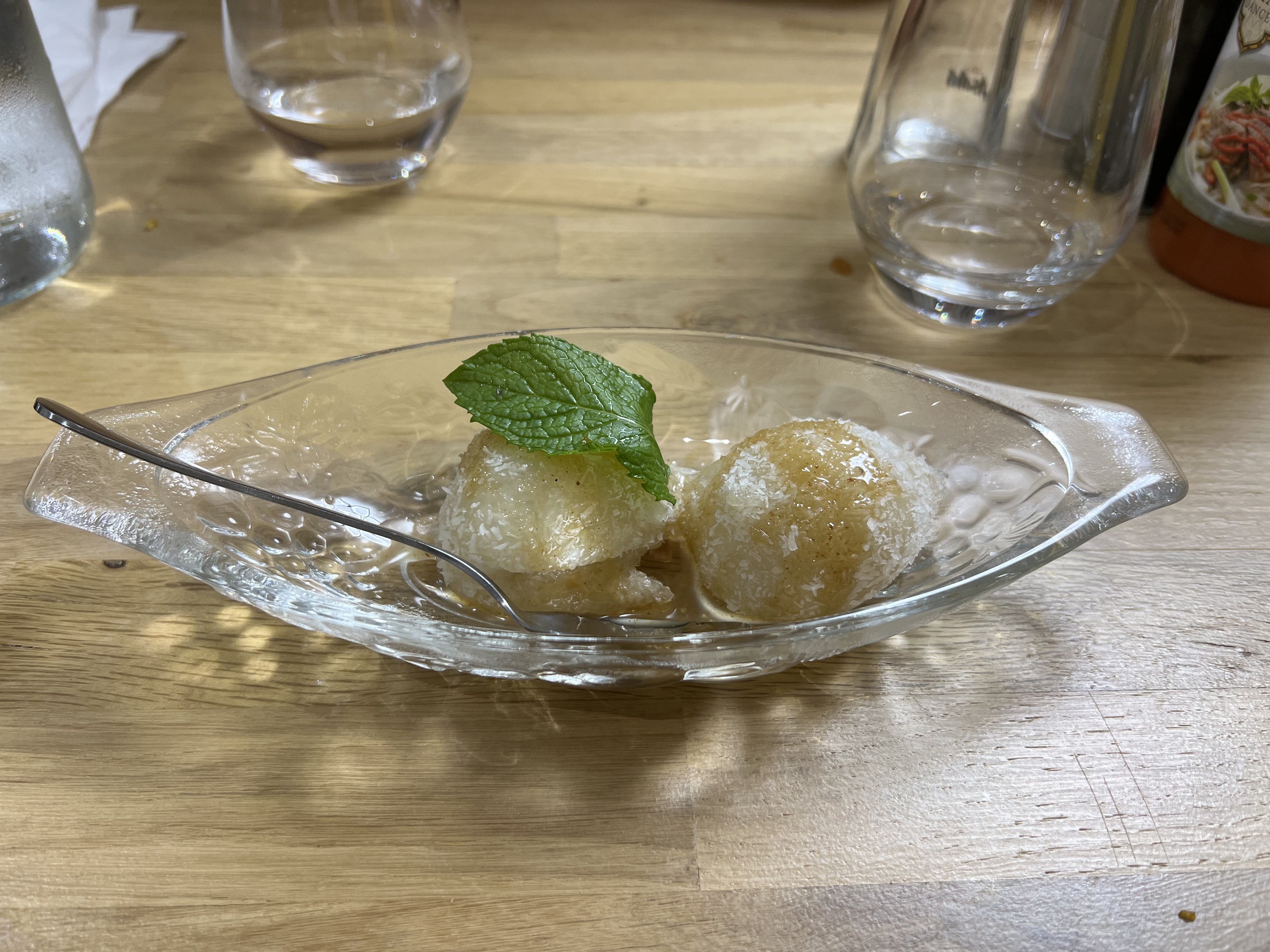 Déjeuner à 4 ce midi !!un délice, les nems,crevettes au poivre,le plat du jour boeuf mijoté,une tuerie et les perles coco sauce caramel cacahuètes 😋. Sans compter l'accueil et la gentillesse de cette famille.Nous recommandons vivement 😊