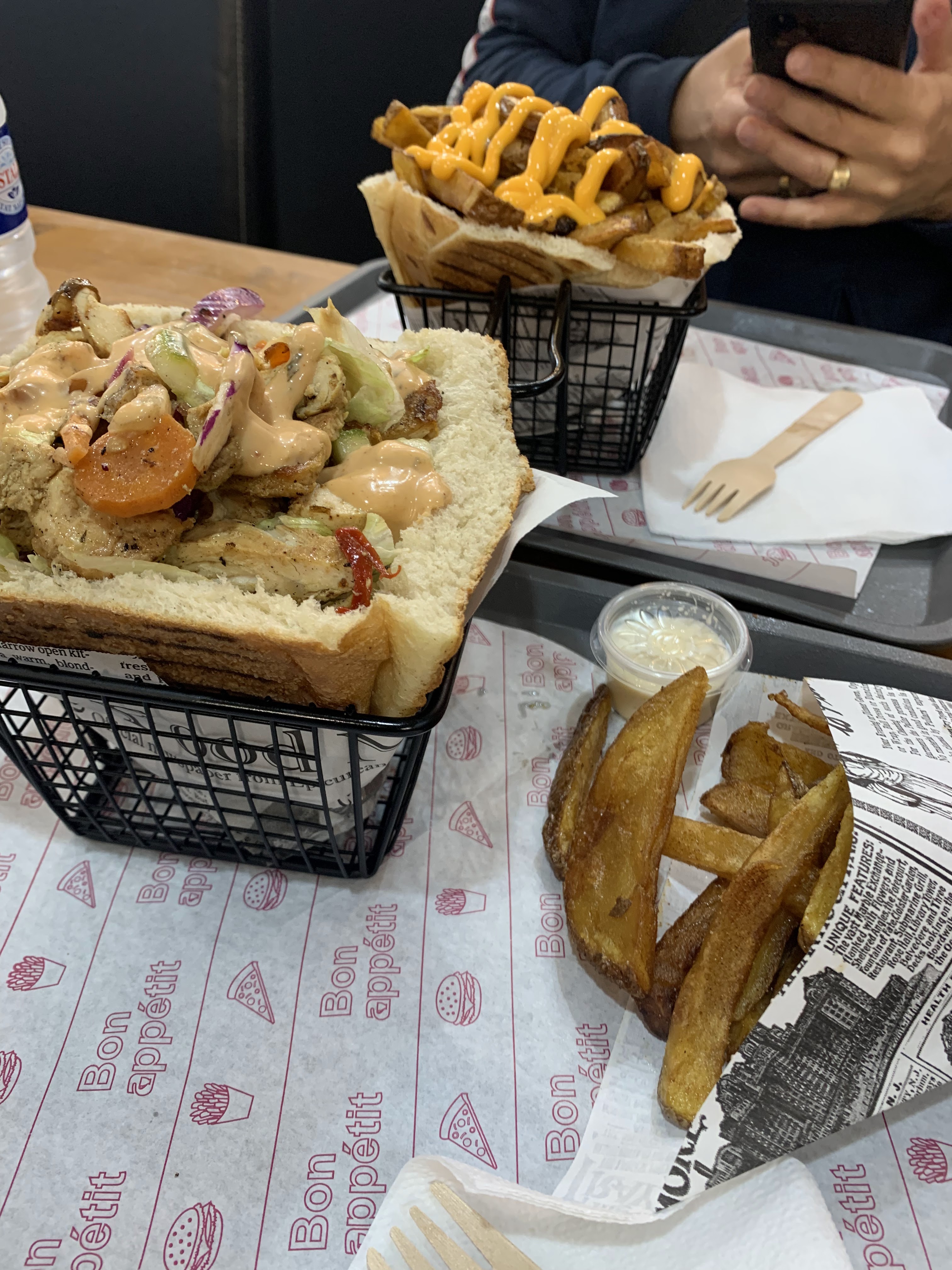 Des frites trempées à cause de la chaleur dans l’emballage… J’en ai mangé une seule qui m’a suffit à savoir que j’allais jeter ces frites. De plus, la (viande de kebab) est simplement du poulet … La taille des sauces est ridicule. Je ne recommande pas, c’est la première et dernière fois que je viens