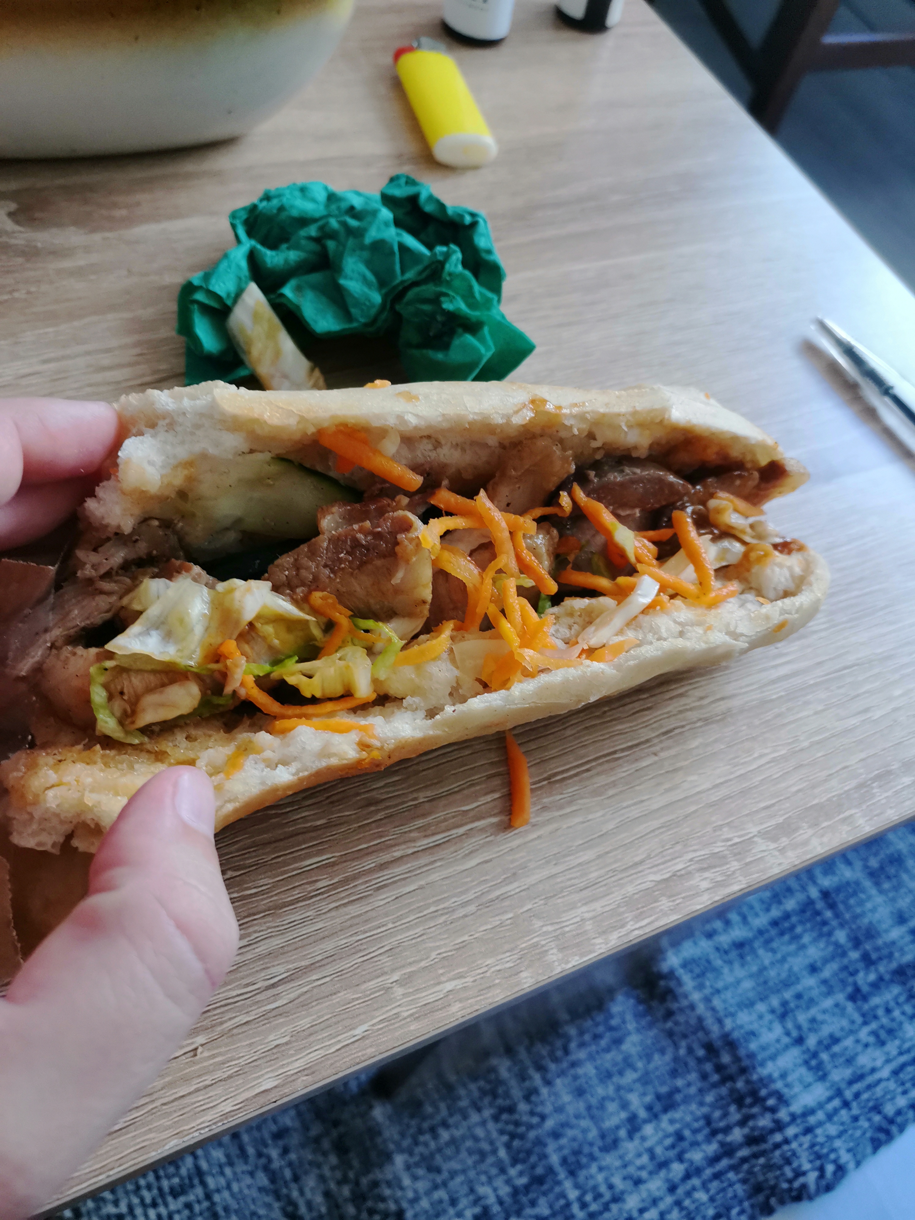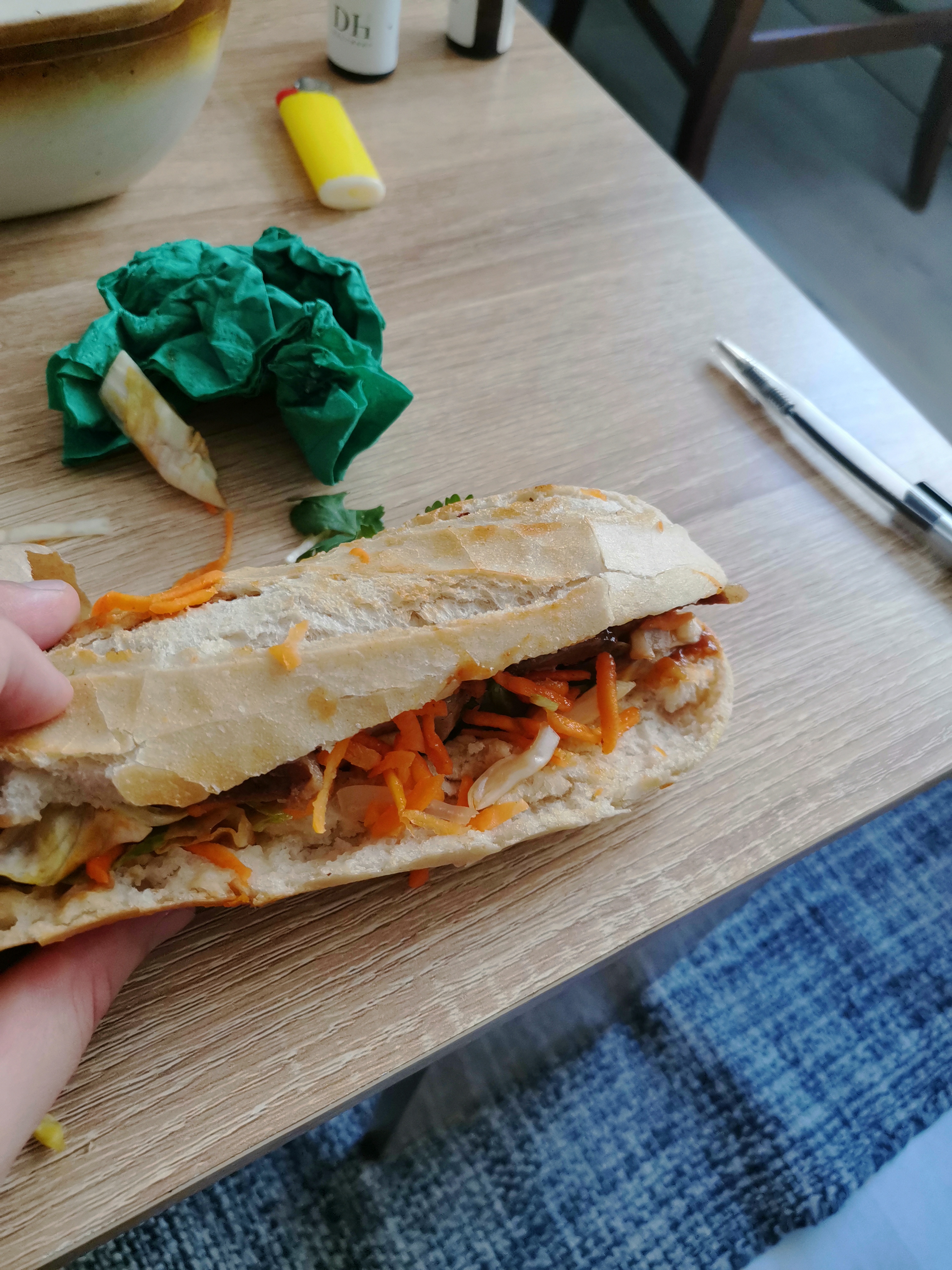 Je viens de prendre un sandwich Bahn mi et c'était une catastrophe. La recette faisait envie. J'ai attendu 15 min pour un sandwich fait dans un pain surgelé. Le pain surgelé ça se reconnaît car ça a une texture pas cuite. Les 15 min étaient sûrement dû à sa décongélation. Le porc quant à lui n'était pas bon car que des morceaux de gras qu'on ne peut pas mâcher, j'ai abandonné au bout de quelques crocs. Je n'ai mangé que les légumes sur le dessus et le reste poubelle. Le pire Bahn mi de ma vie.