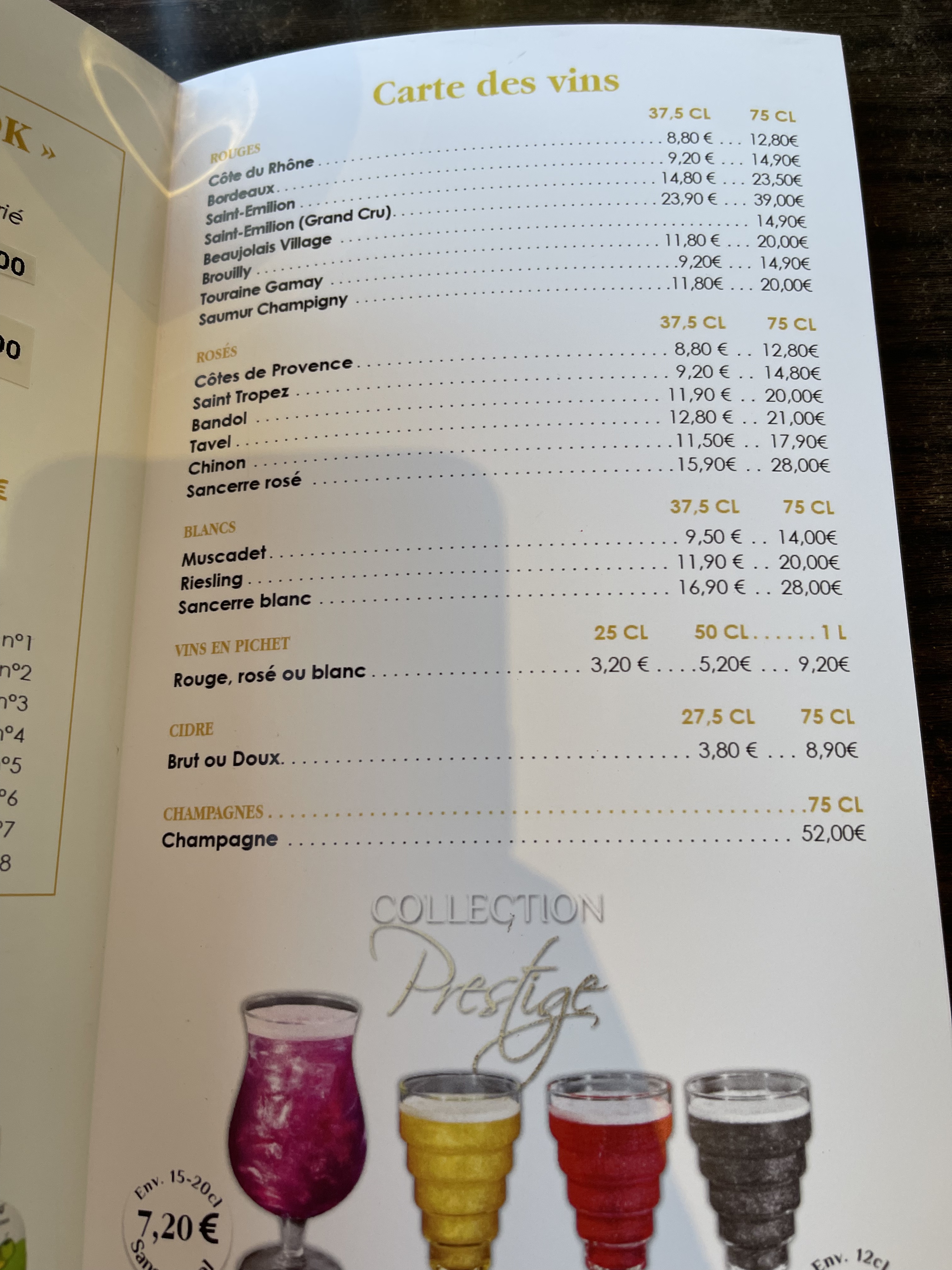 Plat chaud pas chaud. Dessert tiède. Viande de boeuf dure. Mousse au chocolat affreuse. Pichet vin blanc aigre. Je ne conseille pas