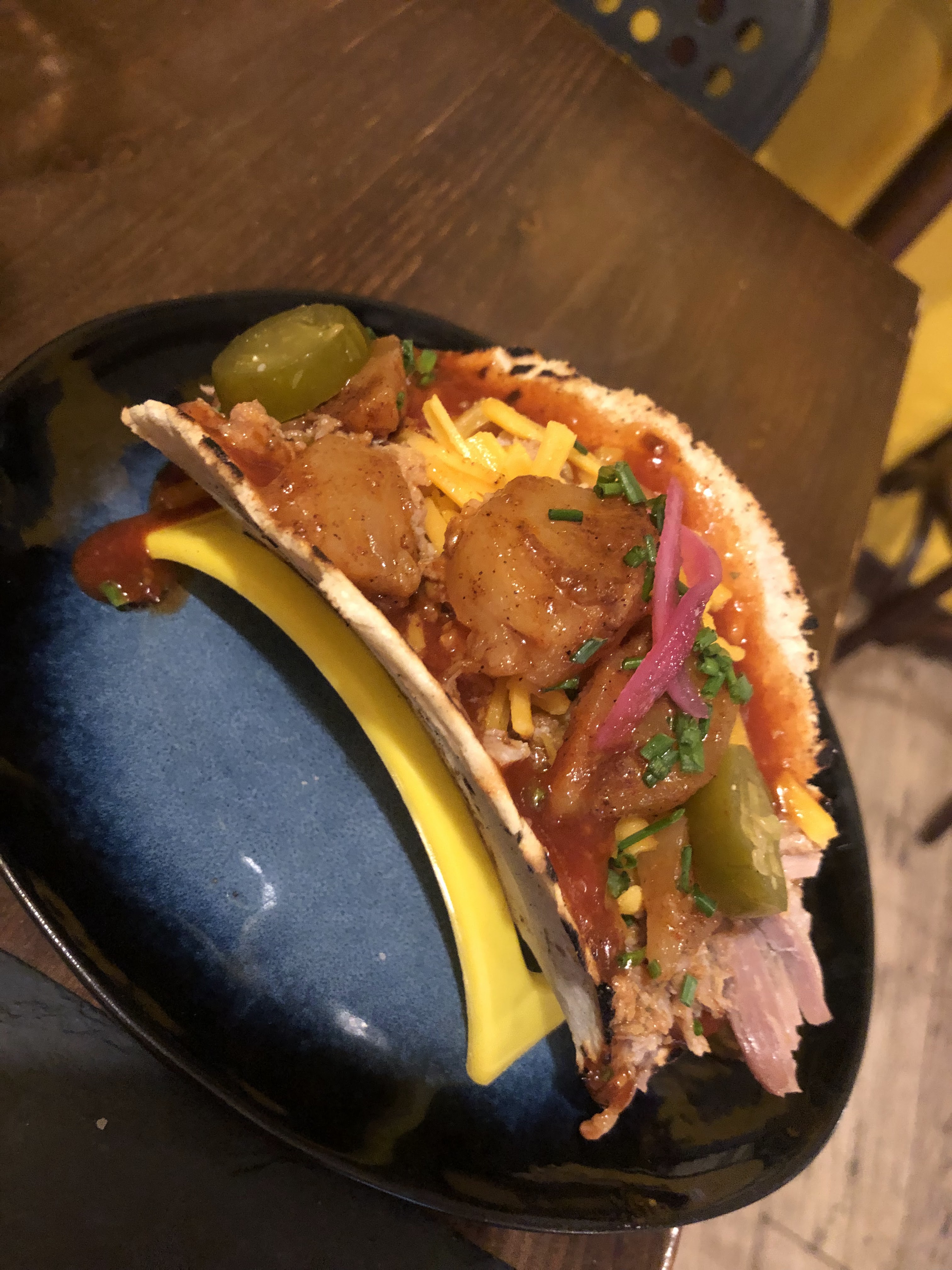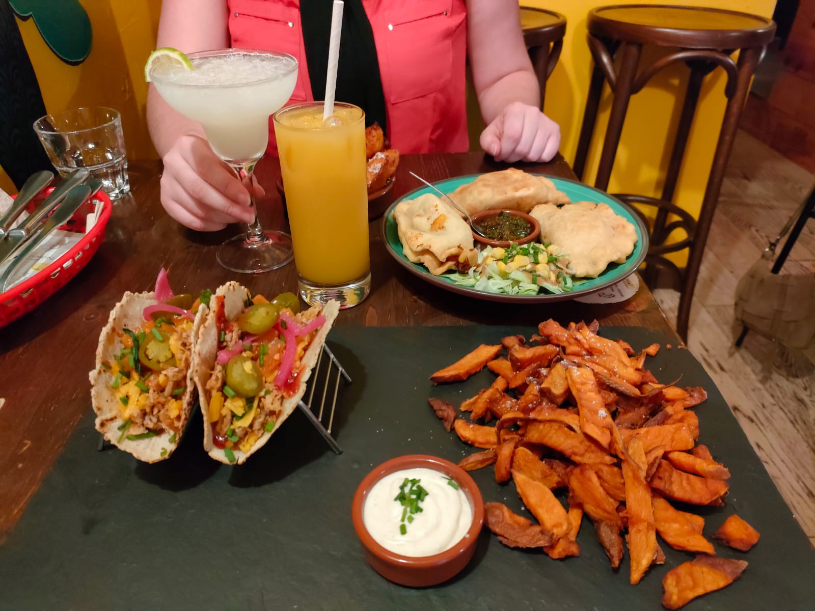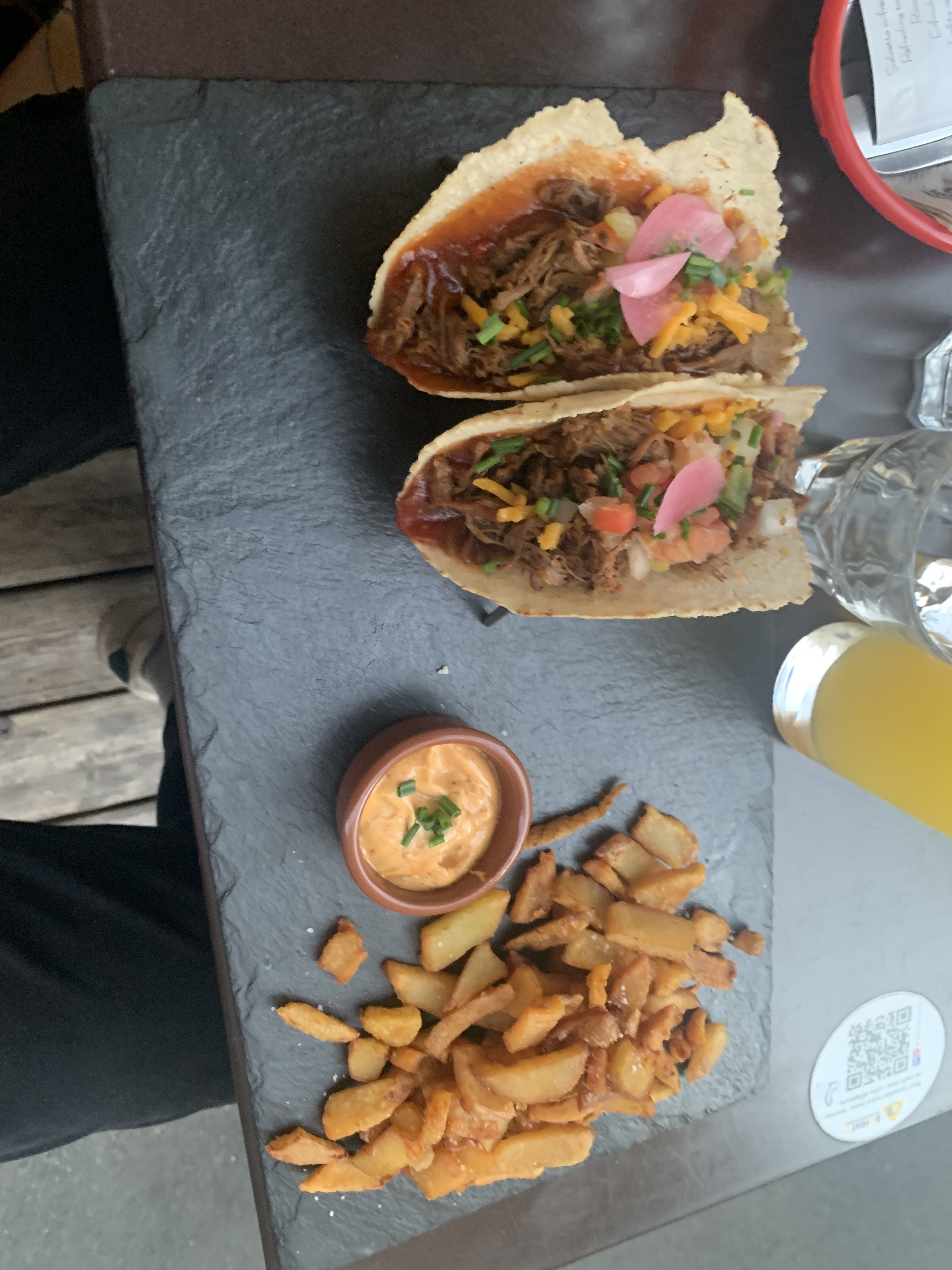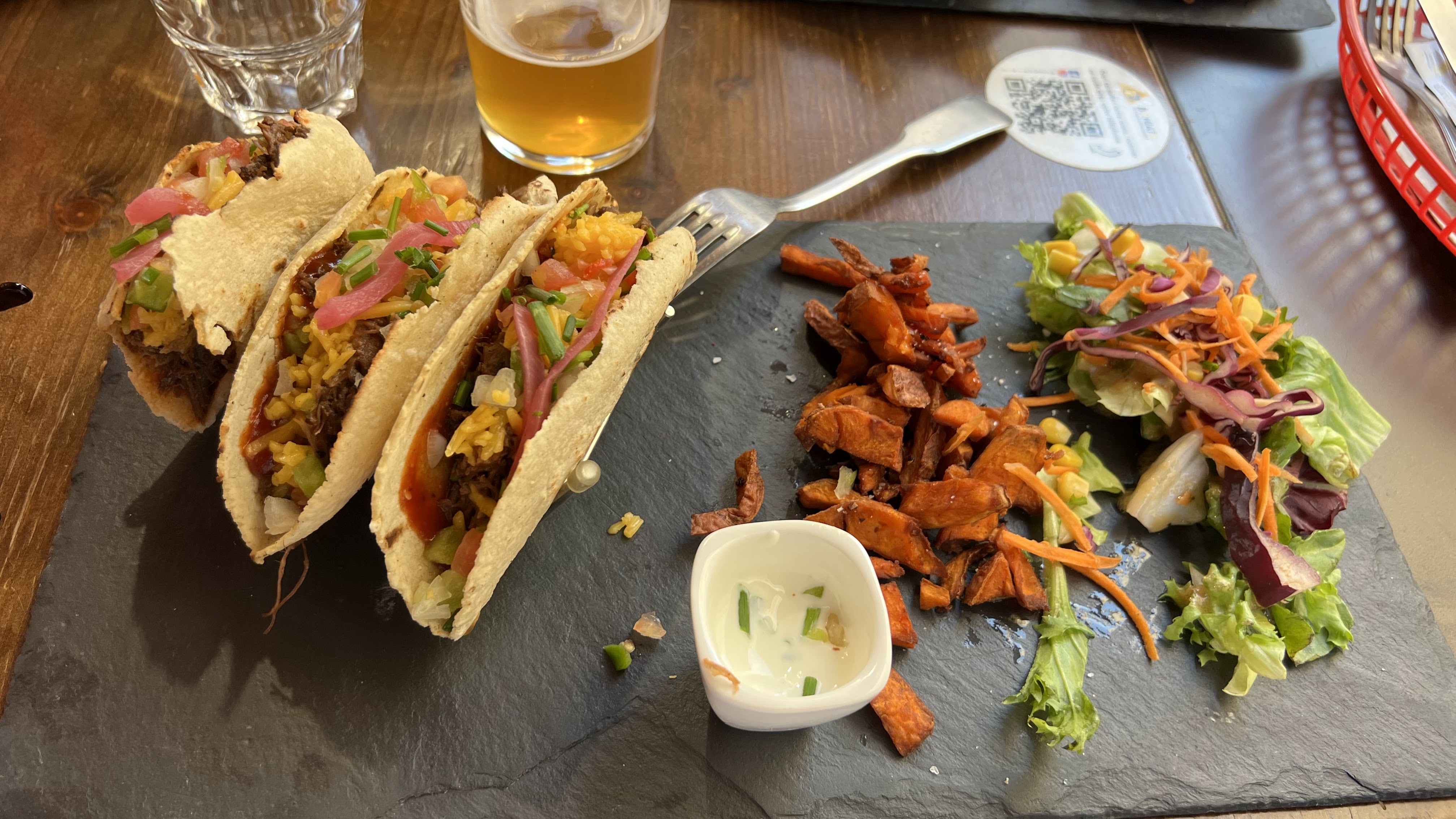 Les tacos sont indéniablement les pieces phares de ce restaurant. Nous avons pu goûter les tacos du moment abec du pulled pork, ananas, pockles et sauce relevée. Super combo Les frites de patates douces etaient parfaites. Les empanadas étaient assez lourdes et manquaient de saveurs par contre. Le cocktail margarita etait ok mais sans plus. Nous avons passé un beau moment et je retournerais bien dans ce restaurant pour tester de nouveaux tacos 🌮