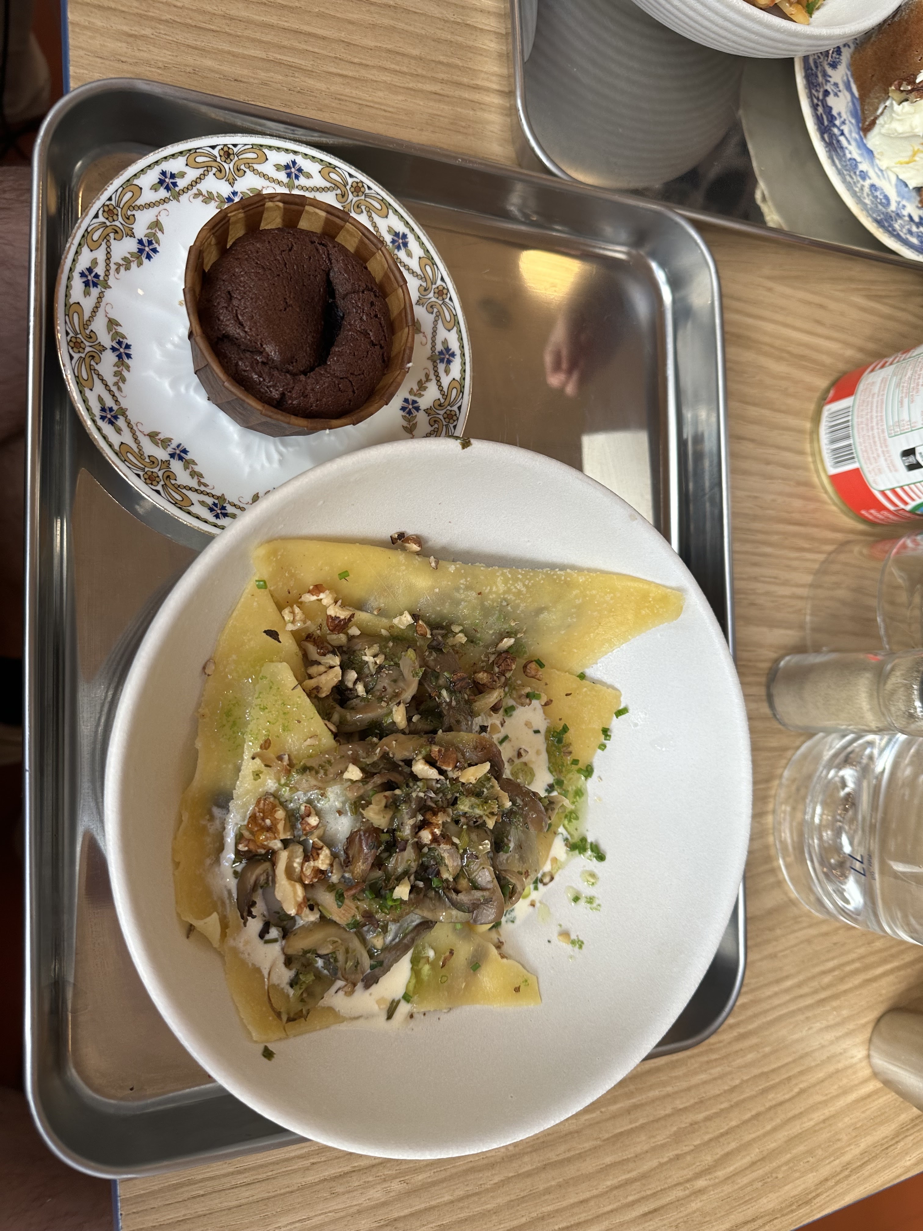 Des portions vraiment petites pour le prix, à revoir . Ravioles de champignons assez fades. Il manque un accompagnement Tranche de cake au citron coupée au centimètre prêt.