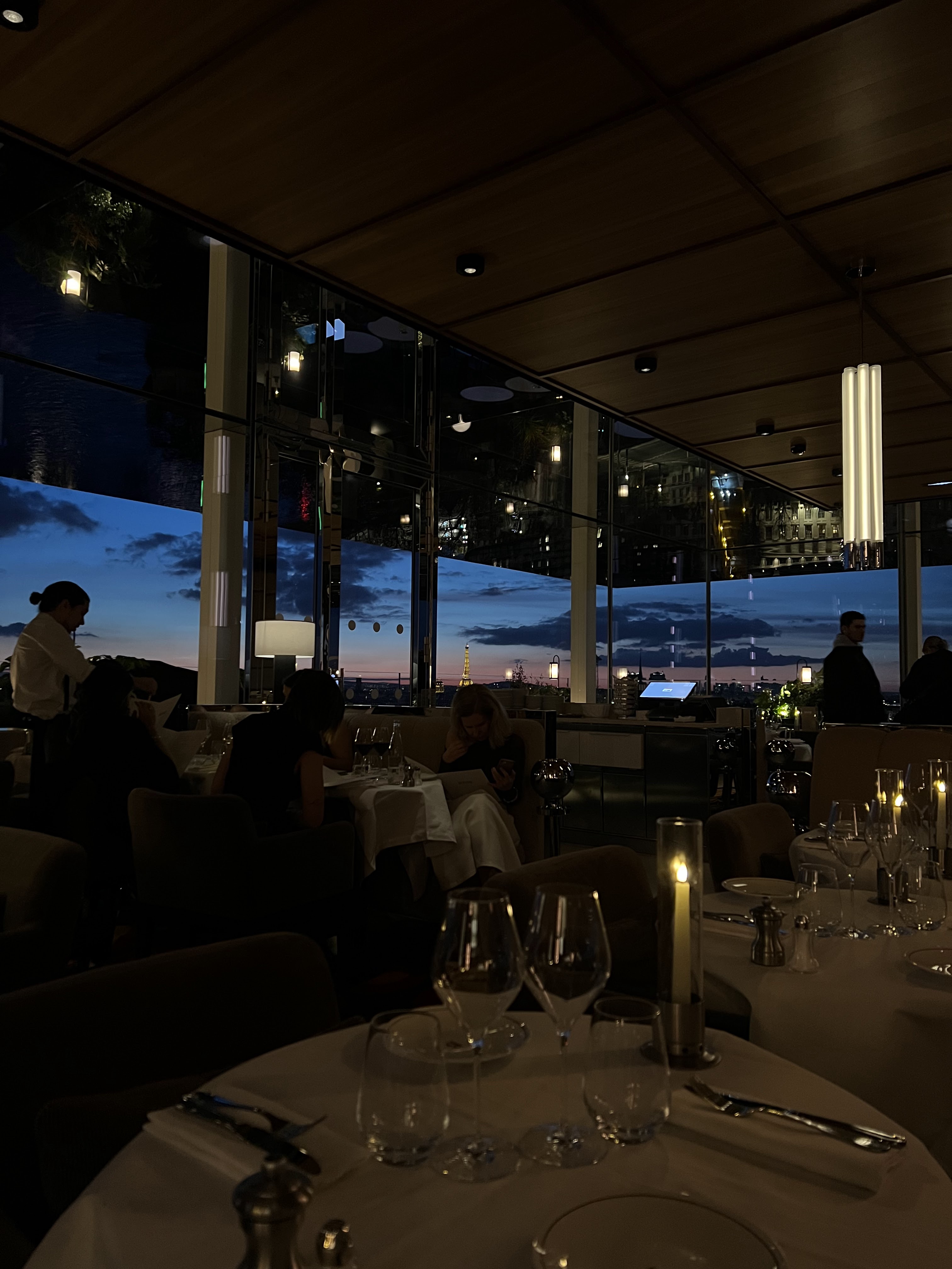 Très bon restaurant, vue imprenable sur Paris. Très beau cadre, musique très agréable bien qu’un tout petit peu forte. Le service est soigné et le personnel à l’écoute, très professionnel. Nous avons passé une très agréable soirée.