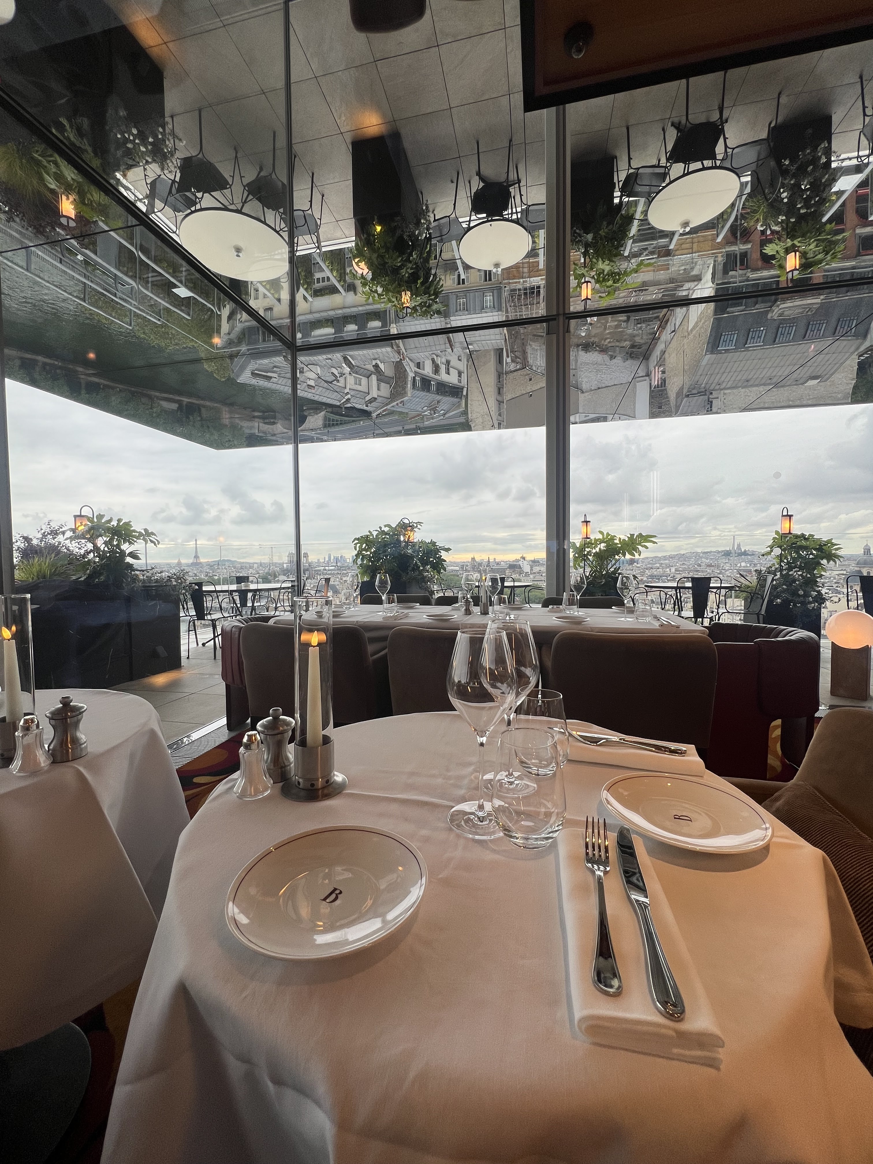 Super adresse. Nous avons profité d'une table avec vue sur tout Paris, dégusté d'excellents plats et le service était impeccable. Pour 3 entrées 4 plats et un dessert nous en avons eu pour moins de 100€ par personne, ce qui est une bonne surprise vu le cadre ! A noter les portions sont plutot généreuses, ce qui n'est pas souvent le cas dans ce type d'établissement. Les créneaux sont de 2 heures par service ce qui est raisonnable. Si vous voulez prolo gez l'expérience (ou que vous êtes en avance), n'hésitez pas à monter d'un étage : il y'a le bar avec vue sur le nord de Paris qui est très sympa aussi.