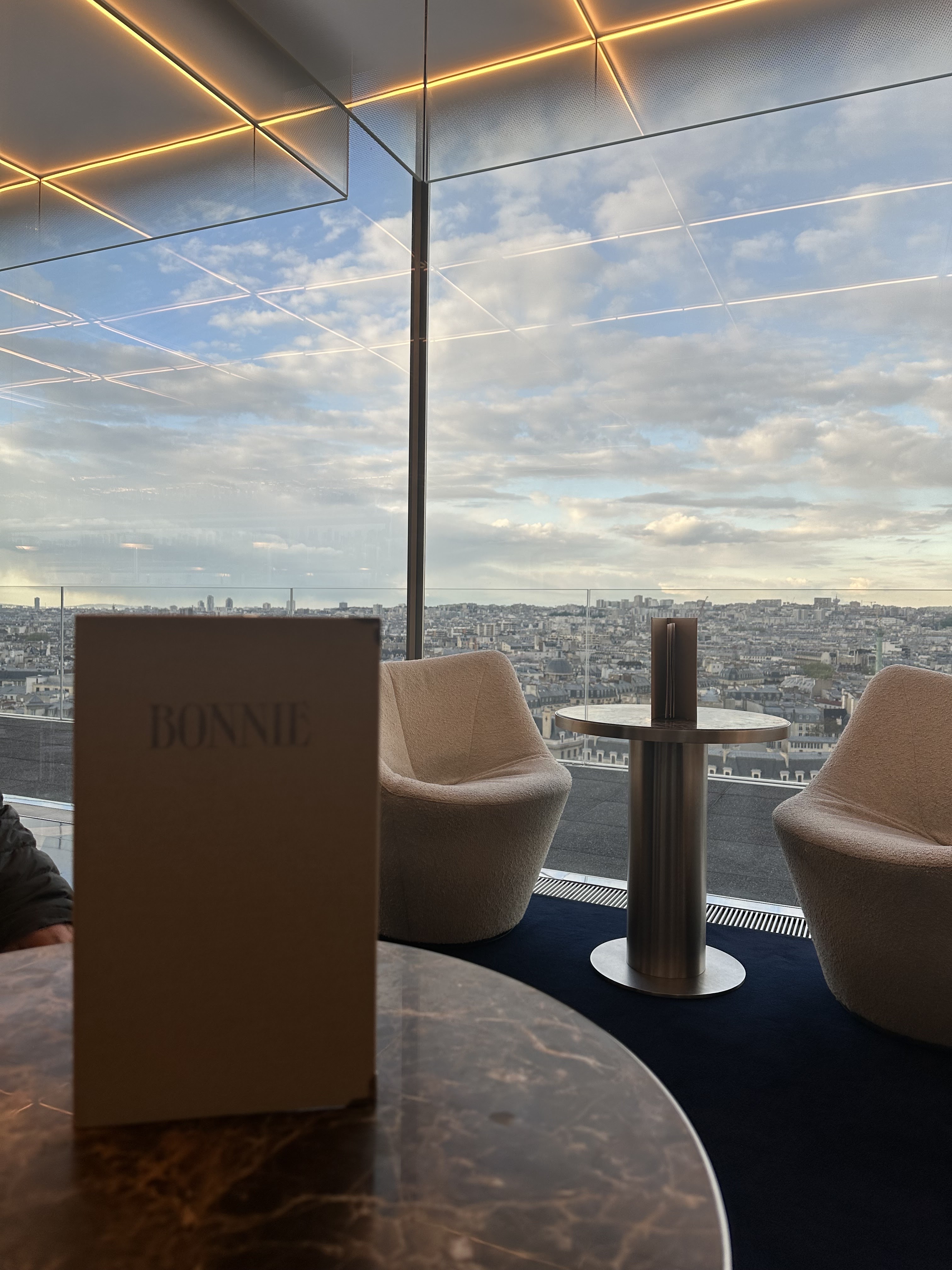 Bonnie semble être le repaire à influencers, on n’y vient pas pour sa cuisine mais plutôt pour la vue et pour dire « j’y étais ». L’ascenseur à ambiance ibiza vous propulsera dans une atmosphère feutrée et superficielle. La nourriture était plutôt bonne mais chère et en maigres quantités : l’entrecôte à 52€ ressemblait plus à un timide pavé de bœuf (ah et les frites étaient trop cuites). J’ai juste aimé le dessert, le snickers glacé maison. En somme, le niveau de la cuisine ne dépasse même pas celui d’un bon bistrot. Quant au service, il était hautain, froid mais tout de même efficace. Bref une expérience à demi-teinte, allez-y si vous avez de l’argent à dépenser.