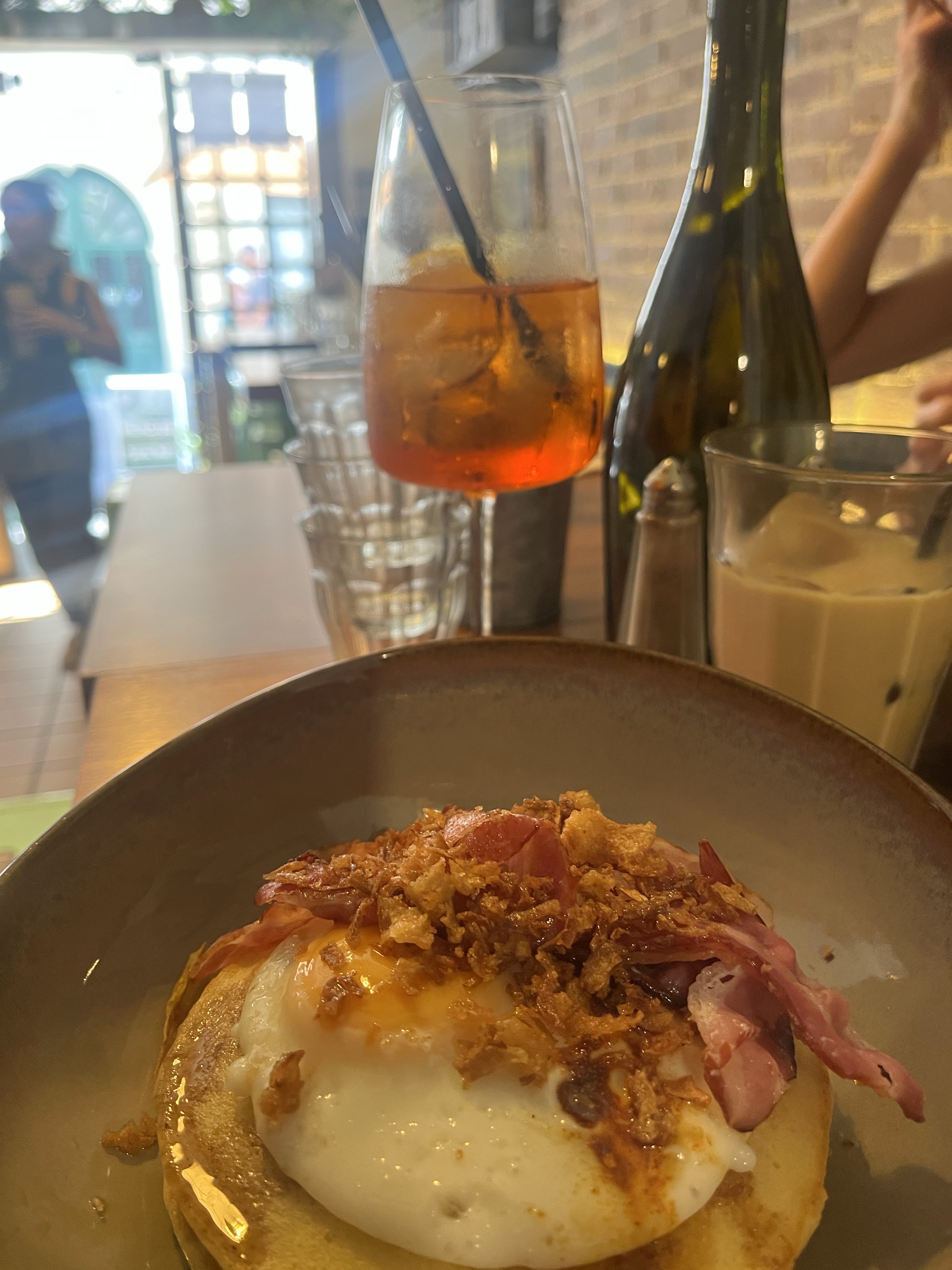 Endroit sympathique et très mignon, les serveurs sont très aimables. Attention à l’attente qui peut-être long dehors mais forcément quand c’est bon c’est prisé ! On a testé 2 sortes de pancakes « sweet stack » et « se*y stack » top, les œufs avec le porc « egg benny » top, un peu moins bien sur le « mi*f» autant le saumon fumé est généreux en quantité autant le plat en lui même reste trop centré sur la focaccia et donc un peu décevant (a mon goût). Le global est très bon, un petit peu cher mais produits de qualité donc normal. Nous reviendrons sans hésiter !