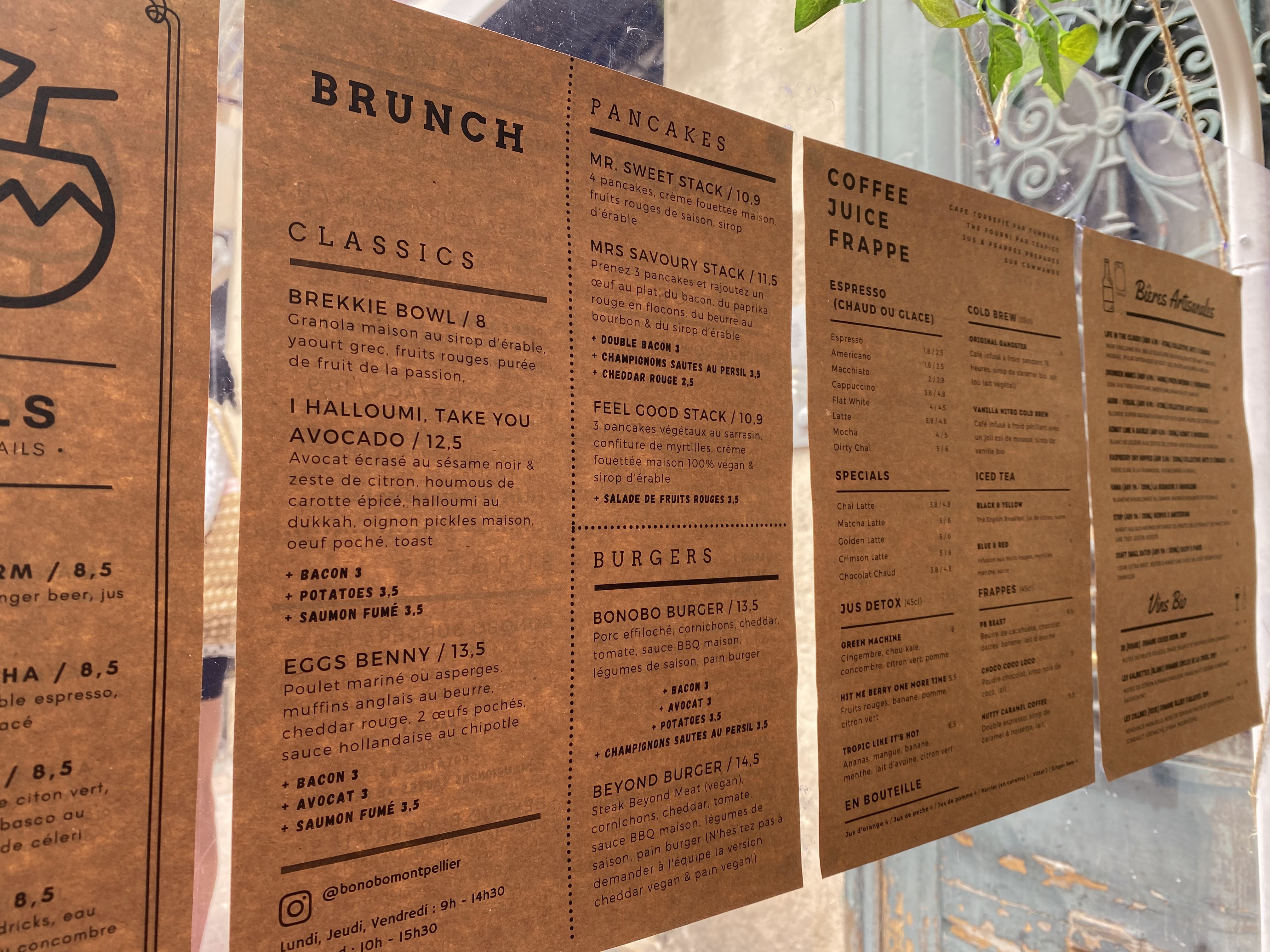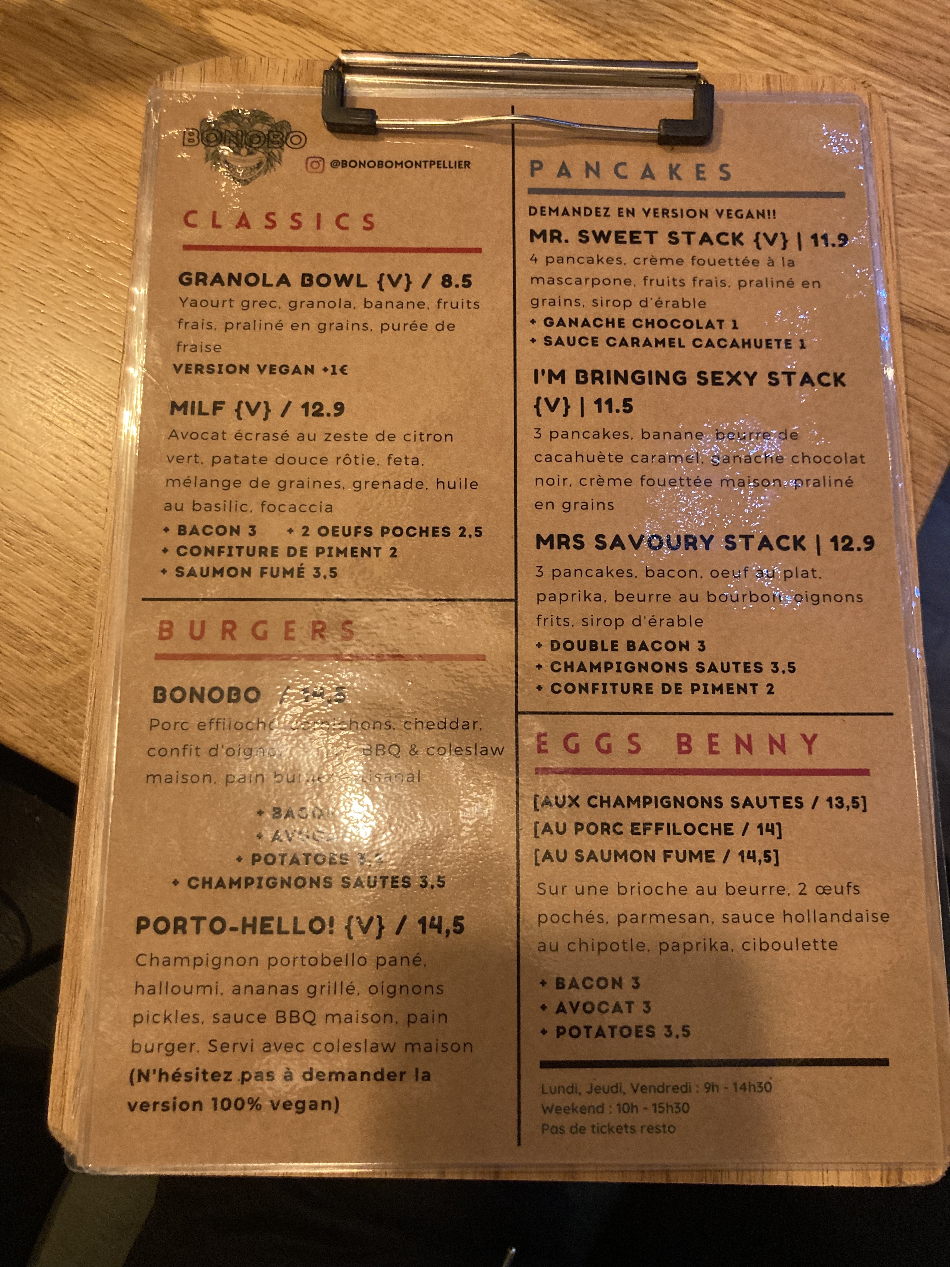 De passage à Montpellier, cette petite session brunch au Bonobo a été franchement à la hauteur ! Bon, il faut faire une sacrée queue comme dans tous les brunch branchés des grandes villes, et les prix sont bien sincères mais en vrai, c'est super bon, ultra généreux, si bien qu'on ressort enceint de 9 mois de triplés pancakes. Côté salé, ce n'était pas le meilleur que j'ai testé, mais leur pancakes sucrés ont tout dégommé. De nouveau à Montpellier, j'y repasserai si j'ai l'occasion.