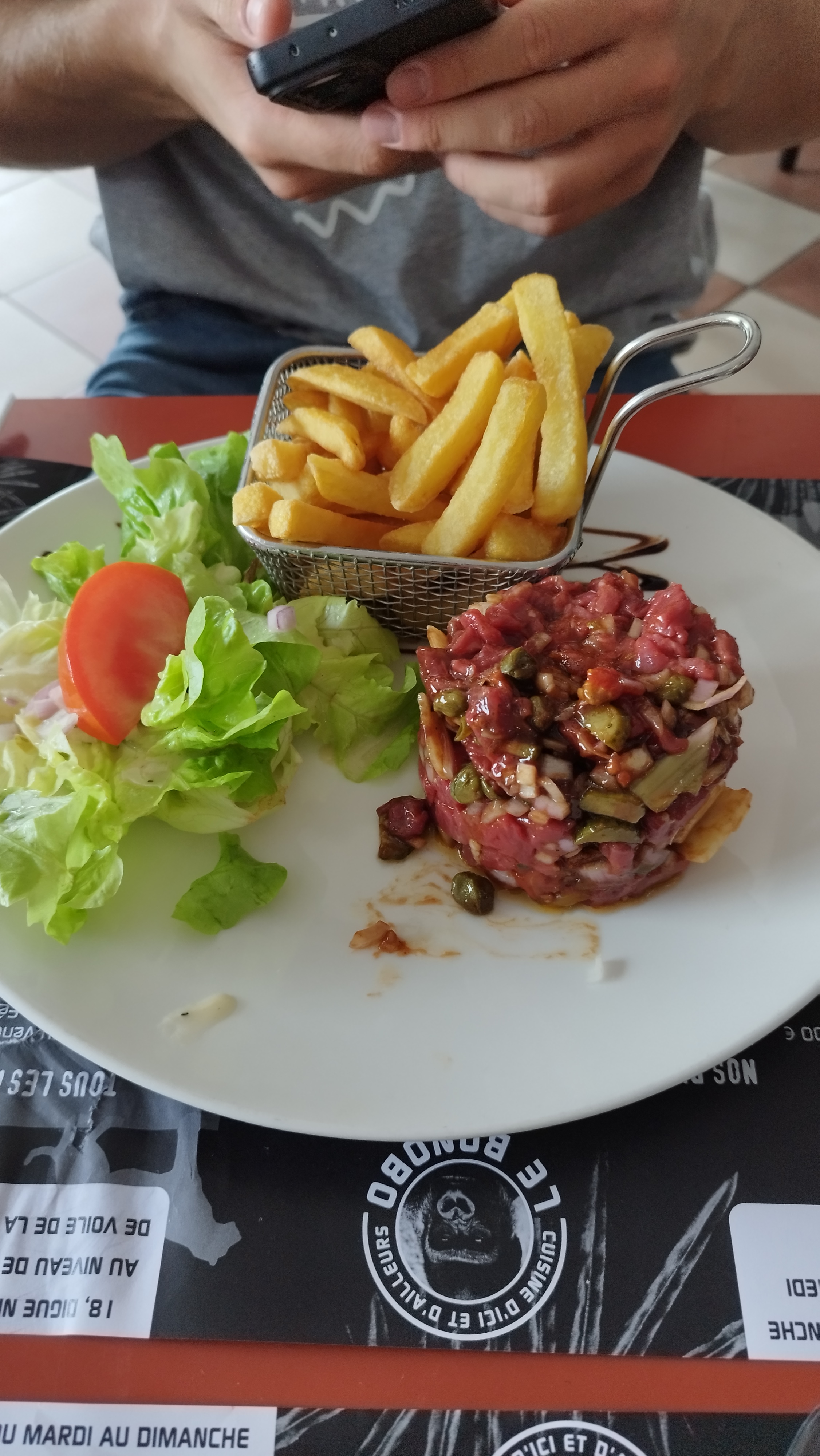 Très bon accueil mais je ne vous conseille pas le tartare : plus d'échalotes que de viande, et celle-ci n'est pas hachée mais en petits morceaux Le bourguignon à 14 € était bon Trop cher rapport qualité prix Par contre vue splendide sur la mer