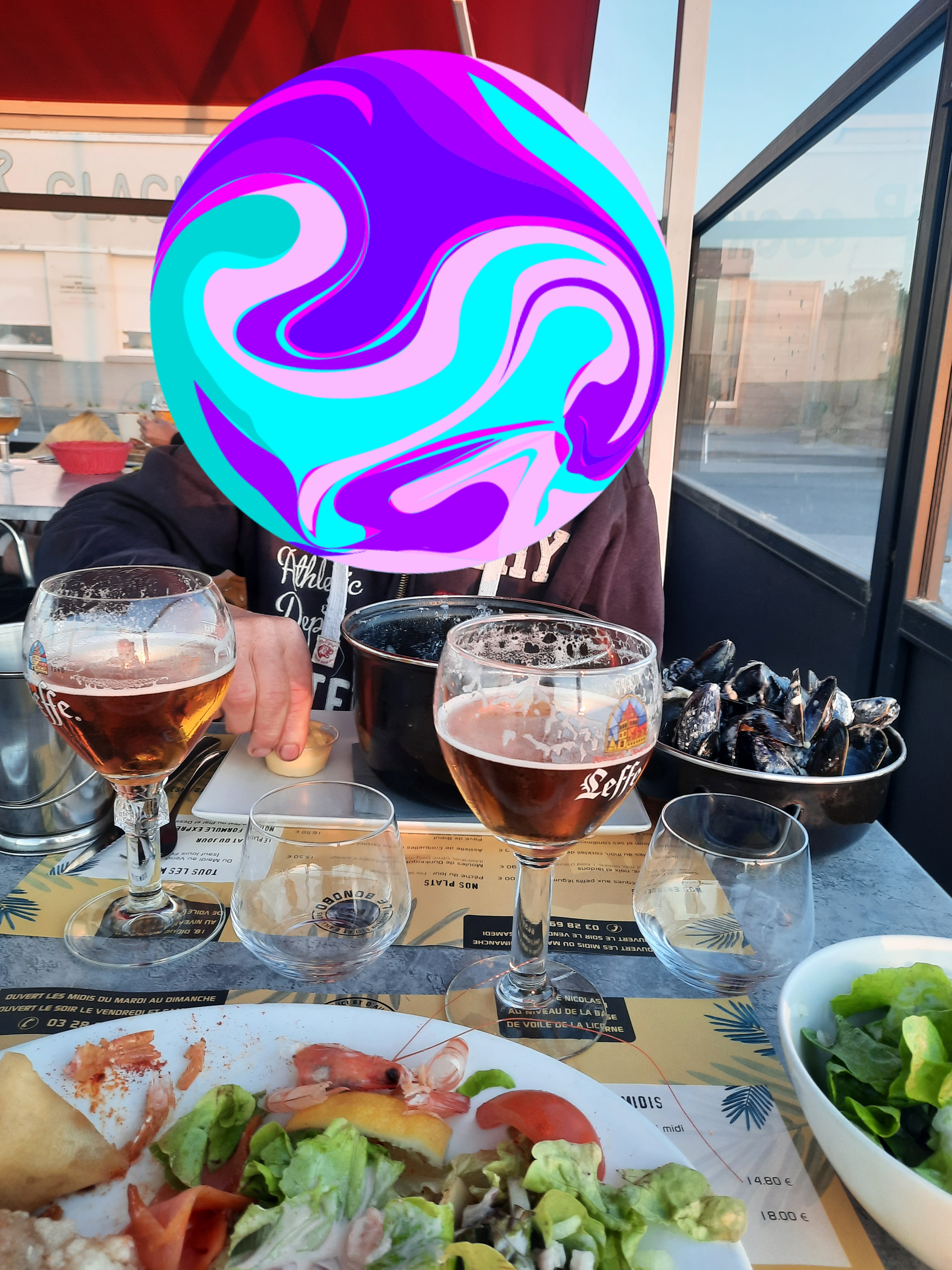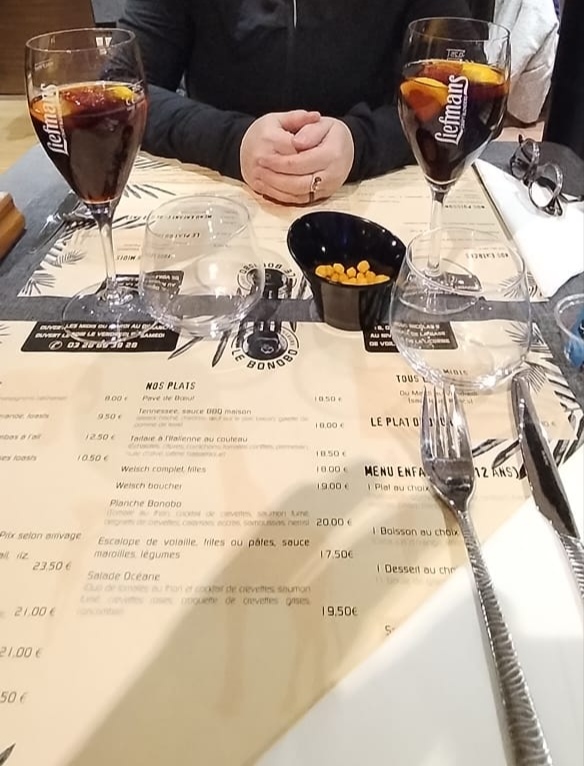 Pour mon mari : très bon picon. Bonne paëlla (faite maison ?🤔) Les quantités sont généreuses. Café gourmand bien sauf le fondant au chocolat qui était très dur !! Salle un peu trop bruyante mais bon.... On ne peut pas empêcher l'incivilité de certaines personnes. De mon côté : cocktail Sunrise très bon et rafraîchissant - l'assiette Bonobo très copieuse(trop ?🤔). - macaron caramel, bon mais dur. Les produits sont-ils faits maison ?Salle qui aurait besoin d'un climatiseur ; beaucoup trop chaud.